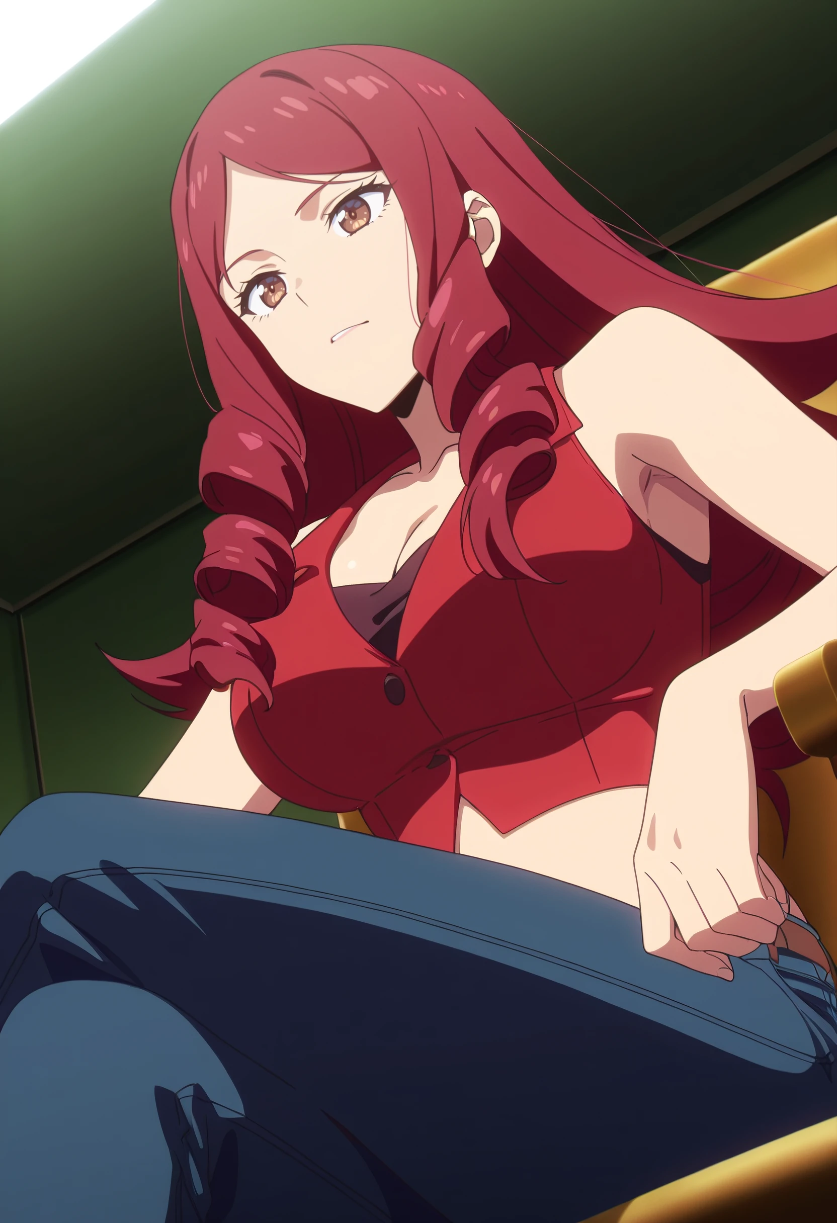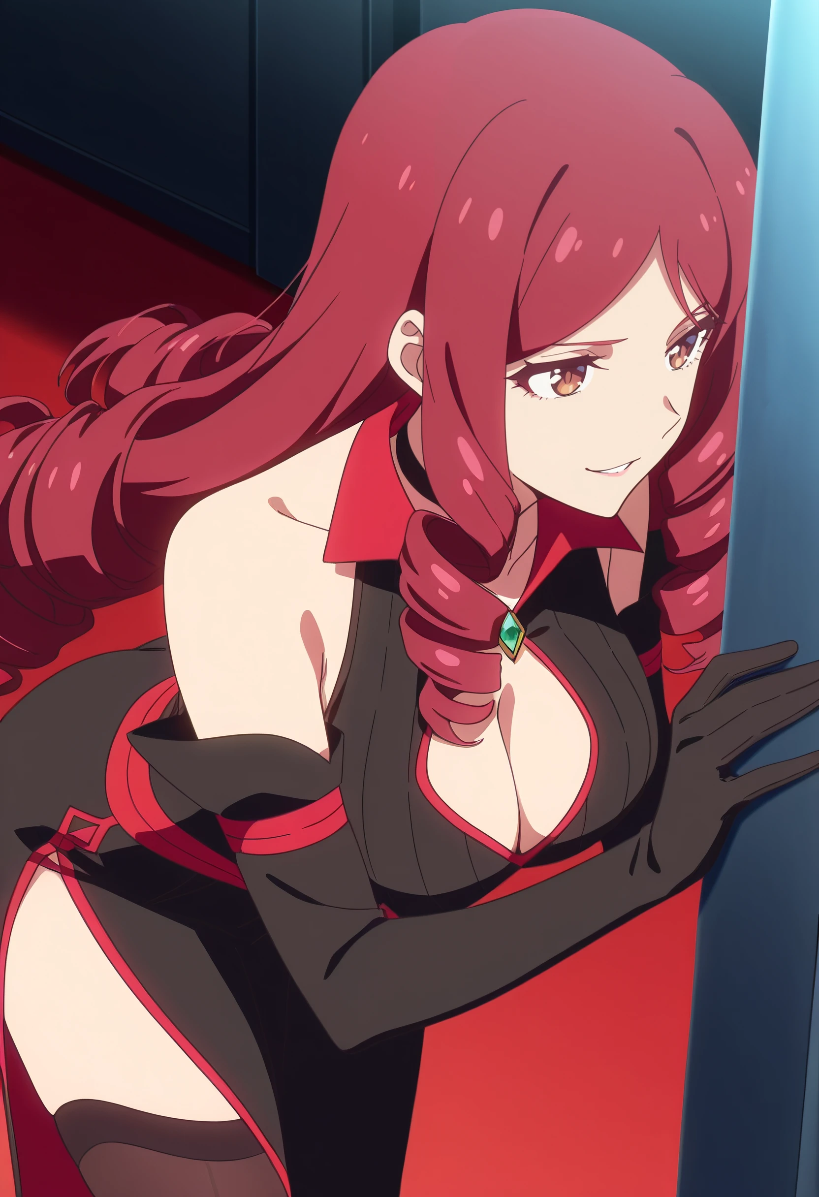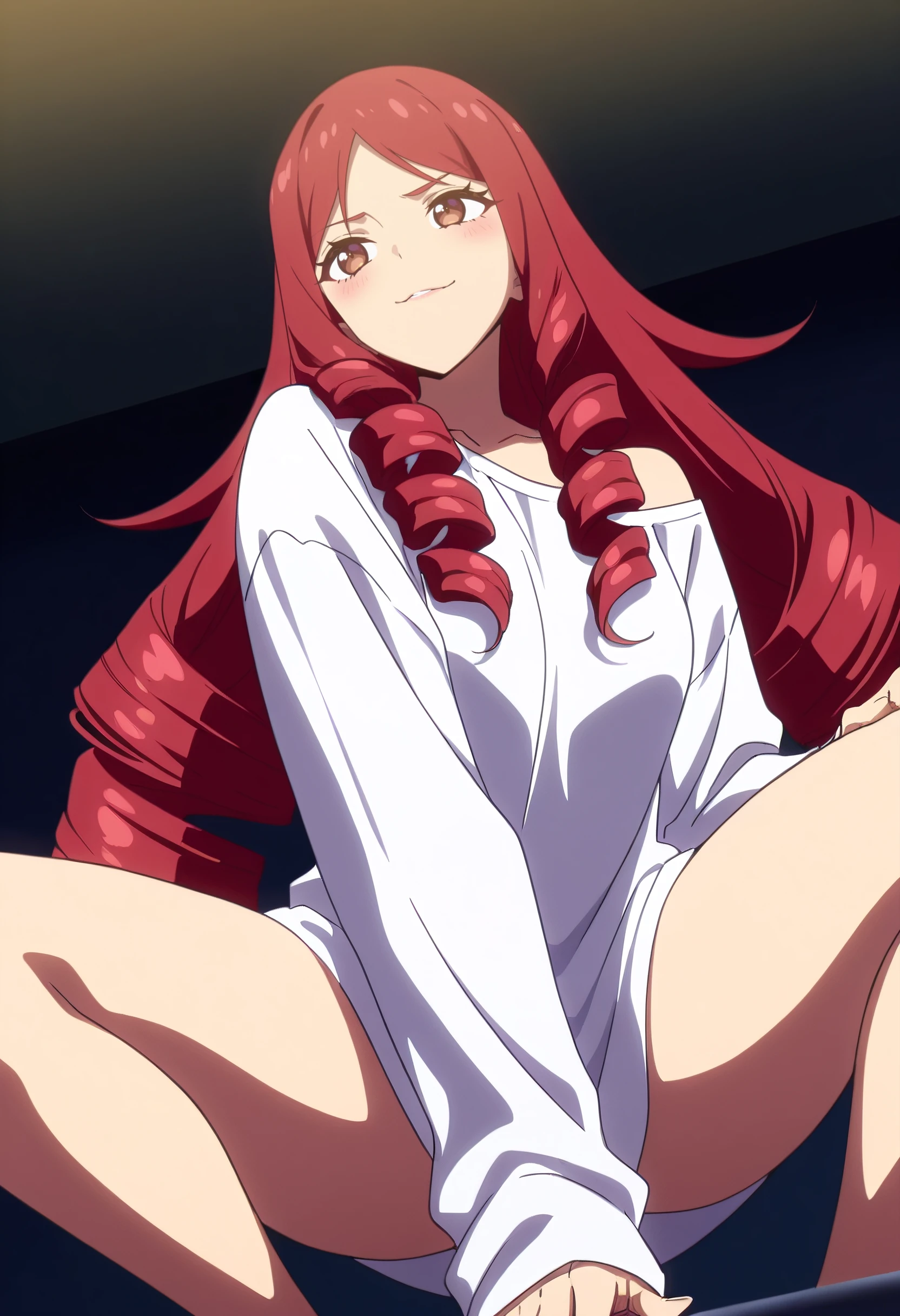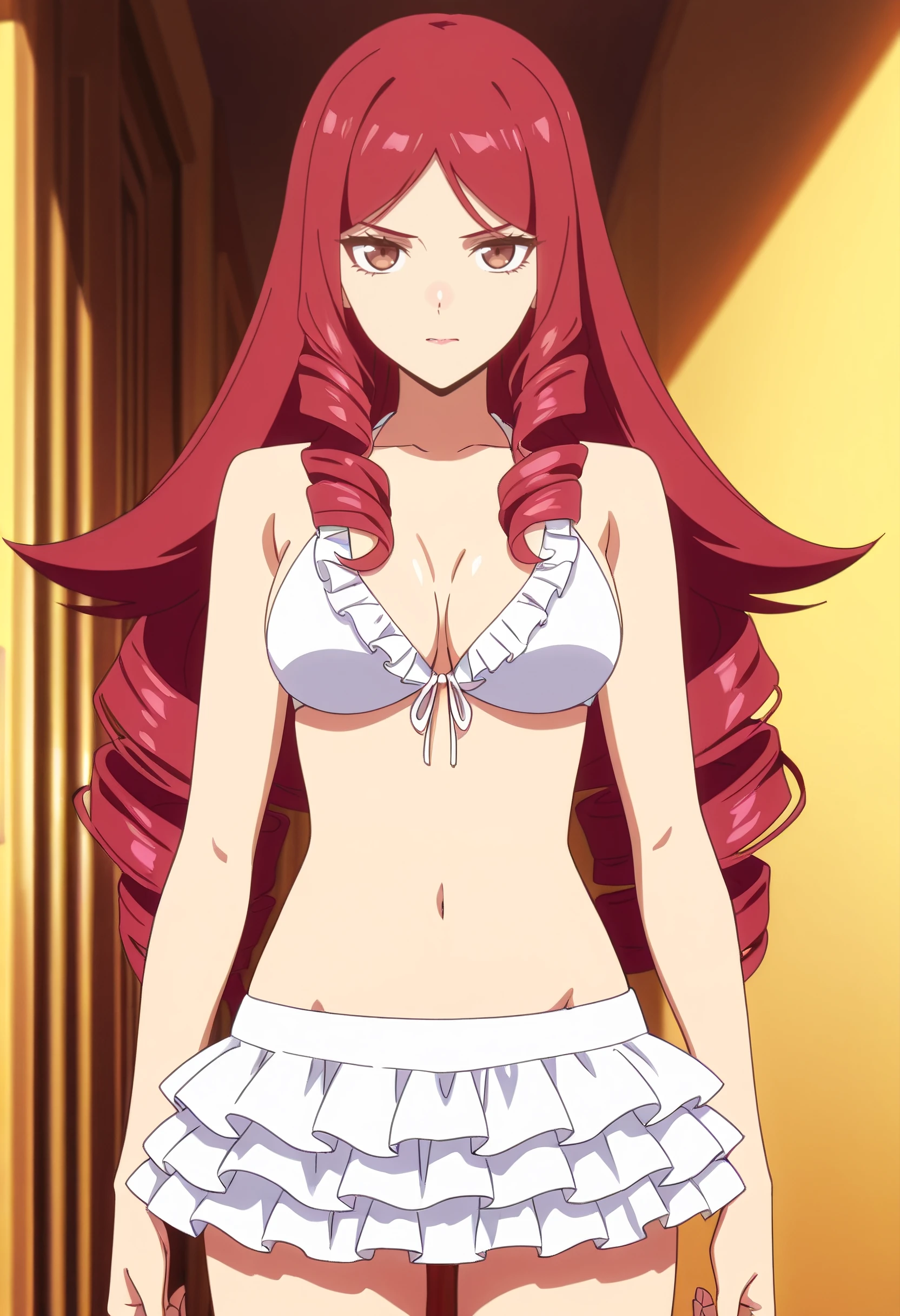 TDLJiangLiuyue, long hair, red hair, brown eyes, bangs, drill hair, hair over shoulder, twin drills,