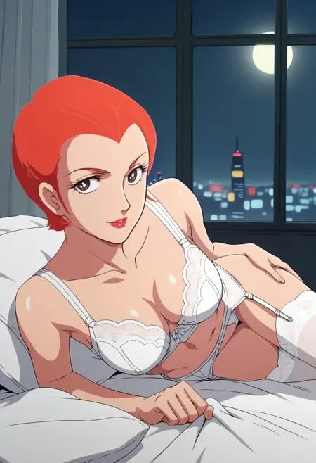 FGMatildaAdjan, brown eyes, short hair, hair slicked back, orange hair, lipstick, breasts,