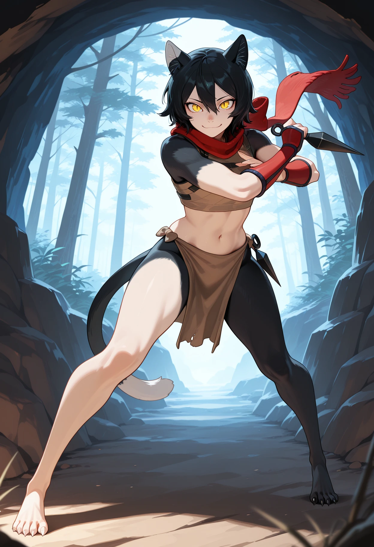 izutsumi, cat girl, short black hair, yellow eyes, slit pupils, furry female, black body fur, sharp toenails, brown crop top, loincloth, red scarf,