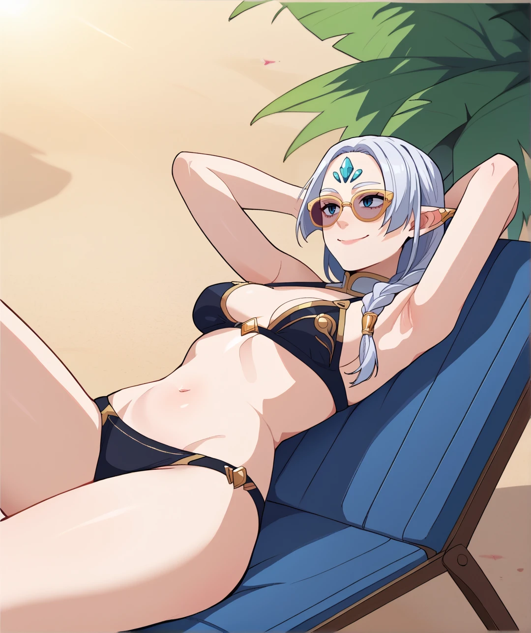 1girl, soldrake, pointy ears, long hair, braid, white hair, forehead jewel, single braid, blue eyes,medium breasts, braided ponytail, hair tubes, blue hair, facial mark, forehead mark,