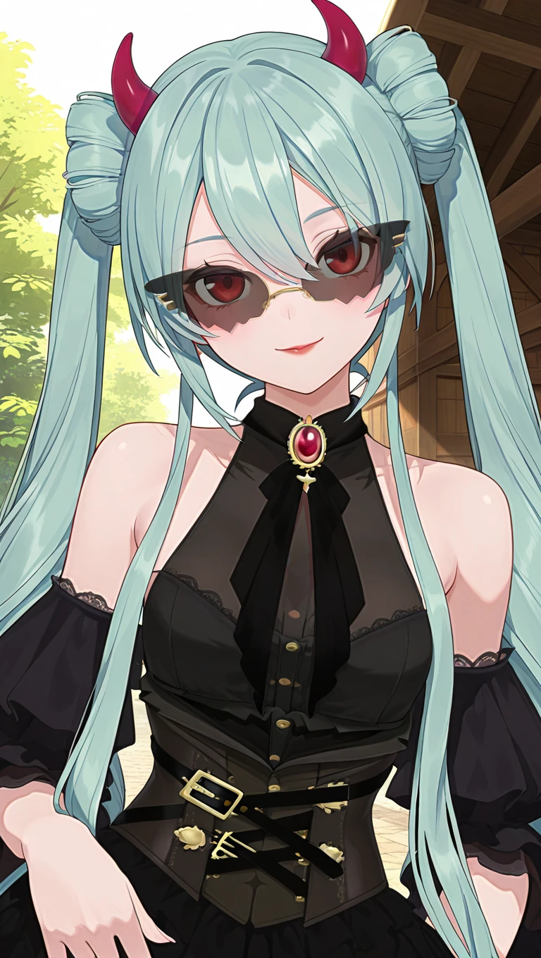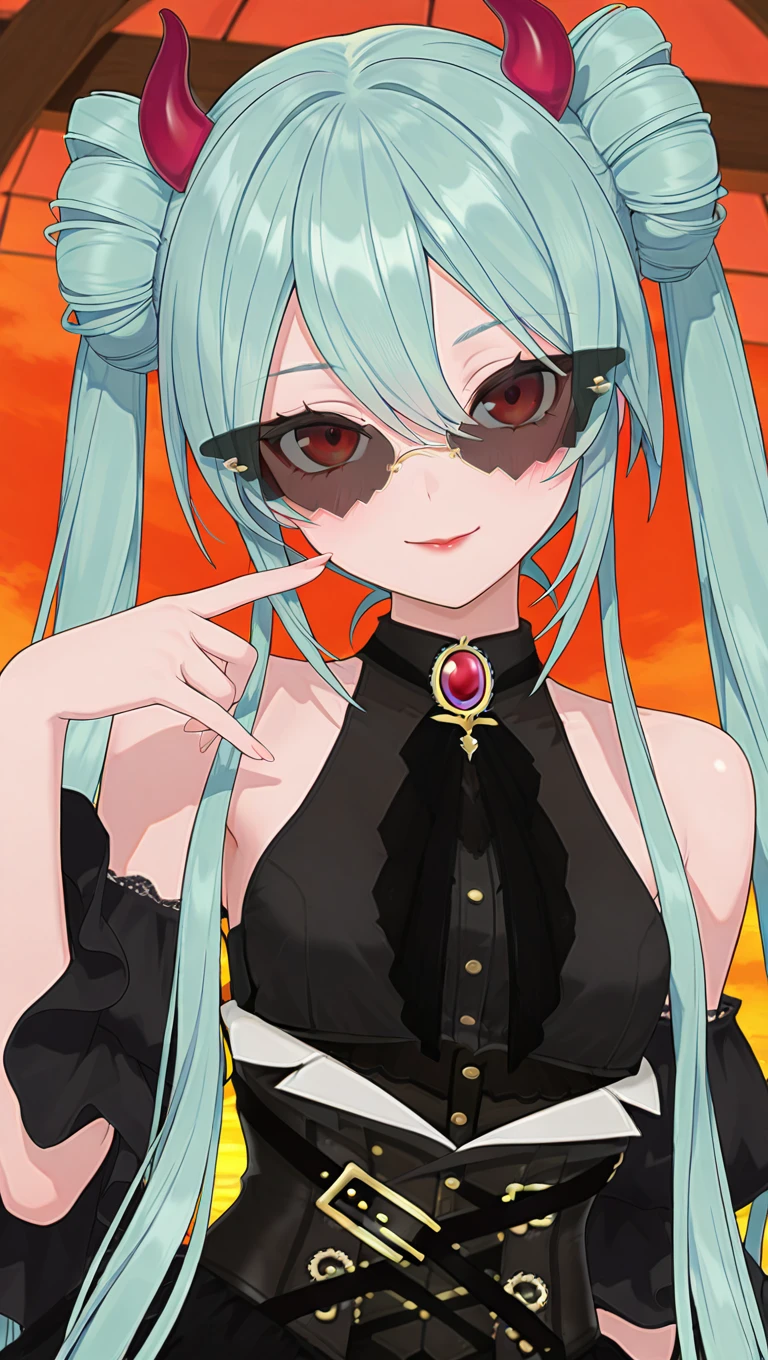 red horns,very long hair,aqua hair,twintails,drill hair,sidelocks,hair between eyes,sunglasses,red eyes,red lips