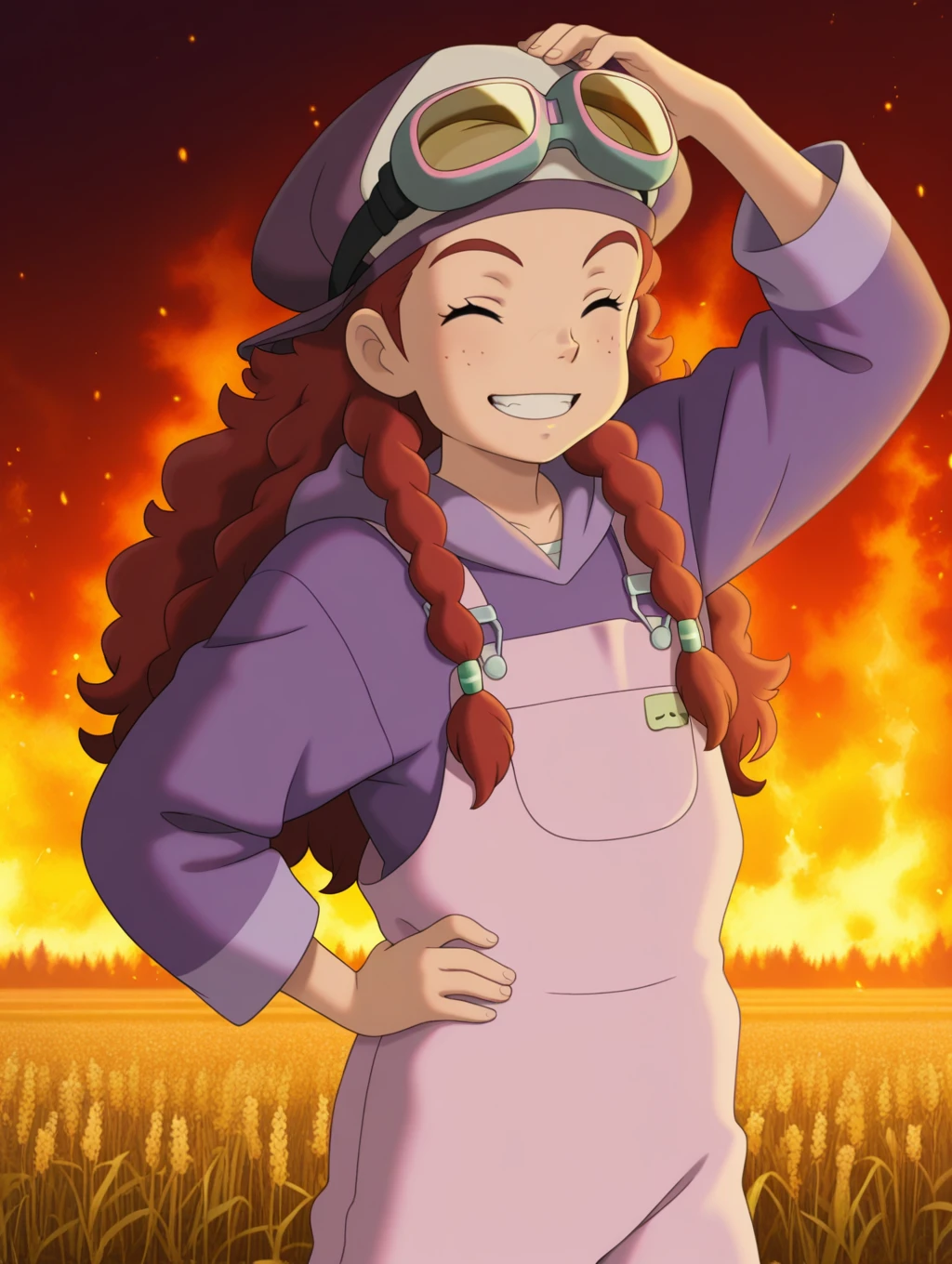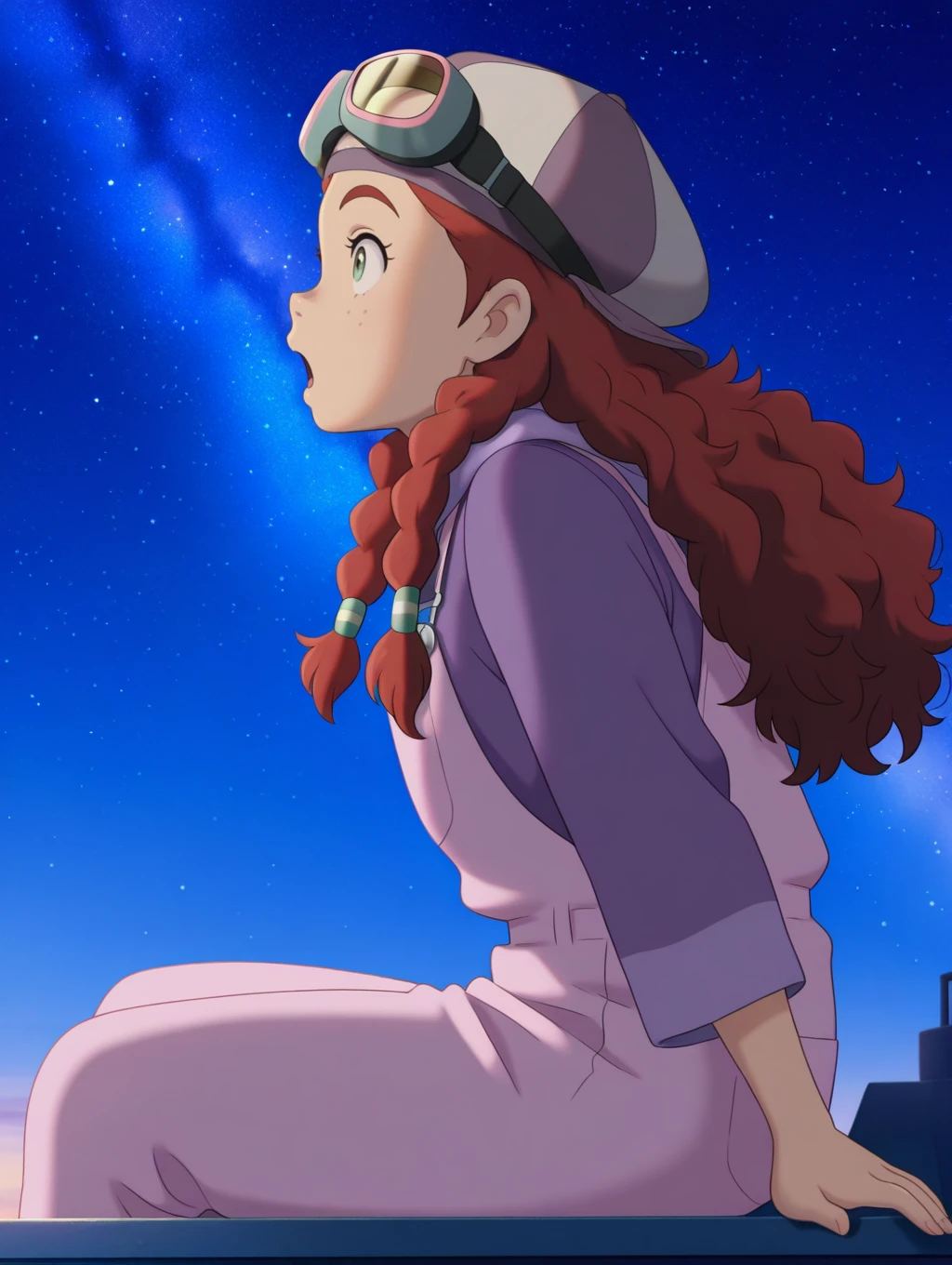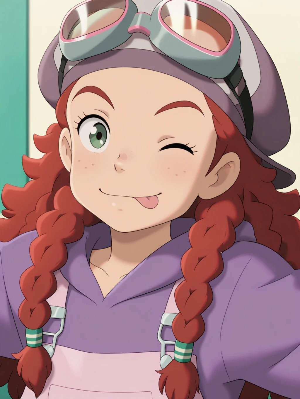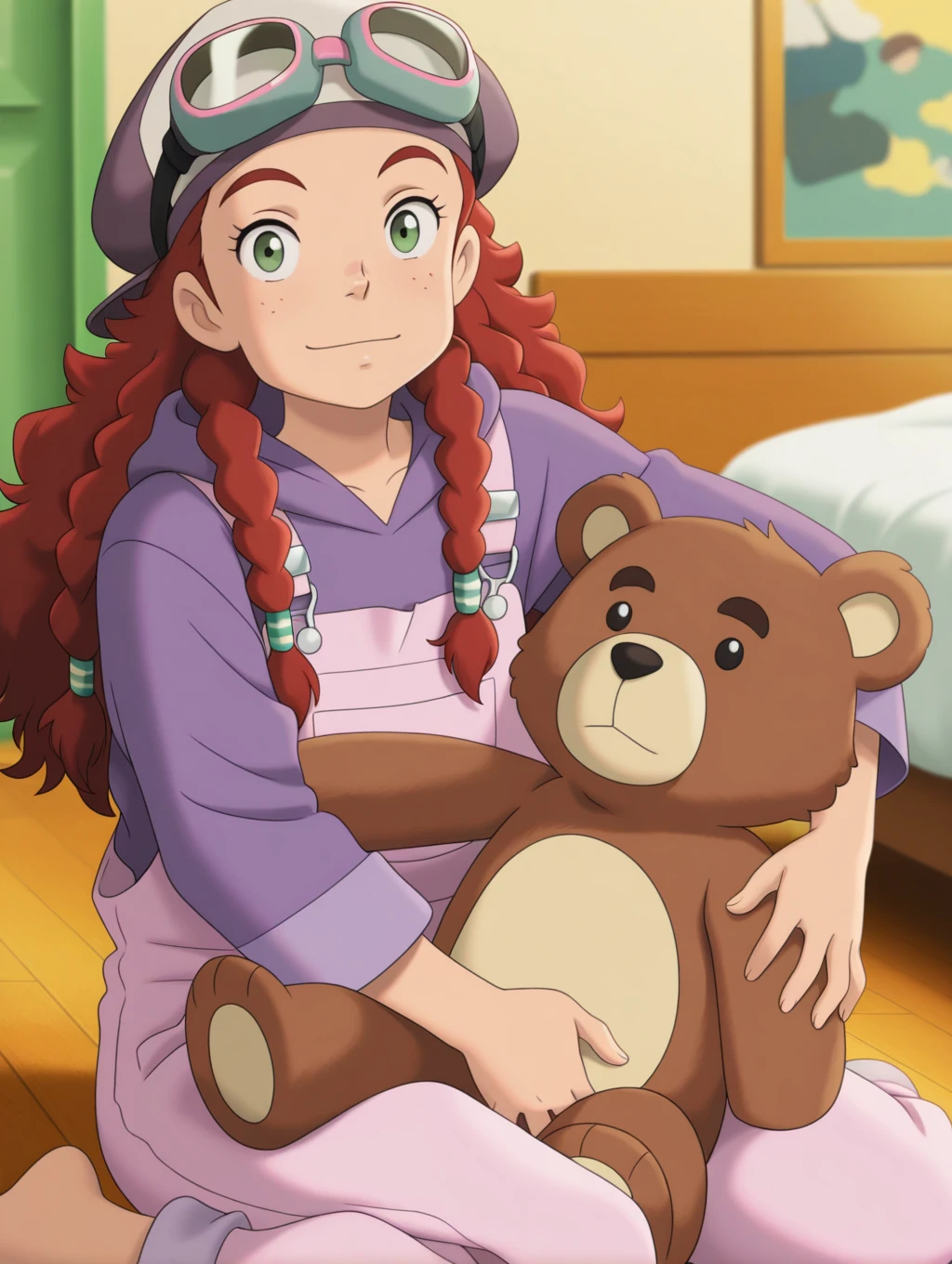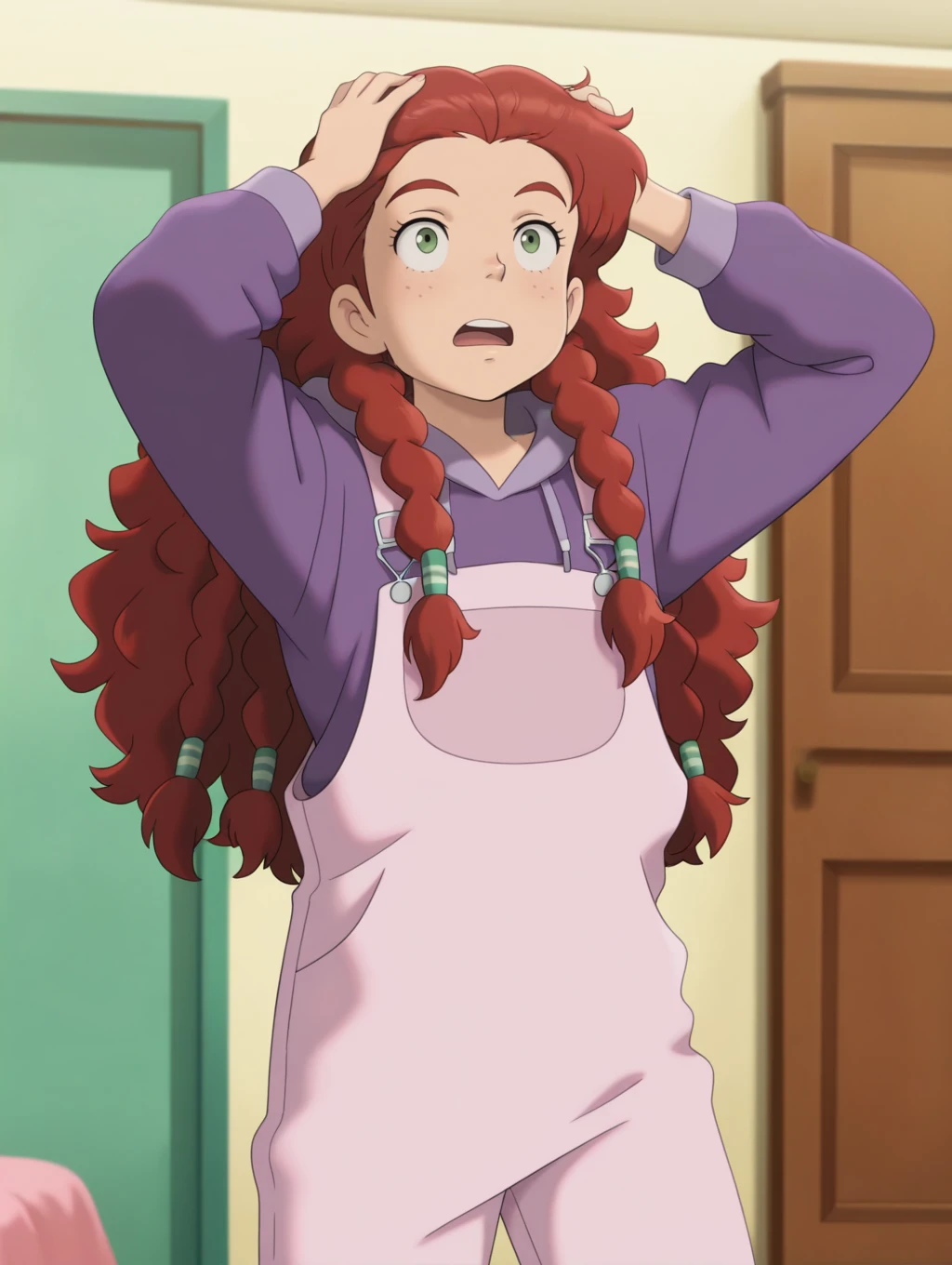 Emily, green eyes, redhead, long hair, braids, green hair ties, freckles, thick eyebrows, 1girl, teen, official style, anime_screencap