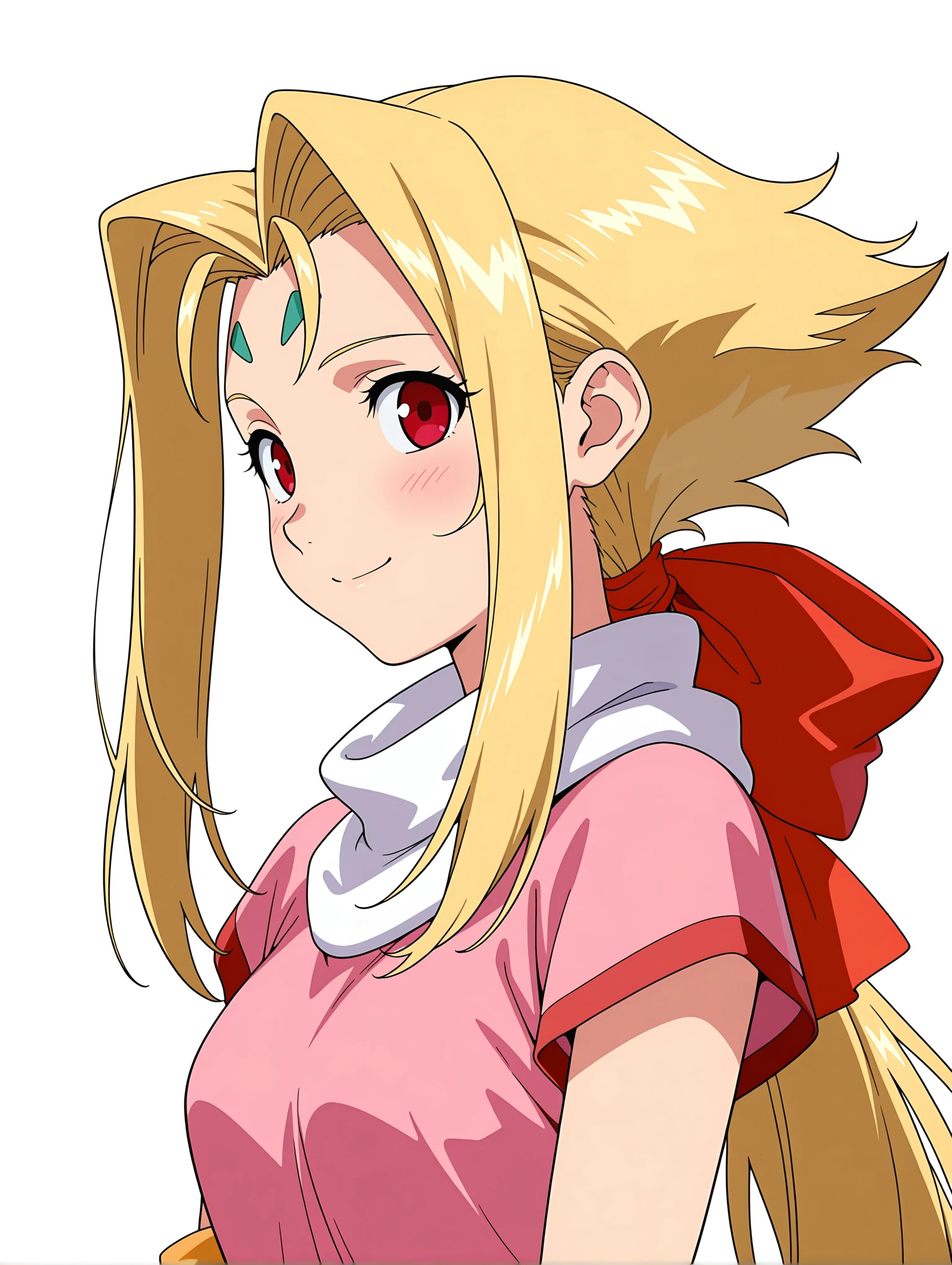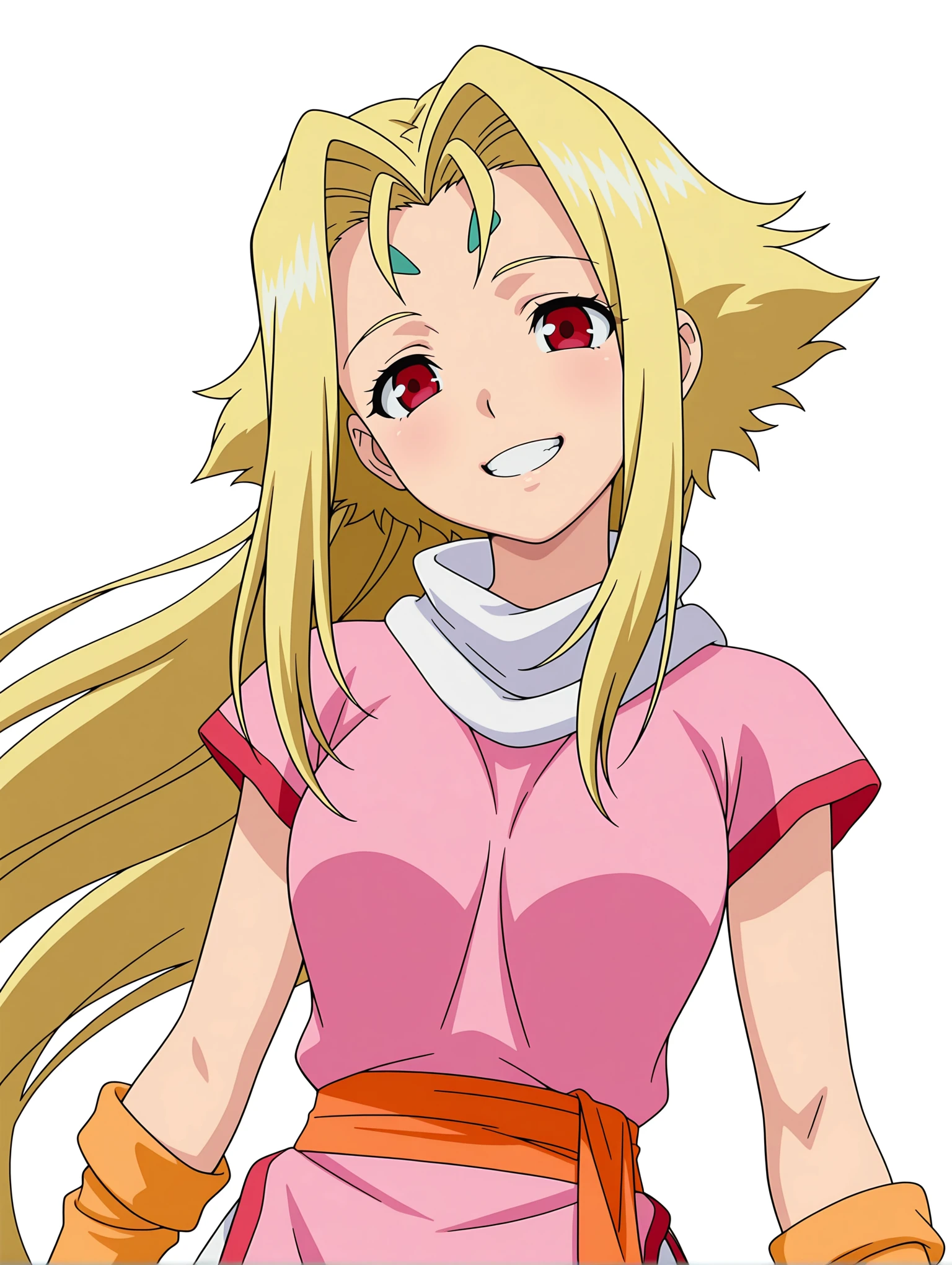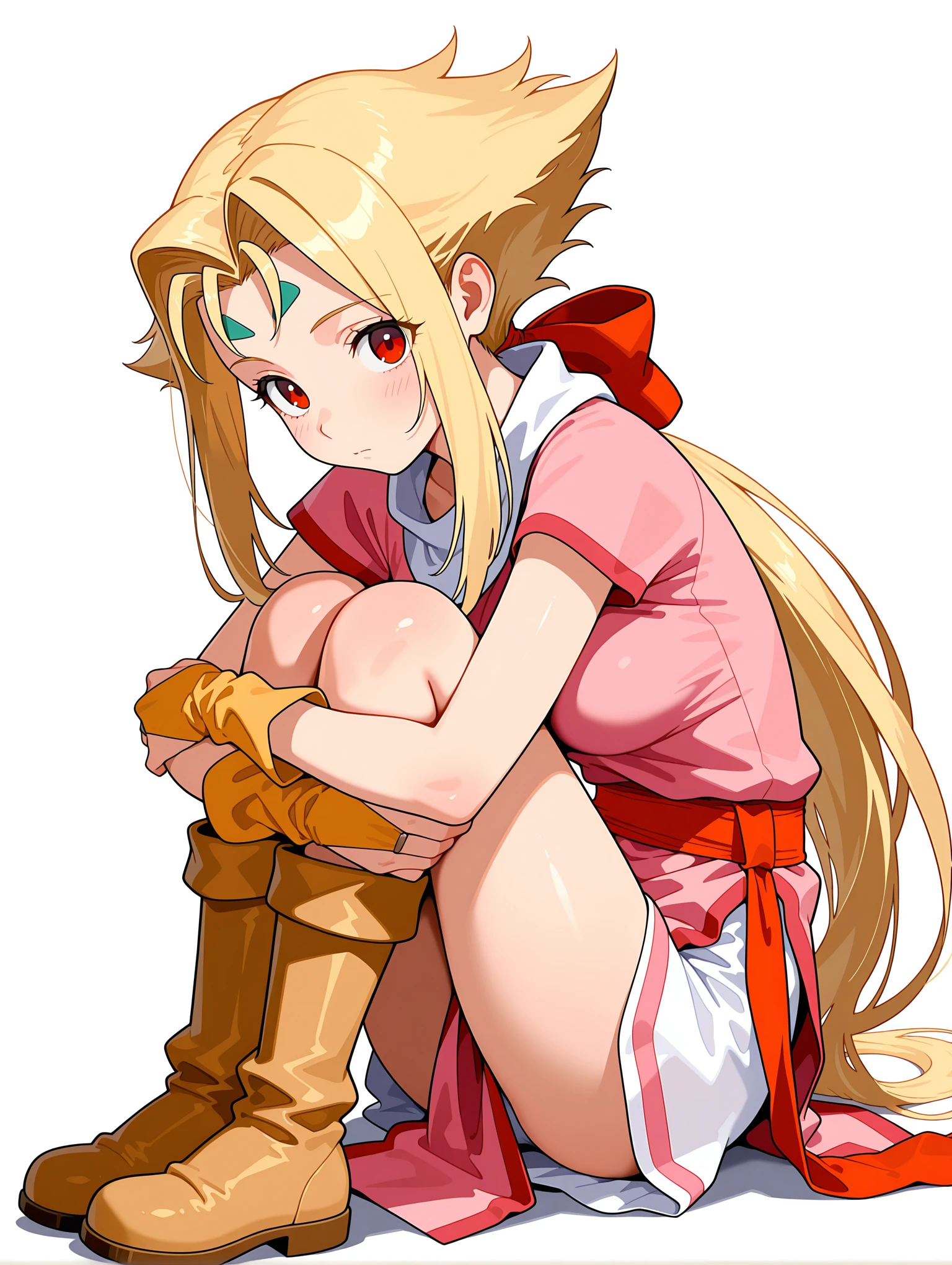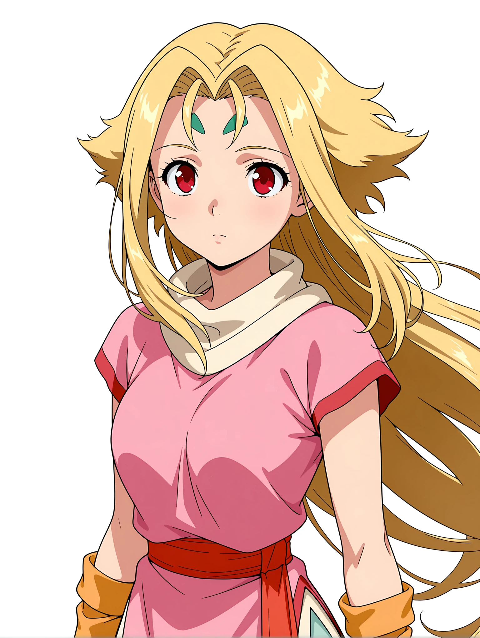 fine_e_l,blonde hair,forehead mark,short hair with long locks,long hair,red eyes,low ponytail,very long hair,