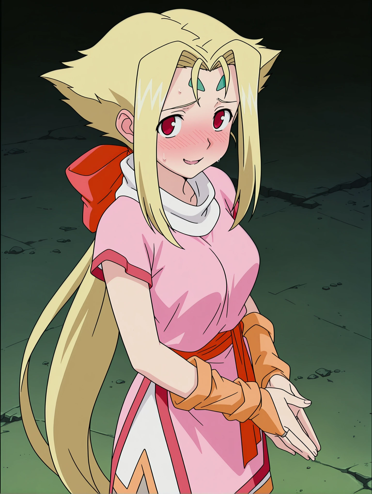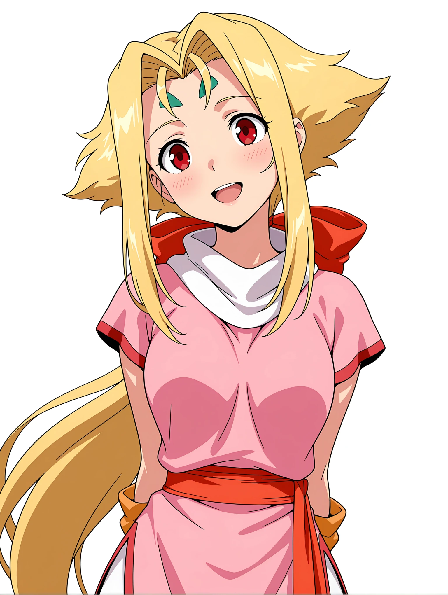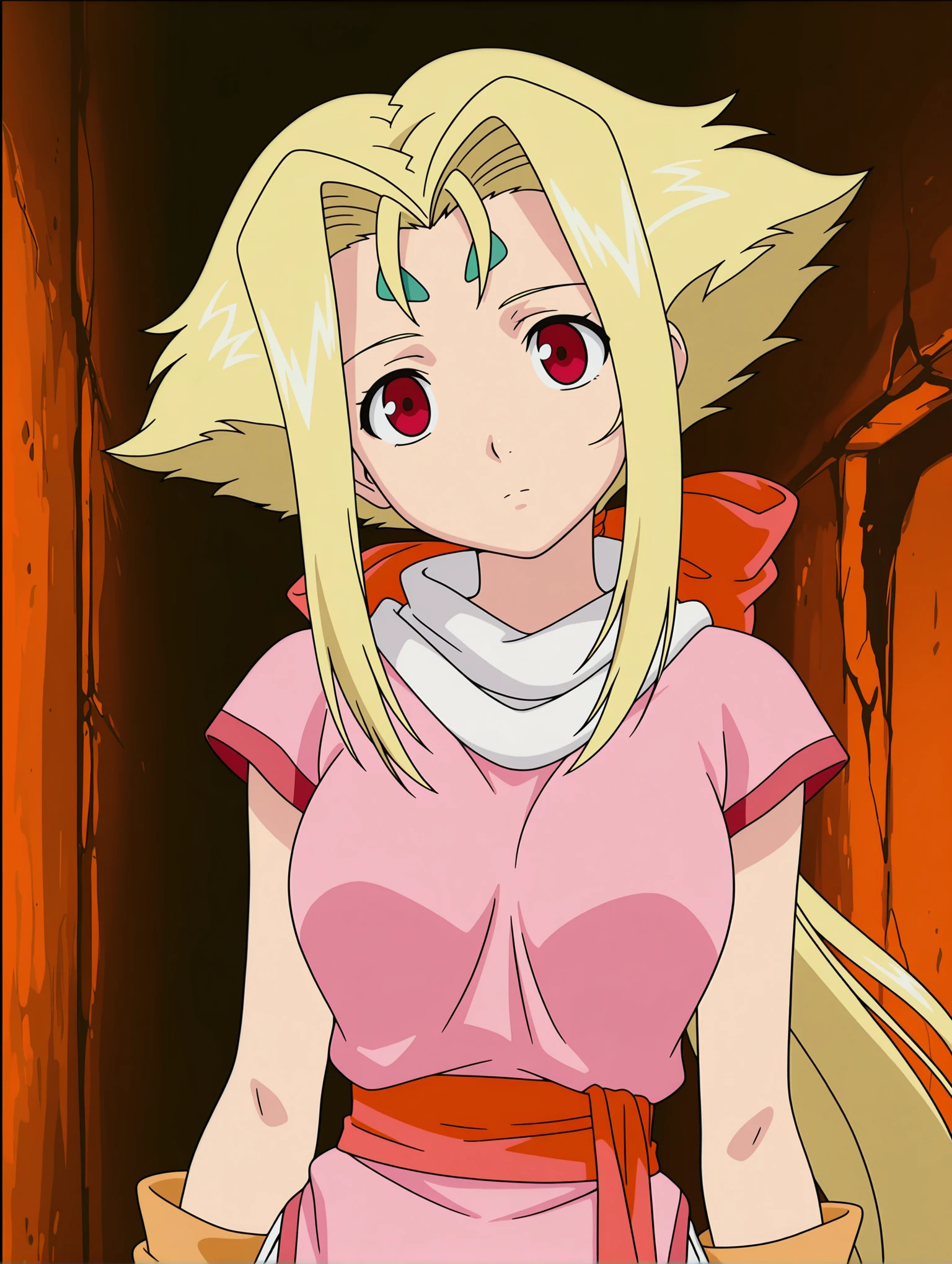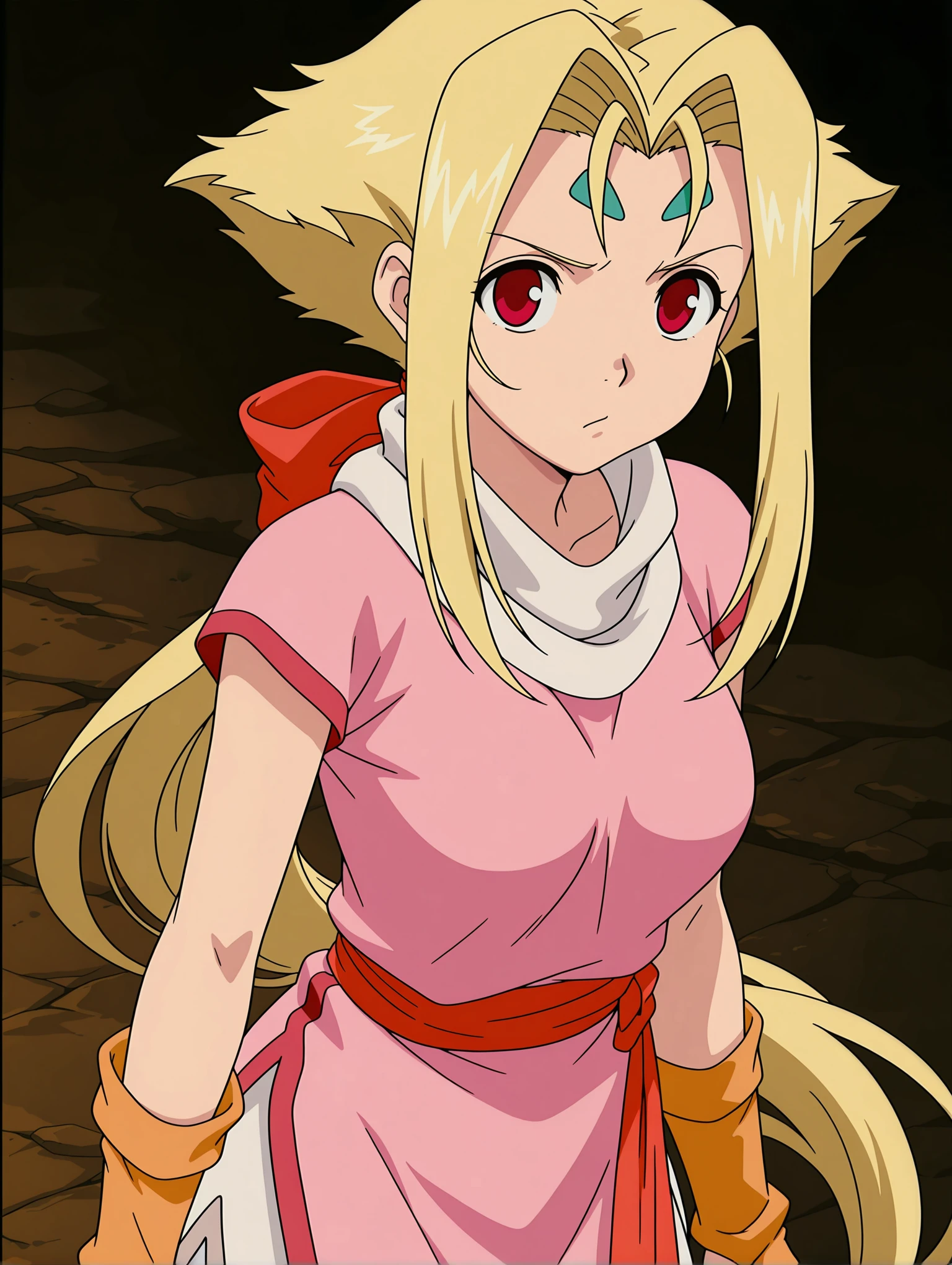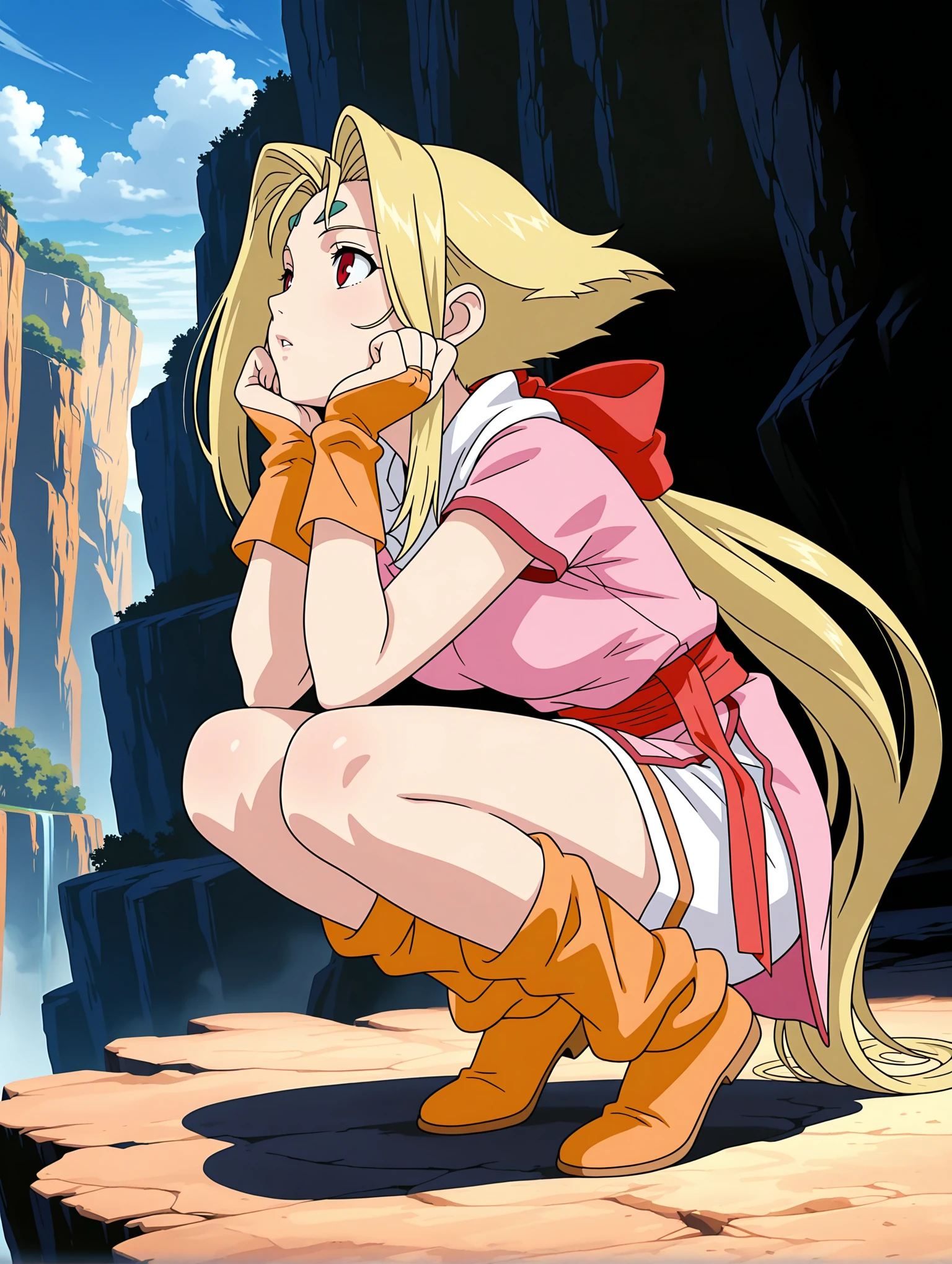 fine_e_l,blonde hair,forehead mark,short hair with long locks,long hair,red eyes,low ponytail,very long hair,