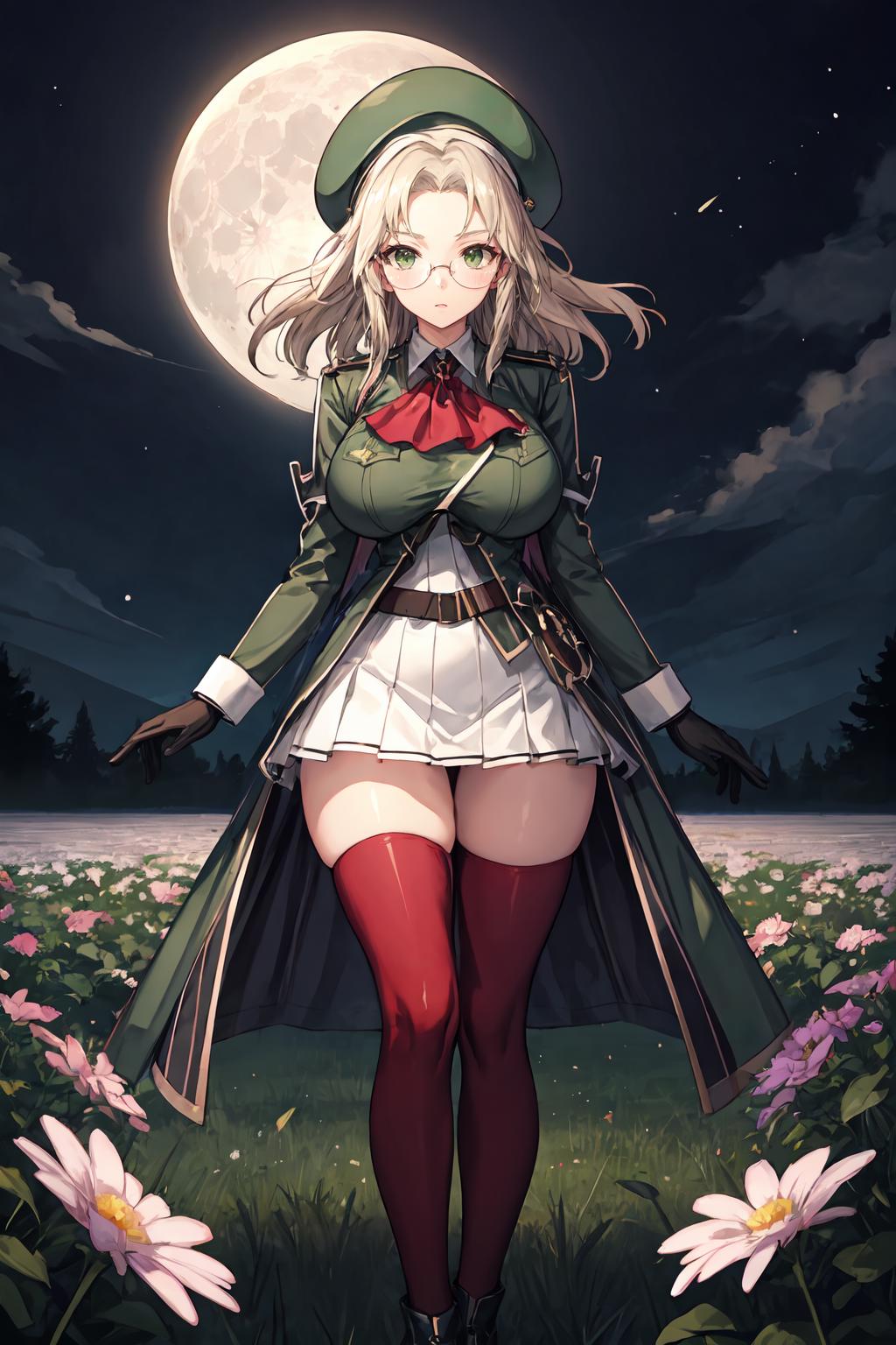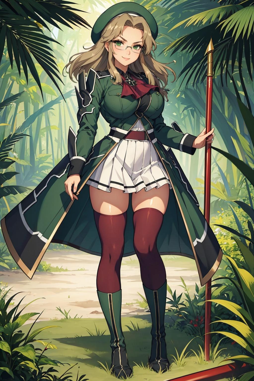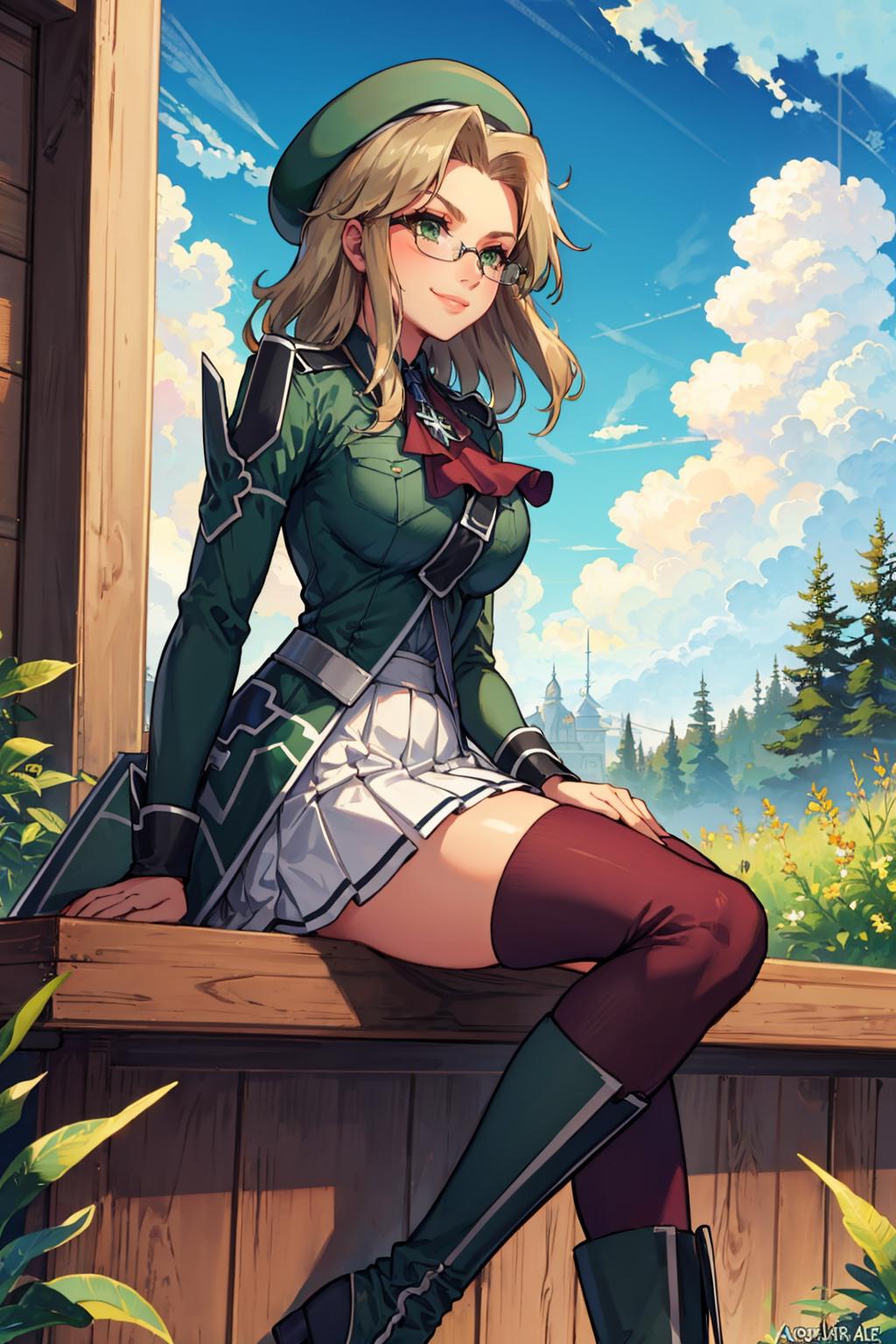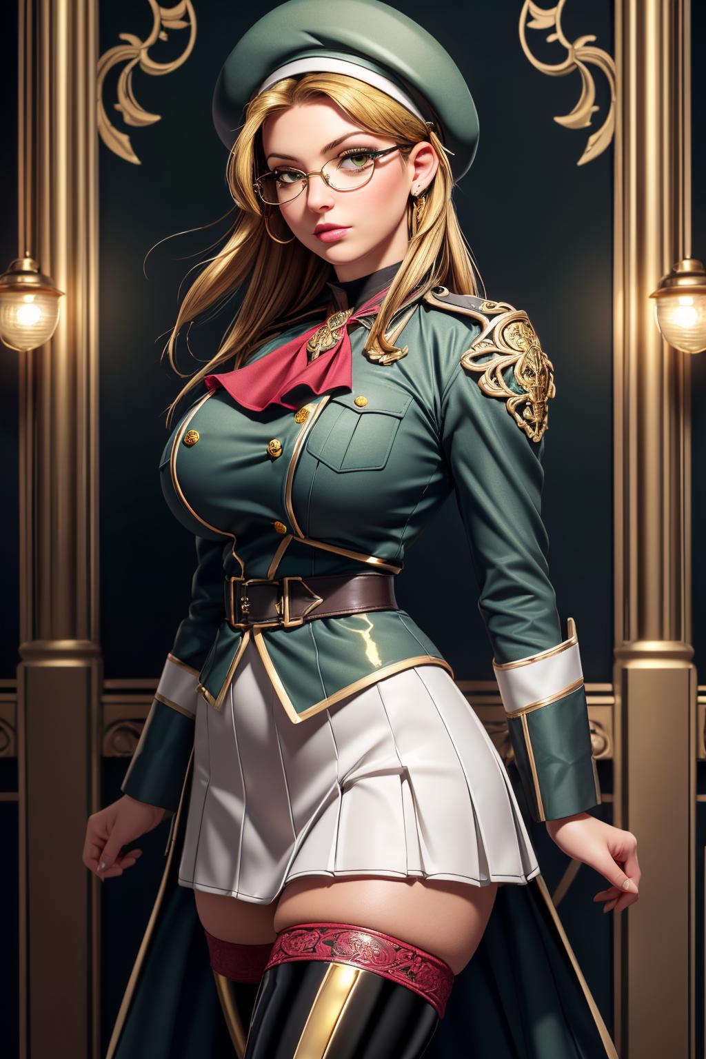 Add "glasses, beret, red ascot, military uniform, white skirt, red thighhighs, green boots" for her uniform.