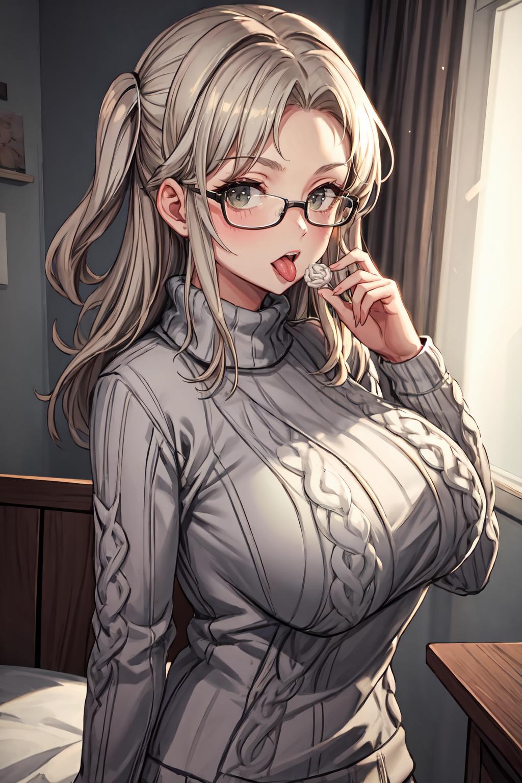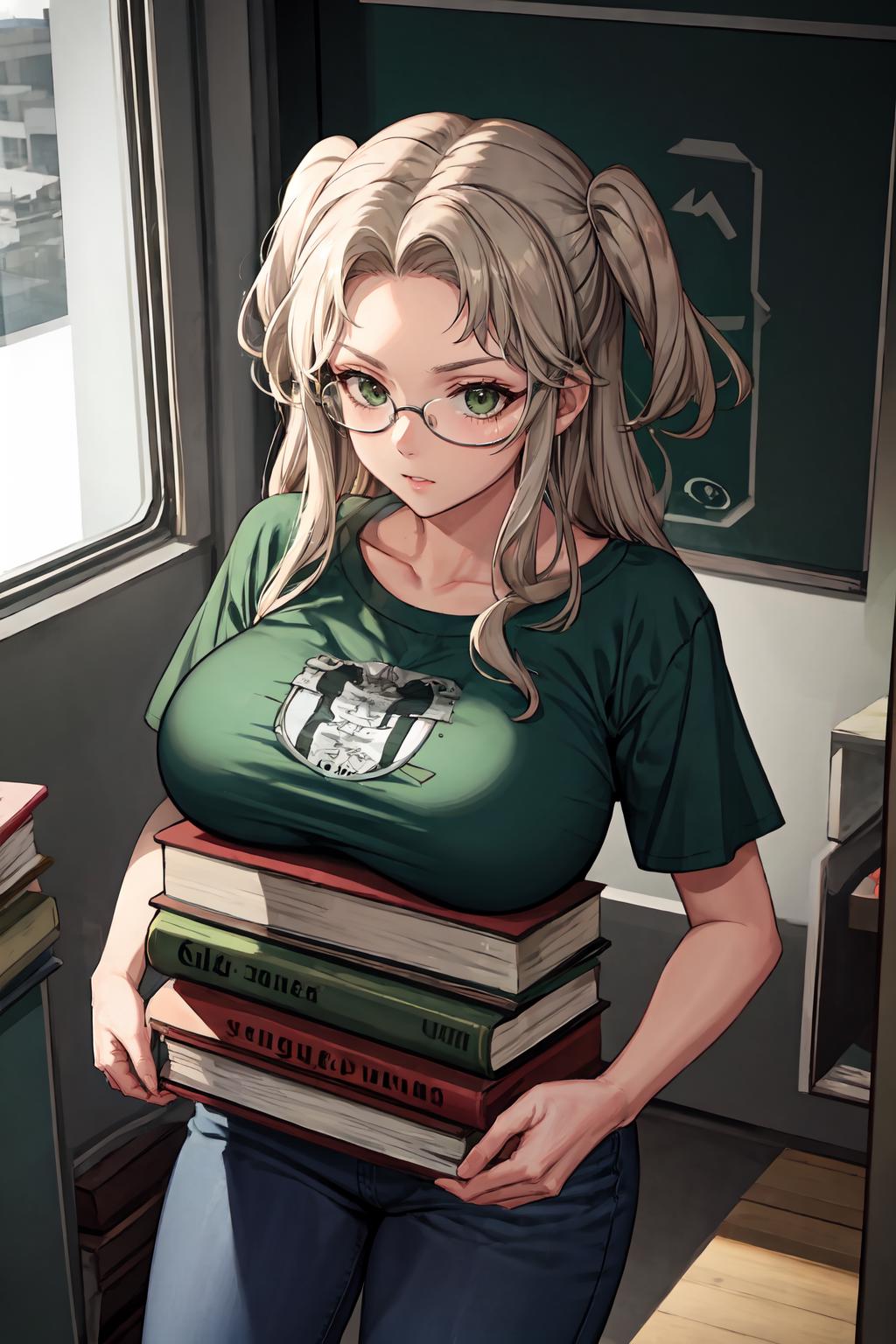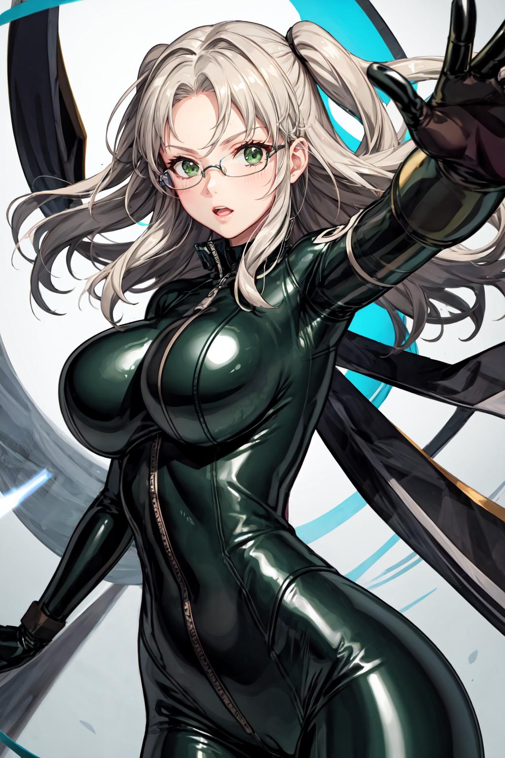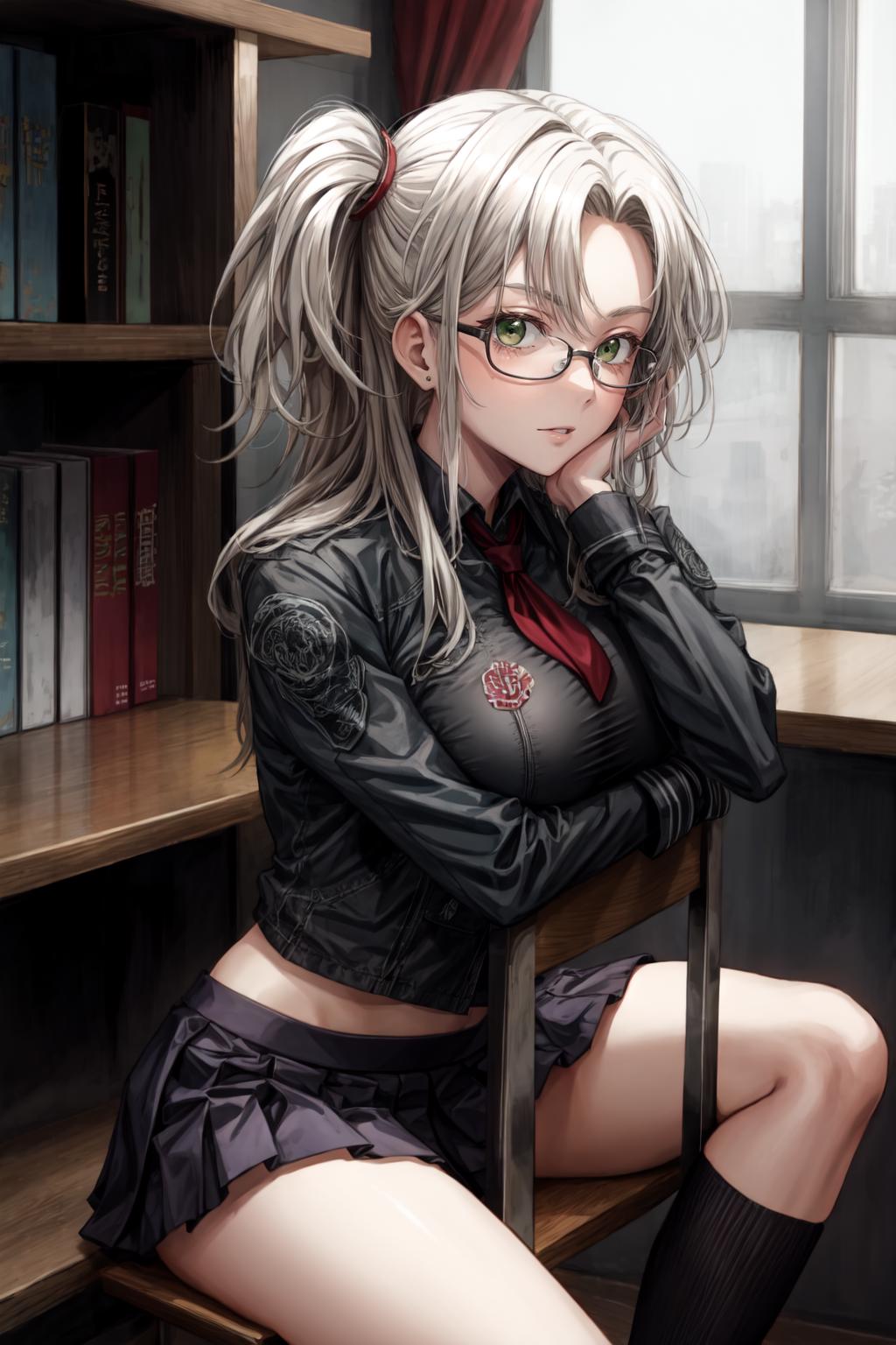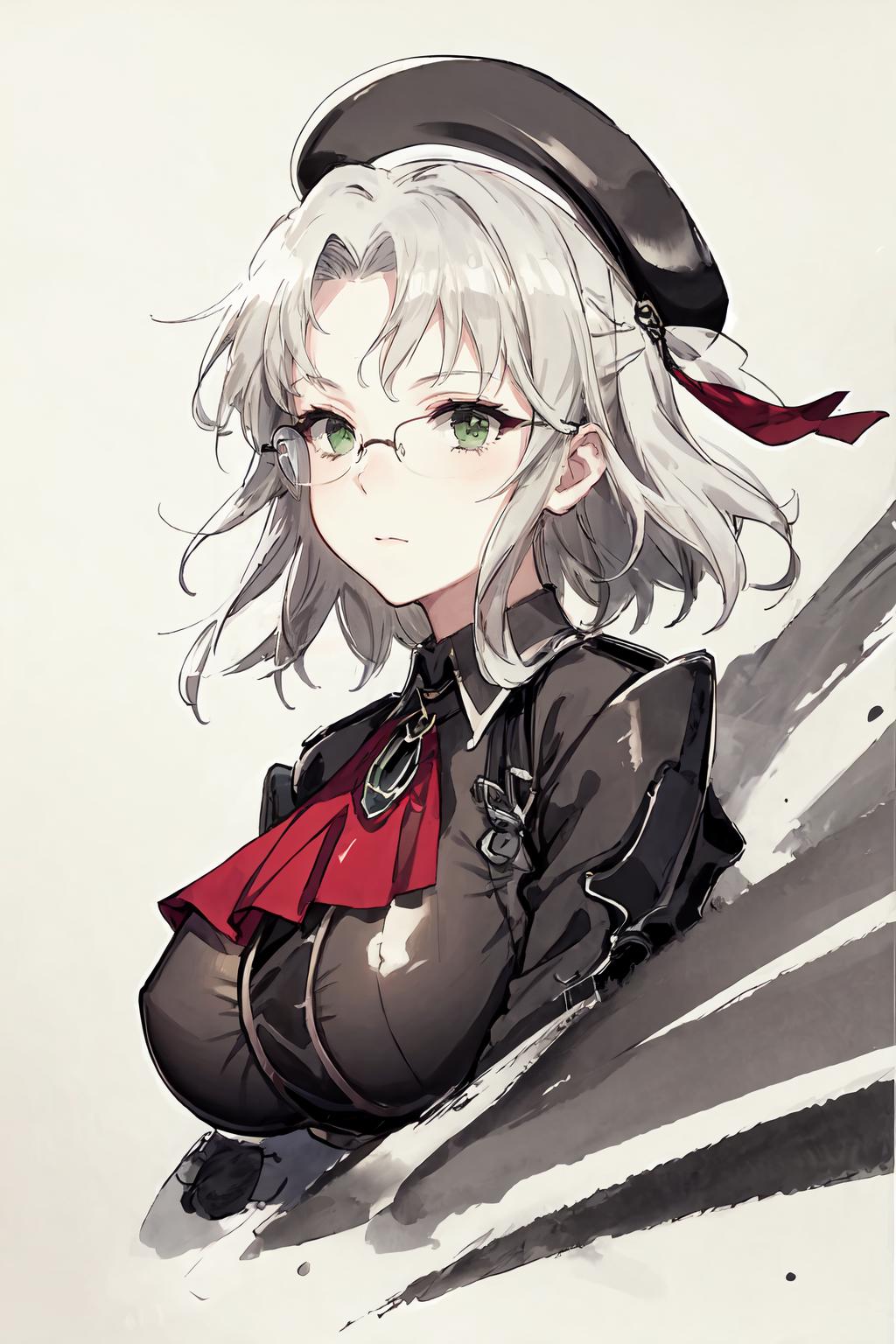 Add "glasses, beret, red ascot, military uniform, white skirt, red thighhighs, green boots" for her uniform.