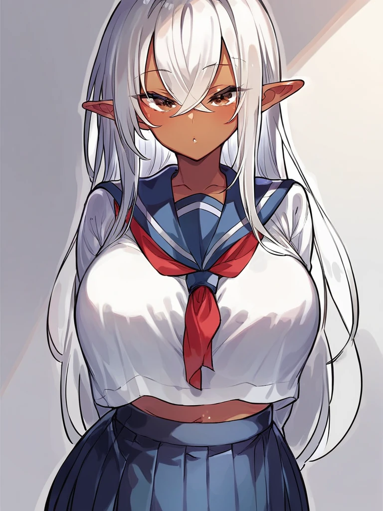 Umanami: umanami fne, long hair, white hair, hair between eyes, brown eyes, narrowed eyes, dark-skinned female, pointy ears,