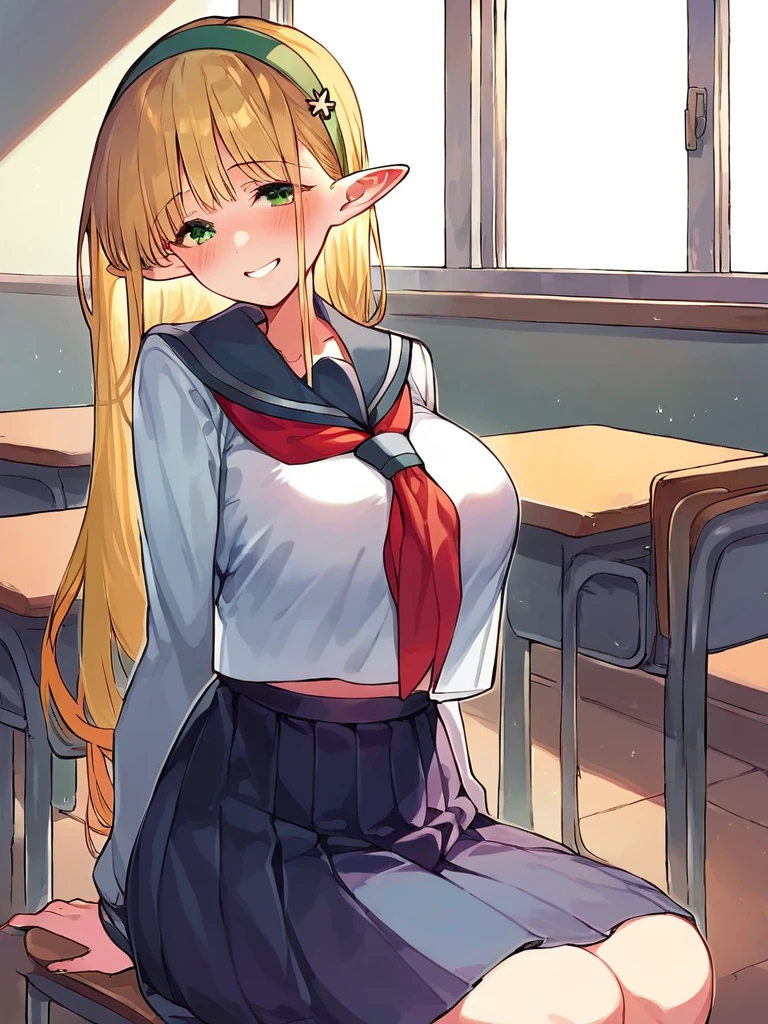Mara: mara fne, blonde hair, long hair, green eyes, pointy ears, hairband,
