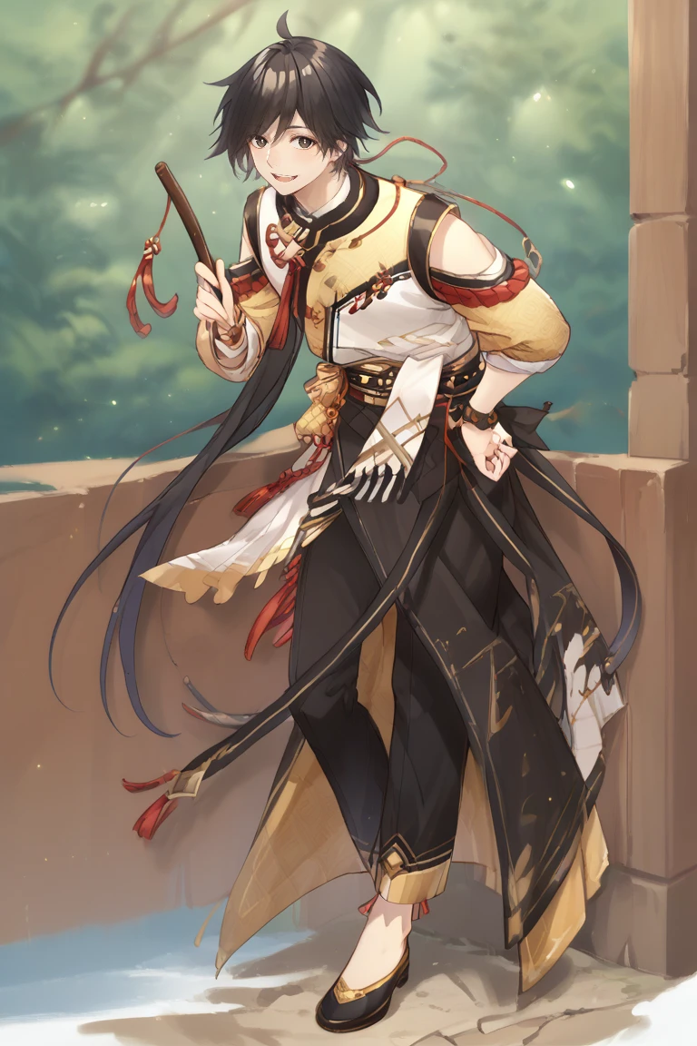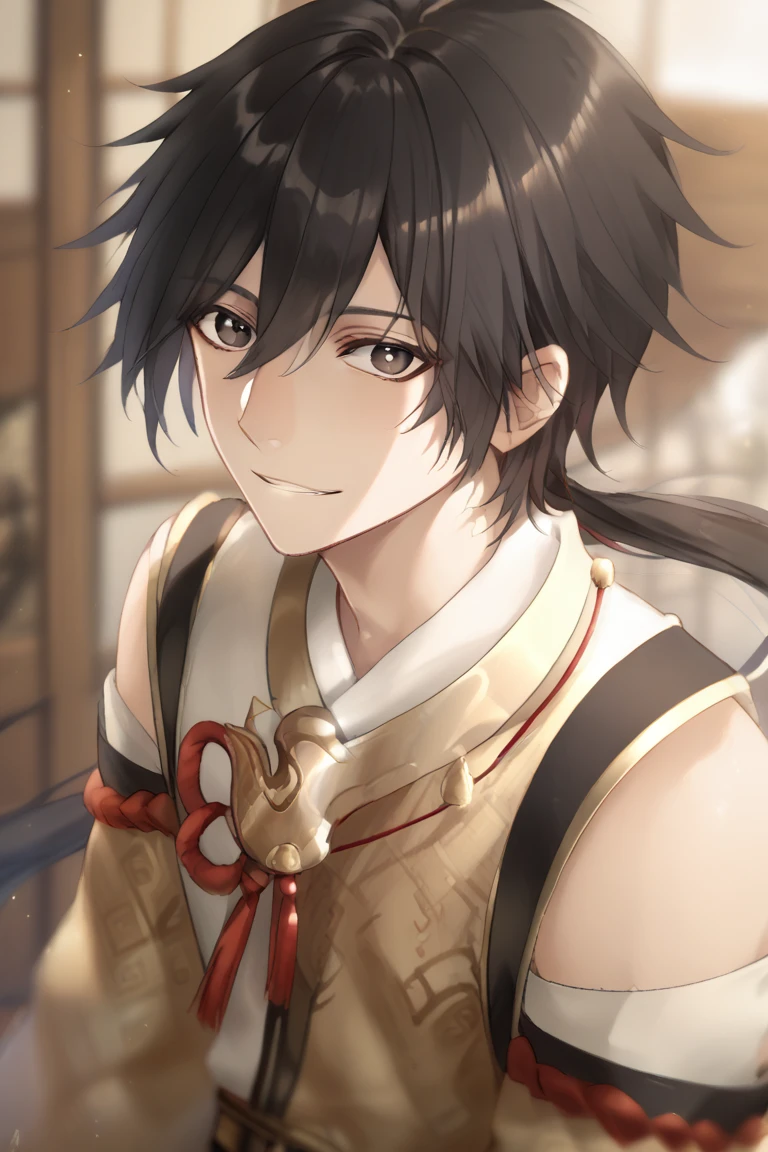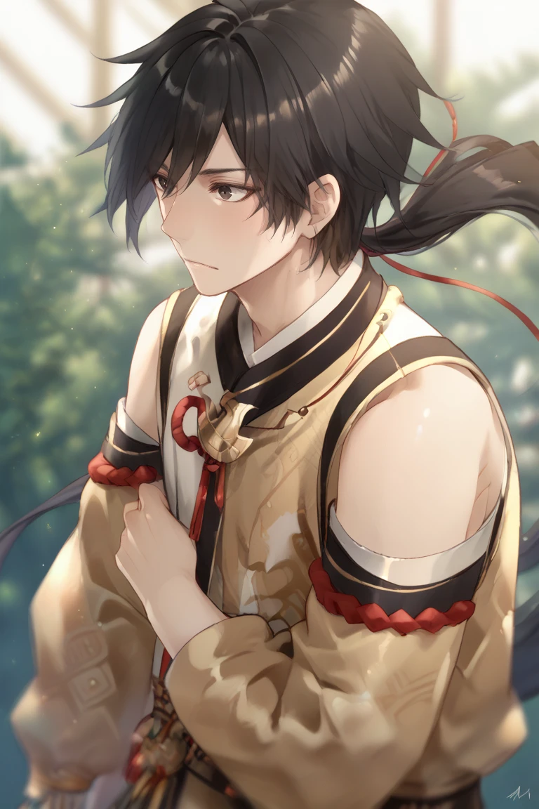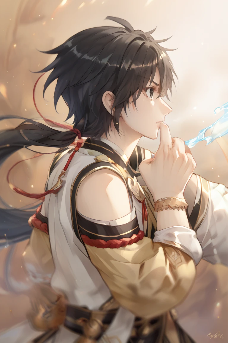 drunken chicken, black hair, black eyes, long hair, ponytail,