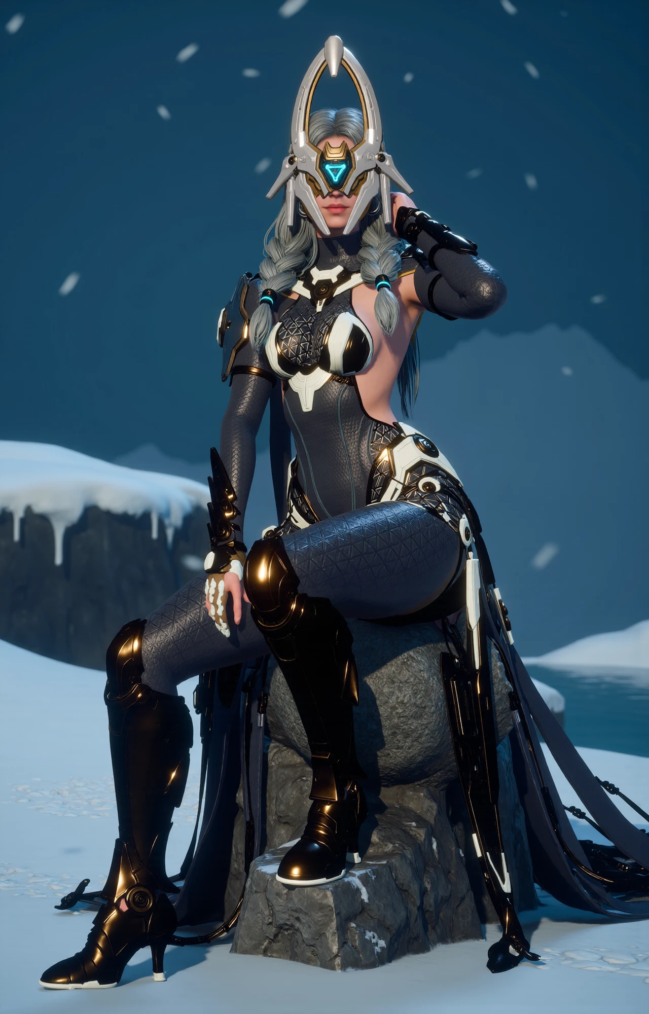 The character has a sleek, athletic build with a toned physique. She wears a mask with a sleek, futuristic design that covers most of her face, leaving only her mouth and nose visible. The mask is predominantly white with gold and blue accents. She has long, wavy silver hair styled into two braids that cascade over her shoulders.