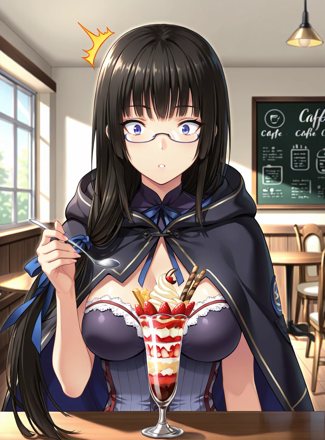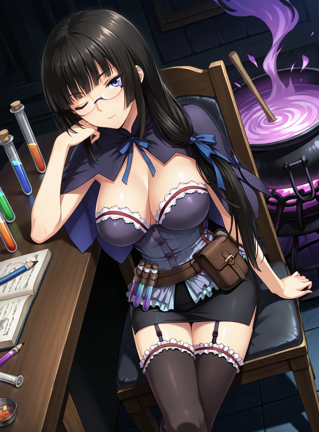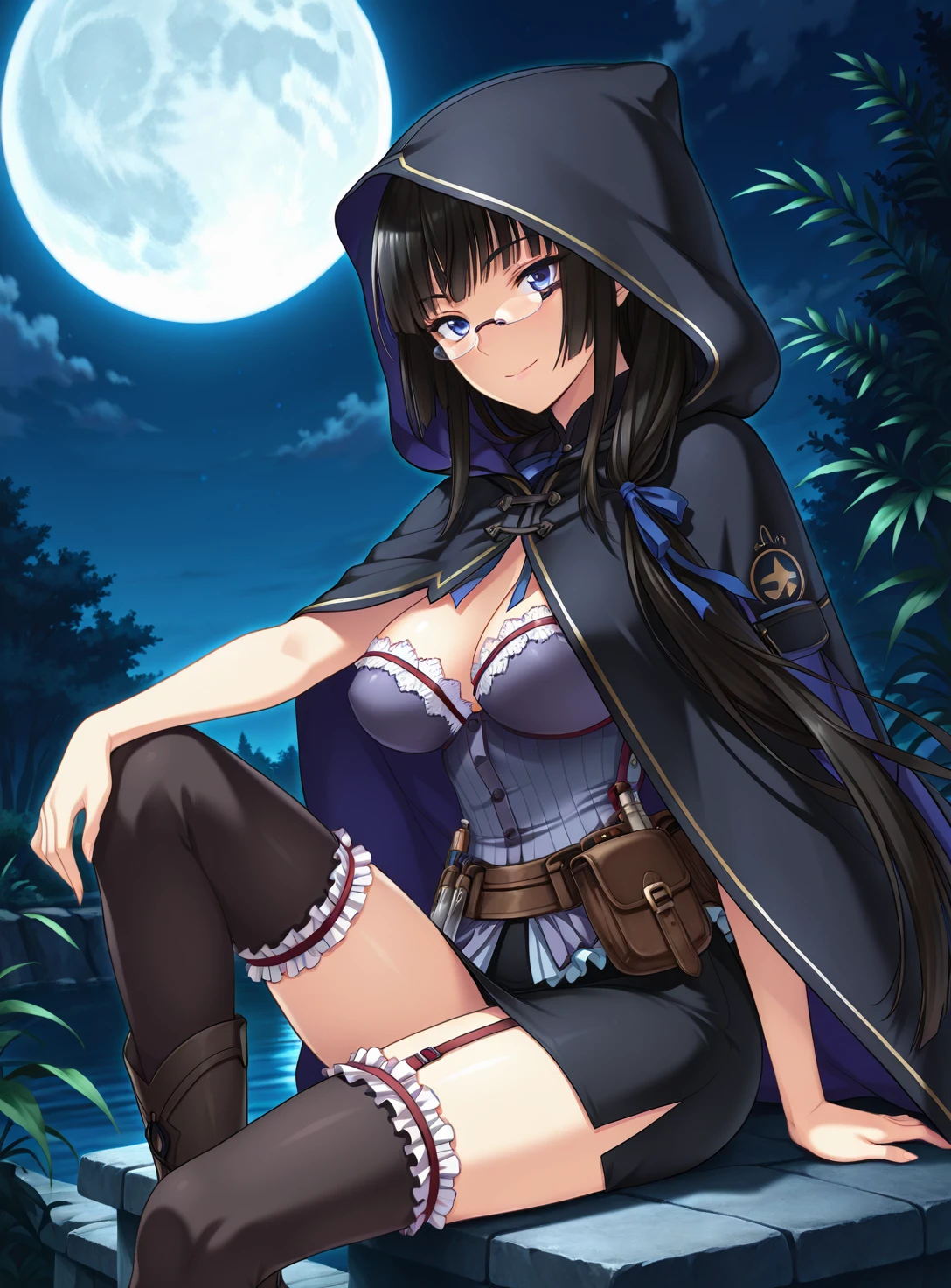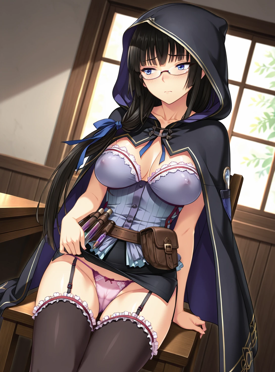 Elemia, low-tied long hair, hair over shoulder, glasses, hooded cloak, bustier, pencil skirt, frilled thighhighs, utility belt,