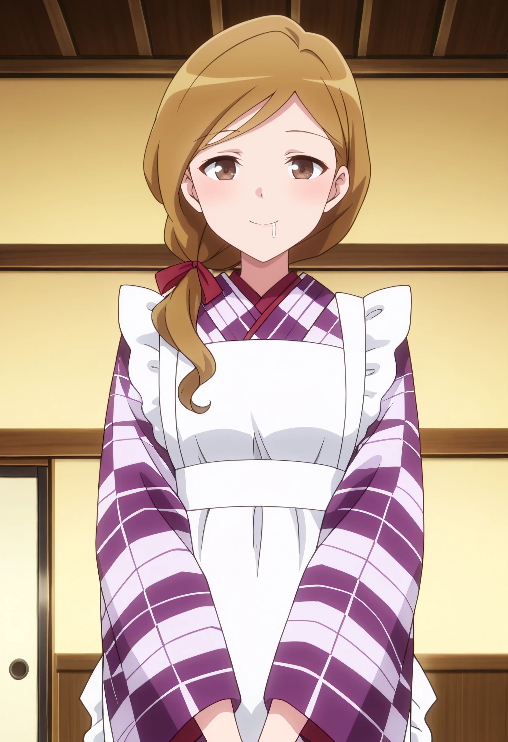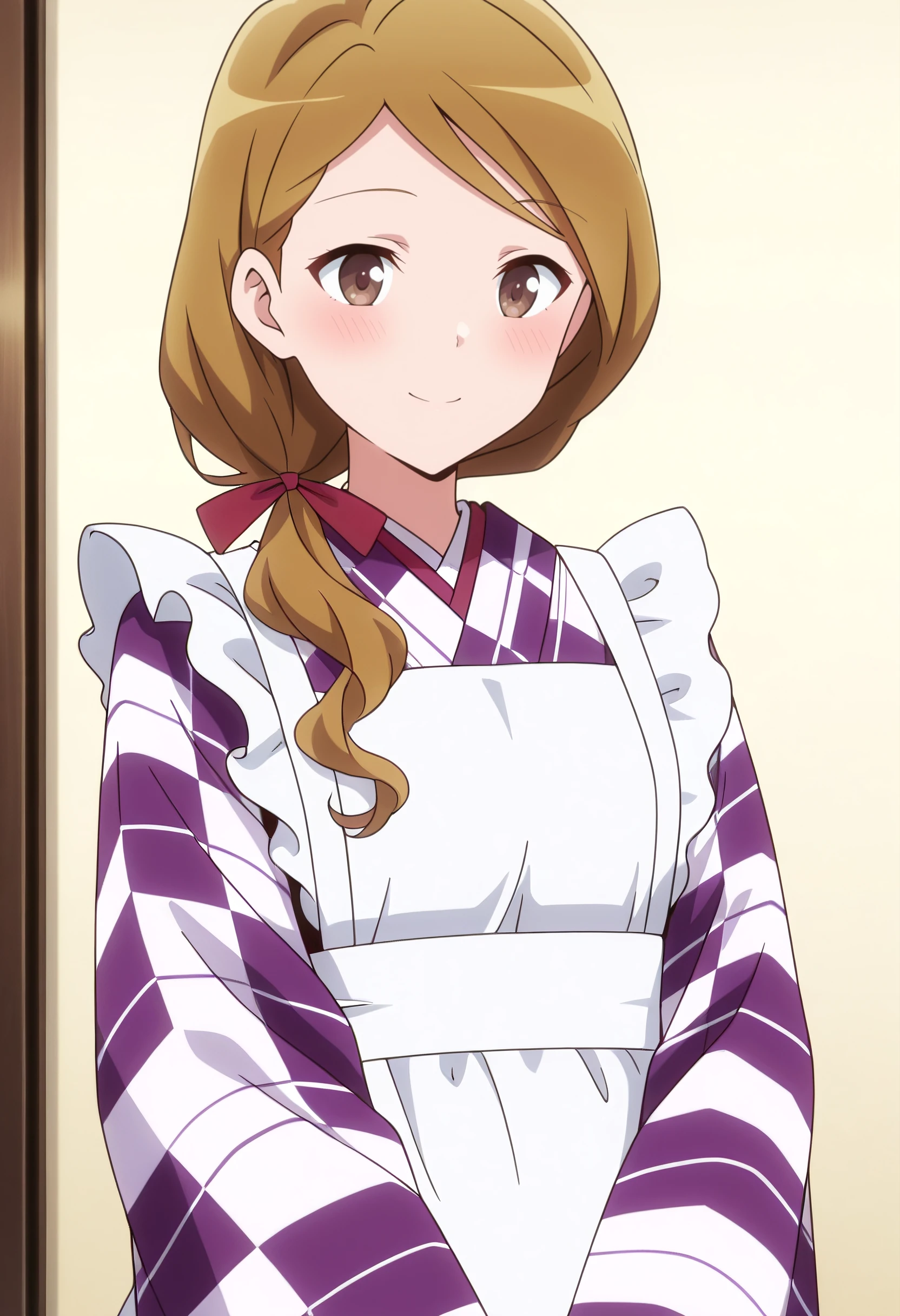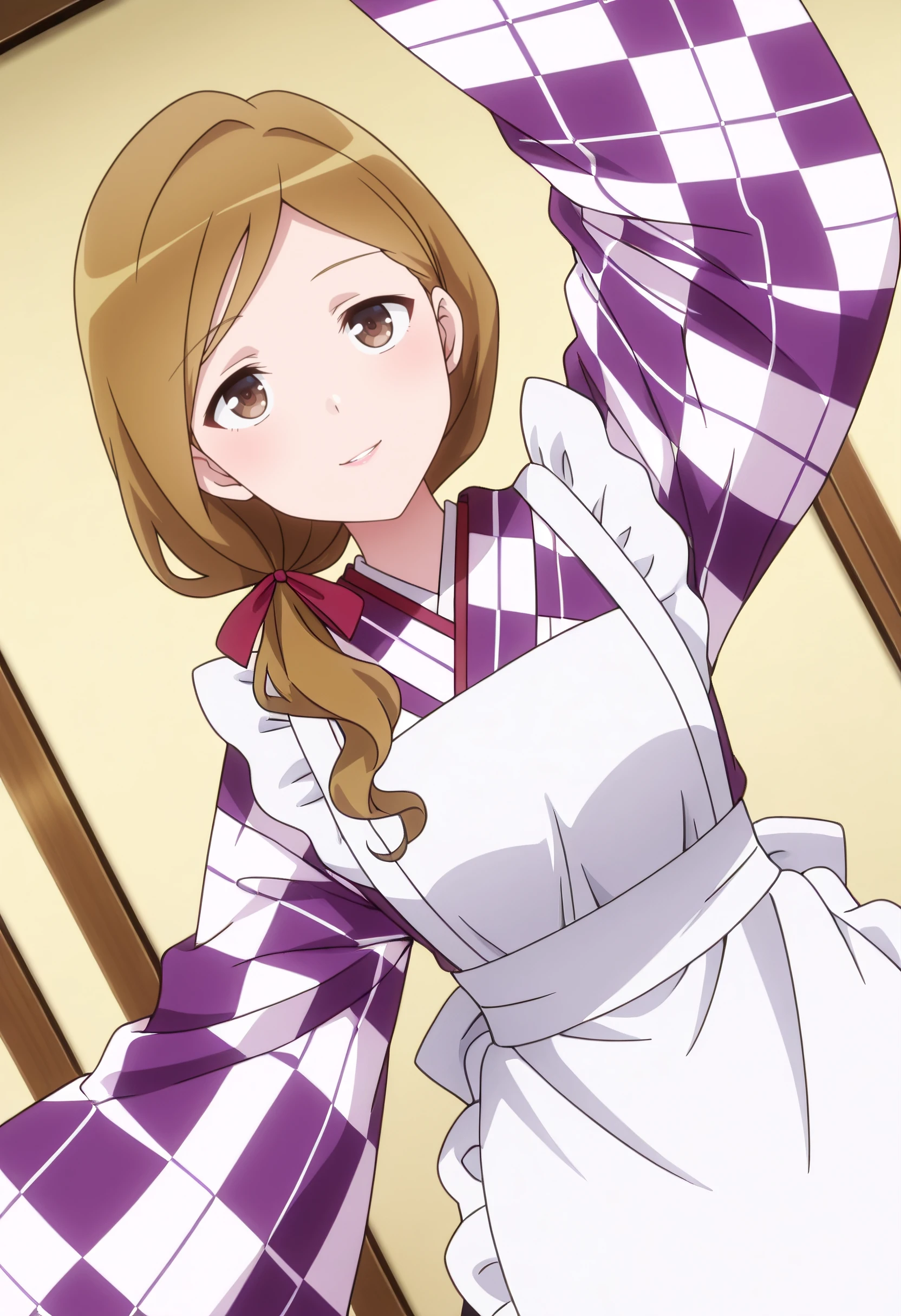 BelleKimono, apron, japenese clothes, kimono, checkered kimono, checkered clothes, ribbon, hair ribbon, wa maid, maid, frilled apron, white apron, red ribbon, wide sleeves, maid apron, housewife, purple kimono, long sleeves,