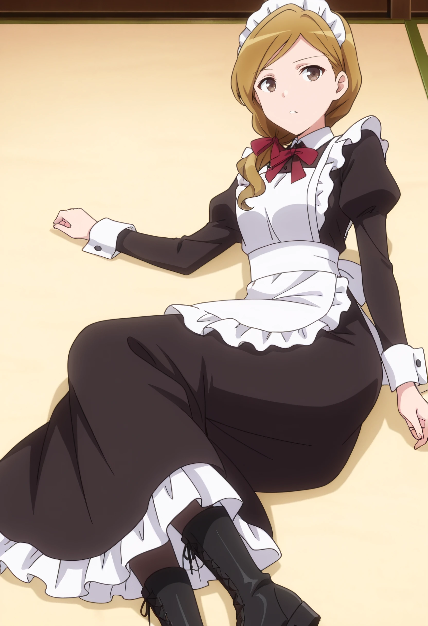 BelleMaid, apron, maid, black dress, dress, maid apron, maid headdress, white apron, juliet sleeves, puffy sleeves, long sleeves, ribbon, enmaided, frills, boots, black footwear, frilled apron, bow, red bow, sleeve cuffs, pantyhose, black pantyhose, long dress,