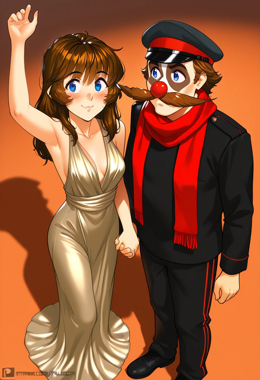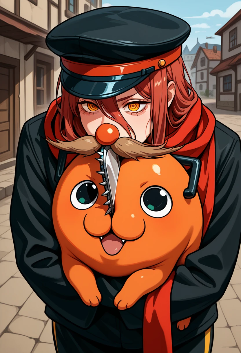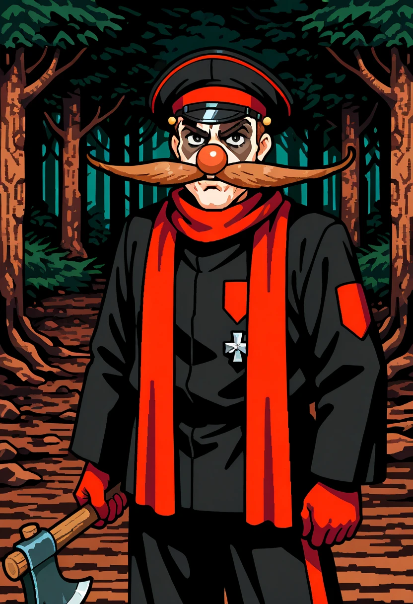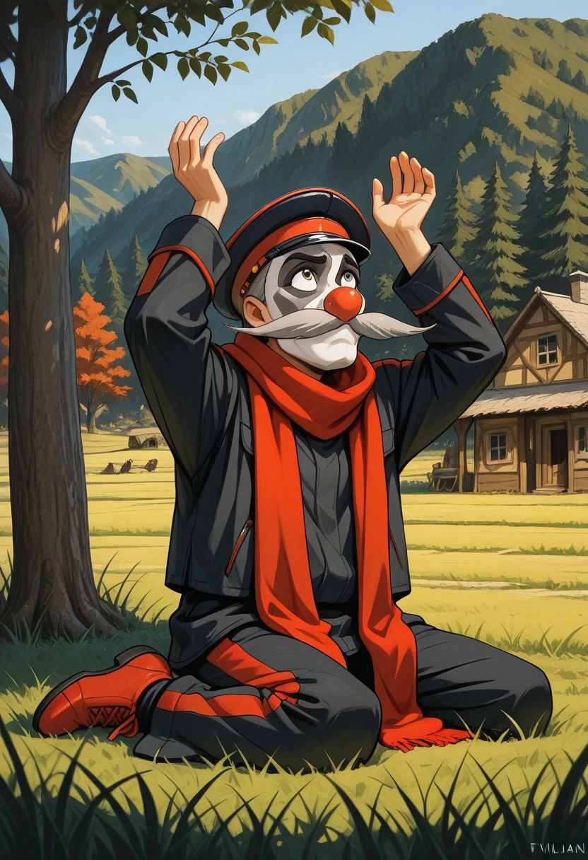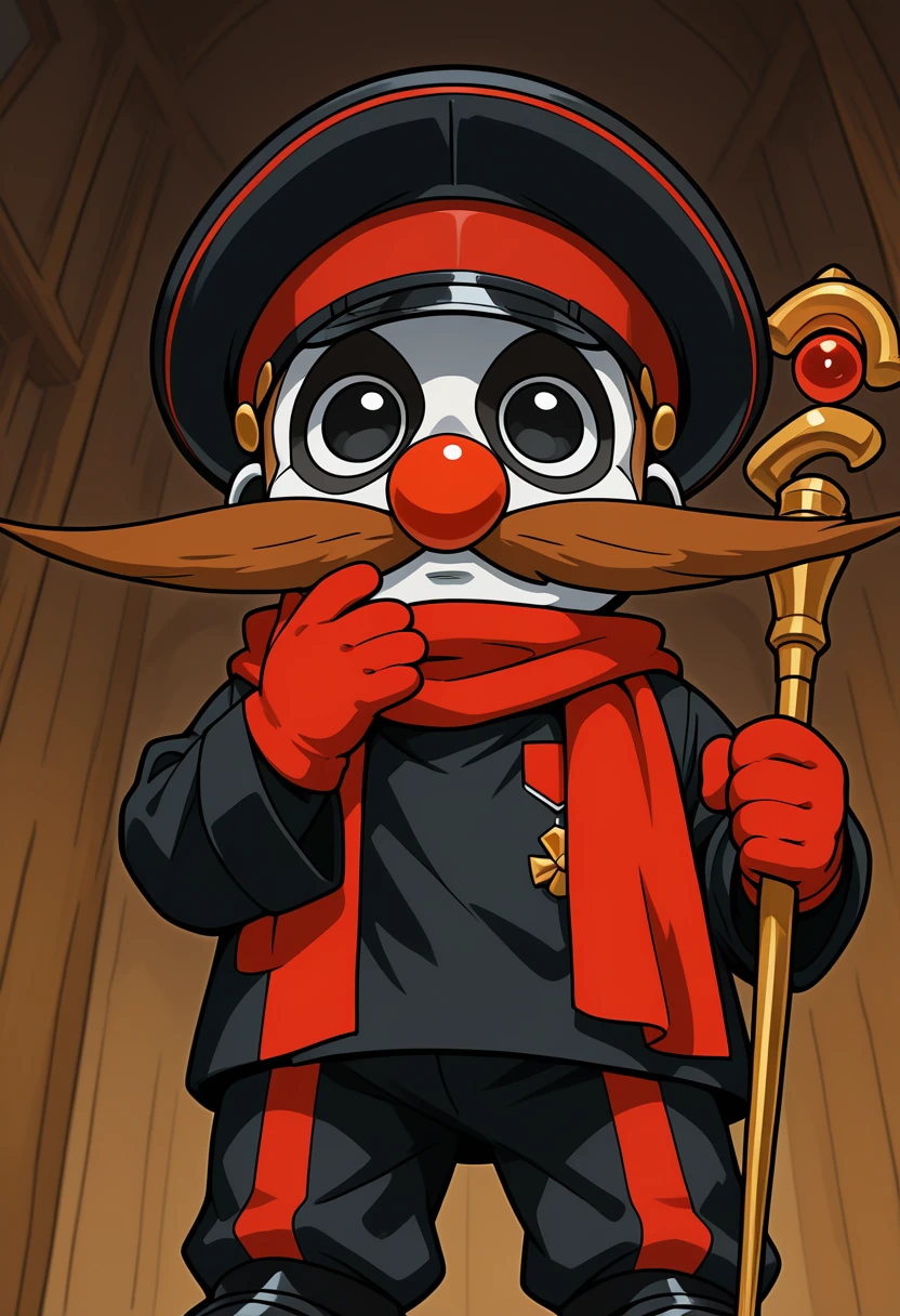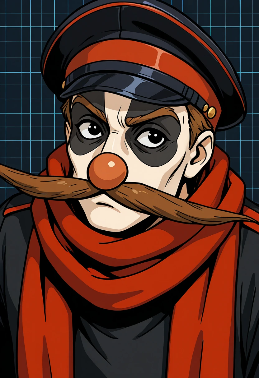 fvilman, mustache, red scarf, peaked cap, black jacket, black pants, red glovesOptions: