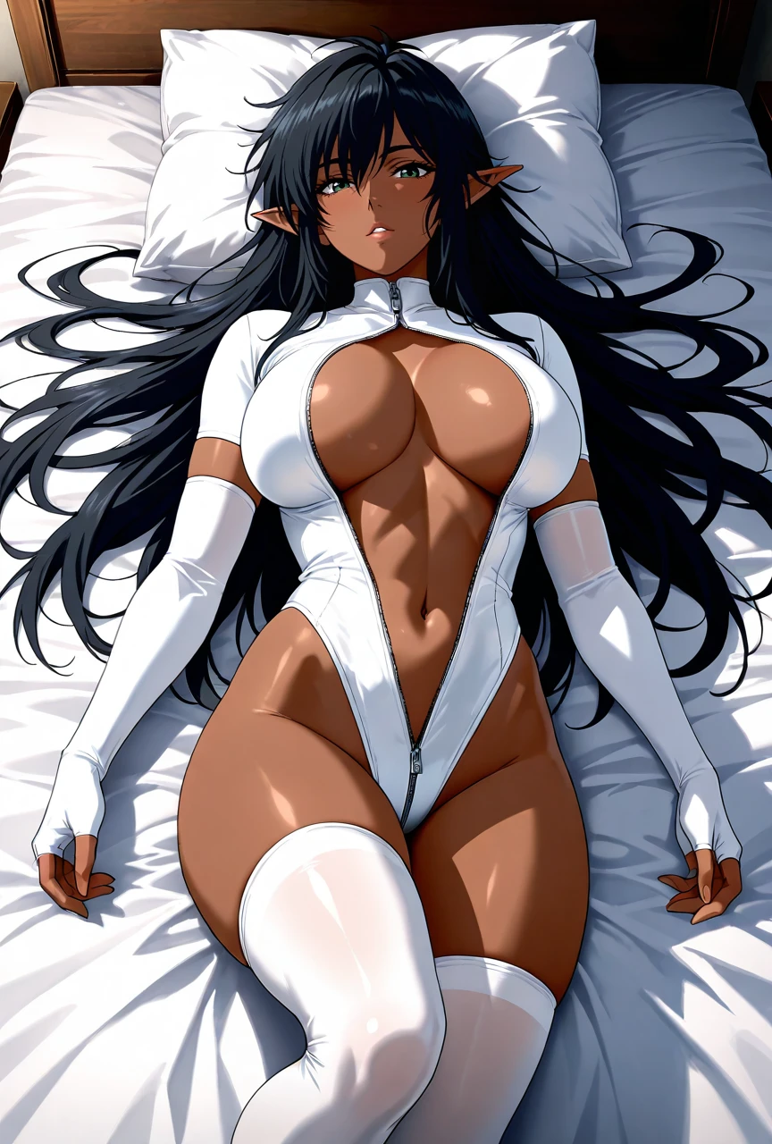 arshes_nei, elf, pointy ears, green eyes, black hair, bangs, very long hair, dark-skinned female,