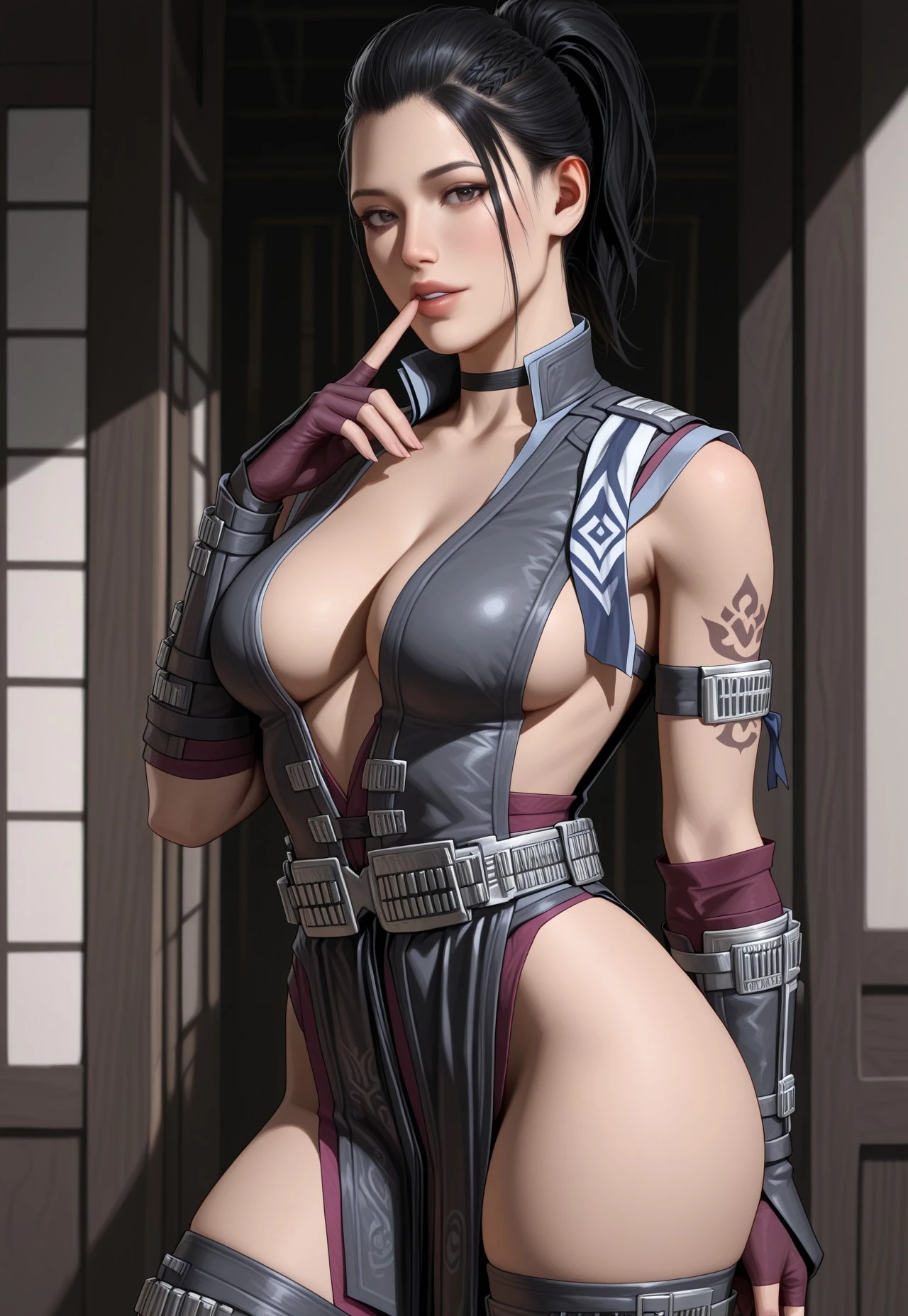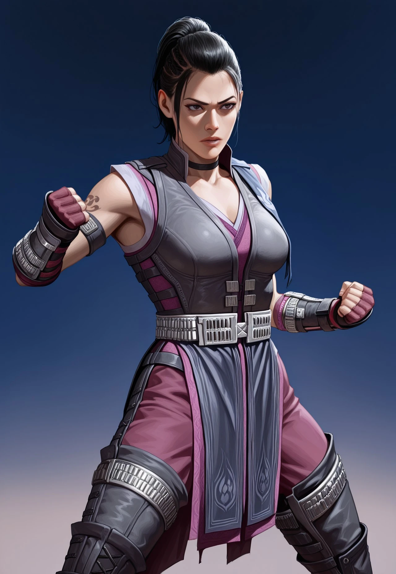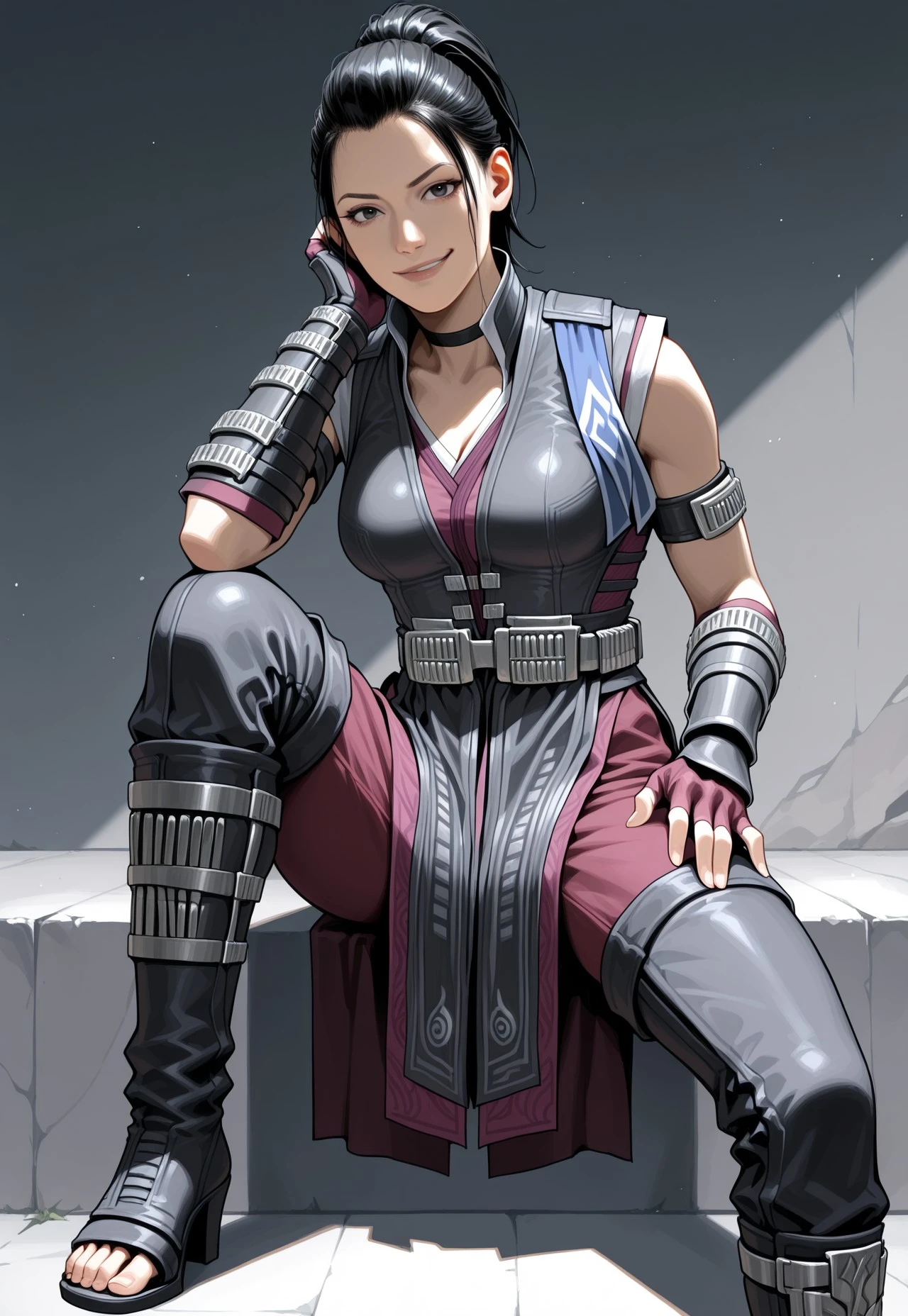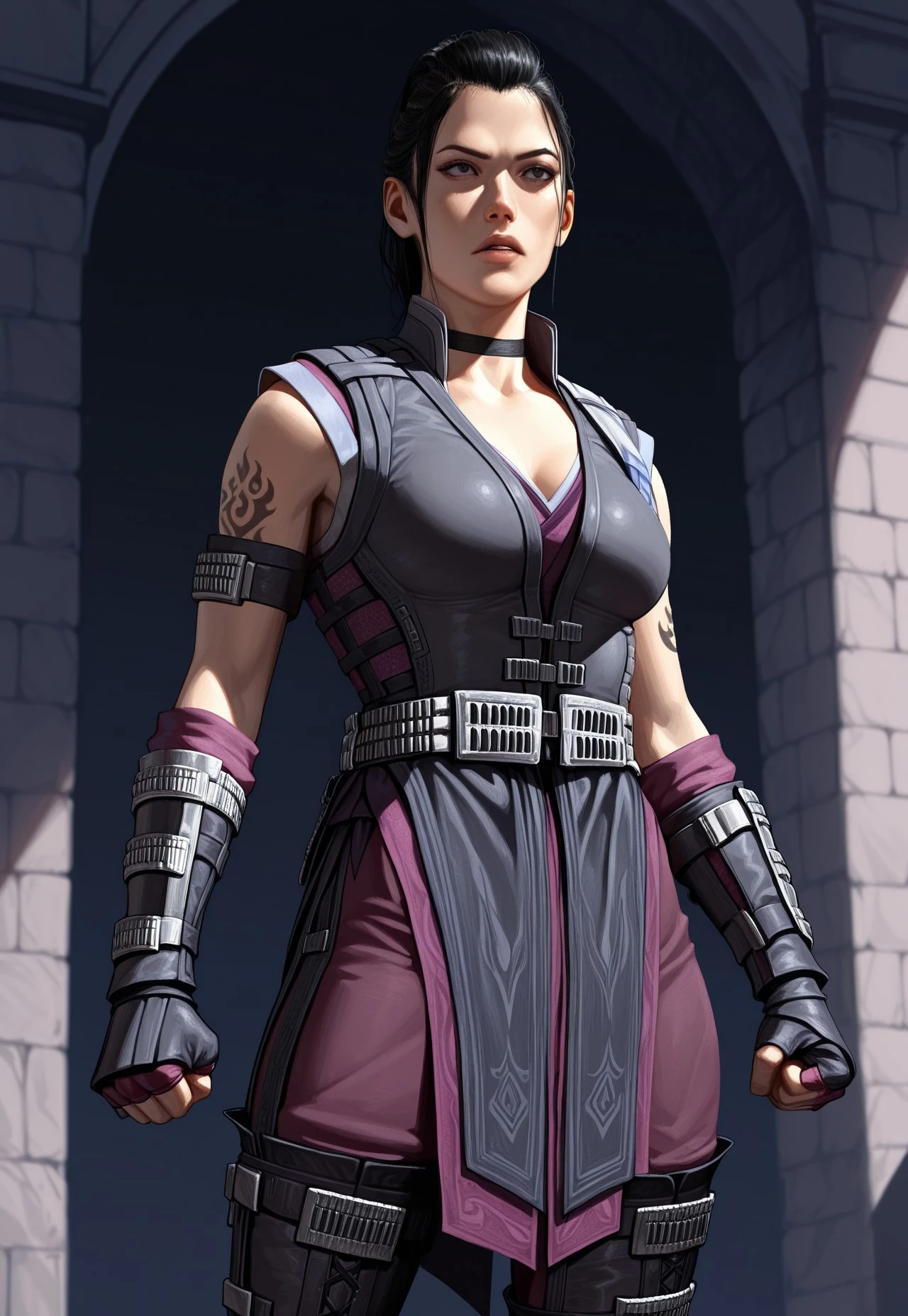 black choker, sleeveless robe, leather vest, metallic belt, pelvic curtain, pants, elbow gloves, fingerless gloves, vambraces, leather leg armor, toeless footwear, armlet,