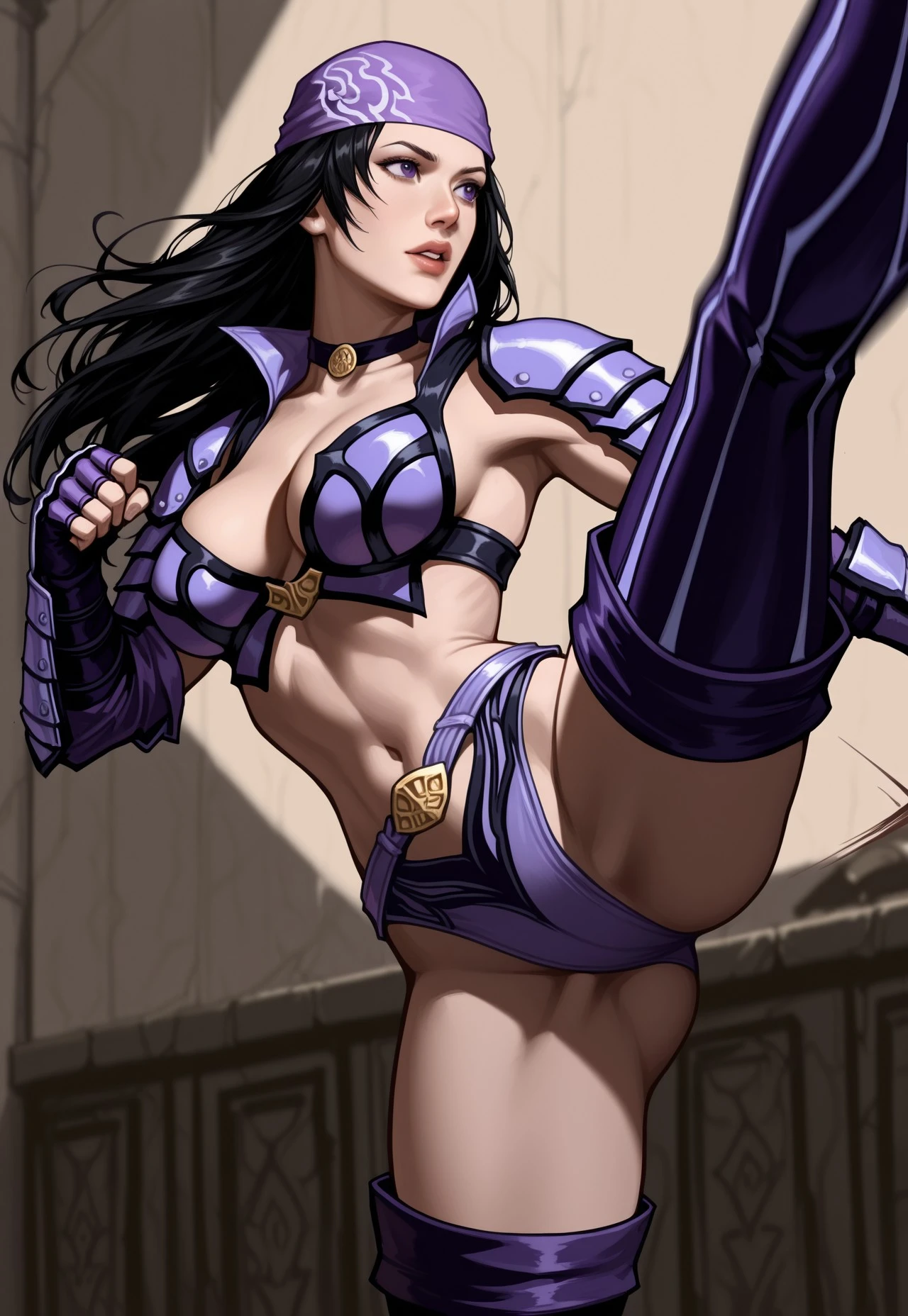 purple bandana, choker, bikini armor, shoulder armor, gauntlets, fingerless gloves, thigh boots,