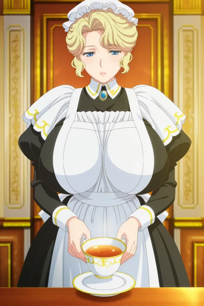 1girl, Maria (Victorian Maid Maria no Houshi), blonde_hair, blue_eyes, lips, glossy_lips, massive_, Victorian Maid Maria no Houshi_art_style, 4k, HD, Hi-Res, No-Flaws, excellent_quality