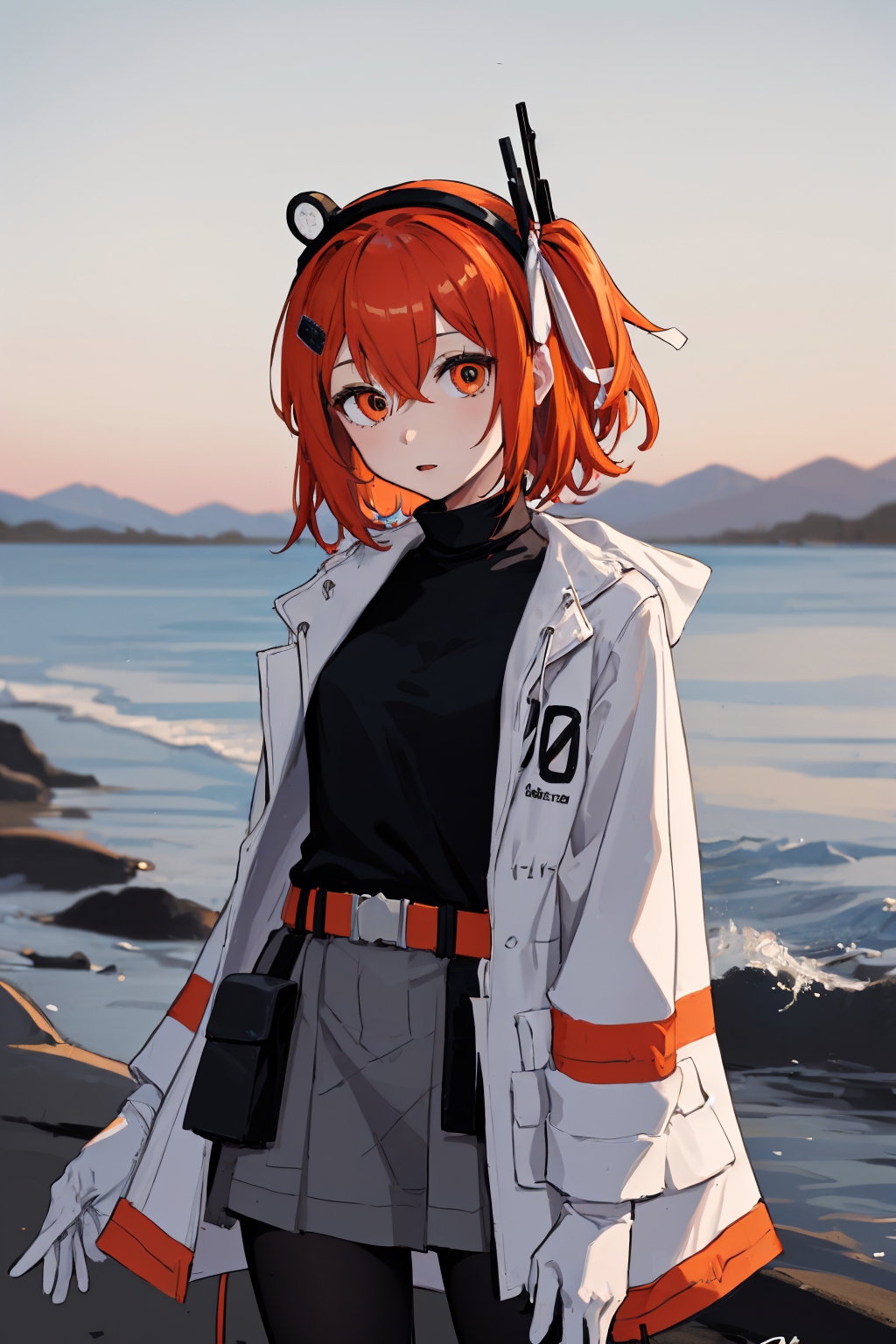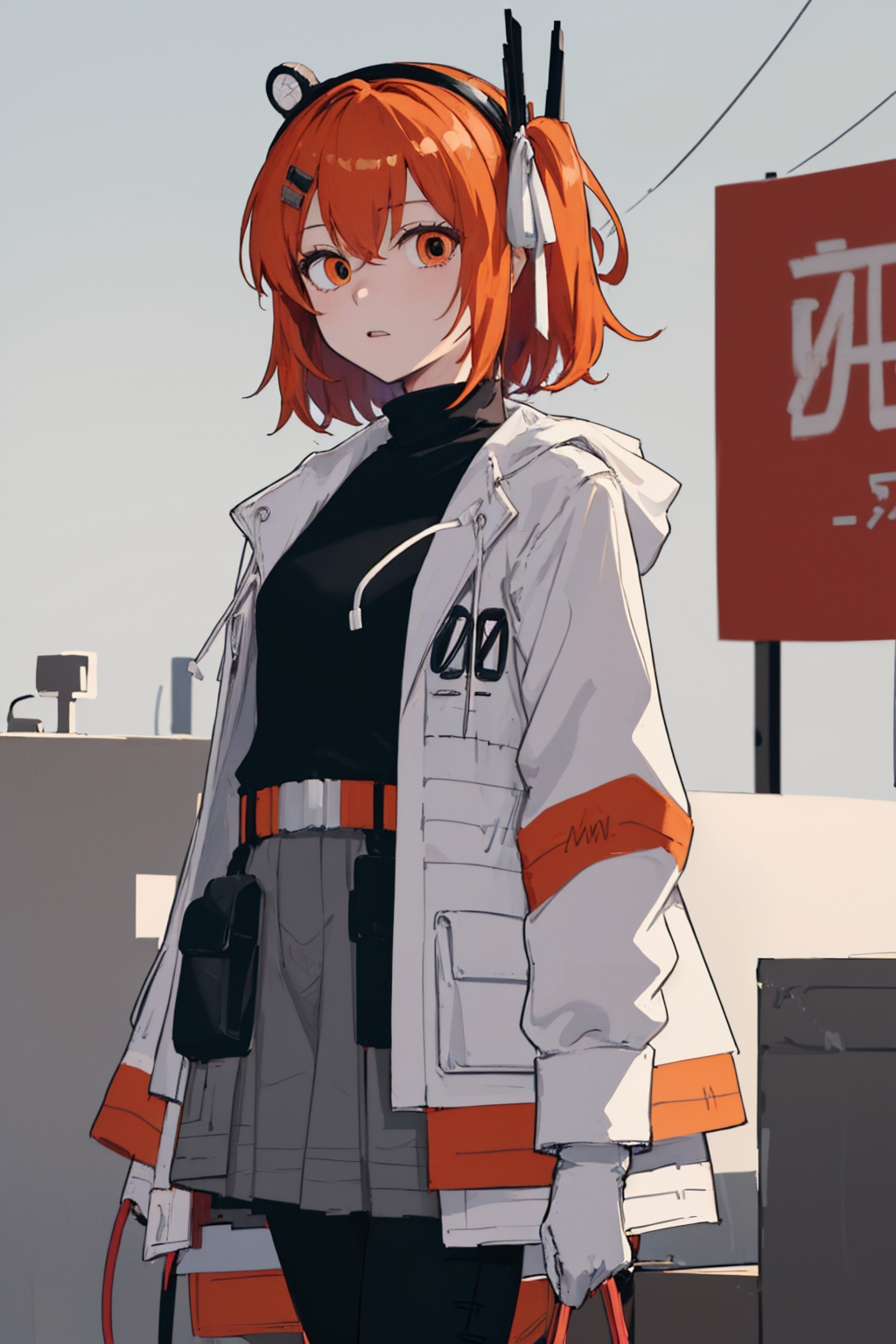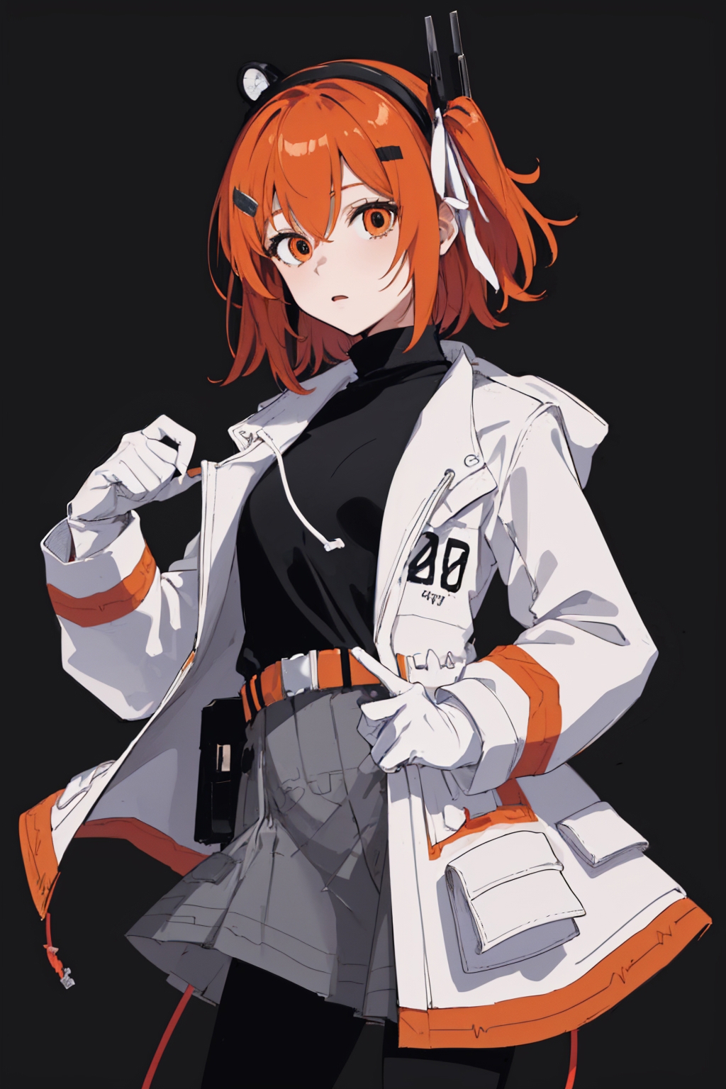 Default Outfit: white jacket, open jacket, black shirt, turtleneck, long sleeves, white gloves, grey skirt, black leggings, utility belt
