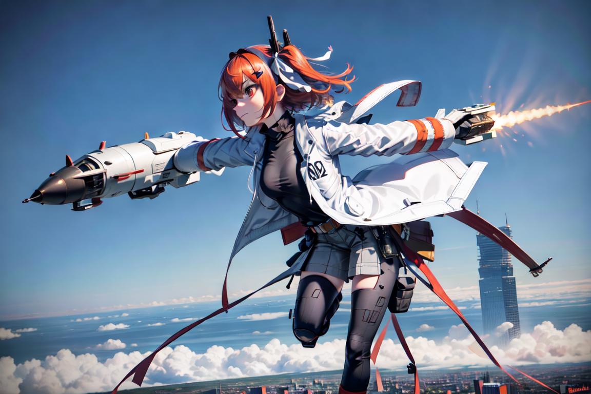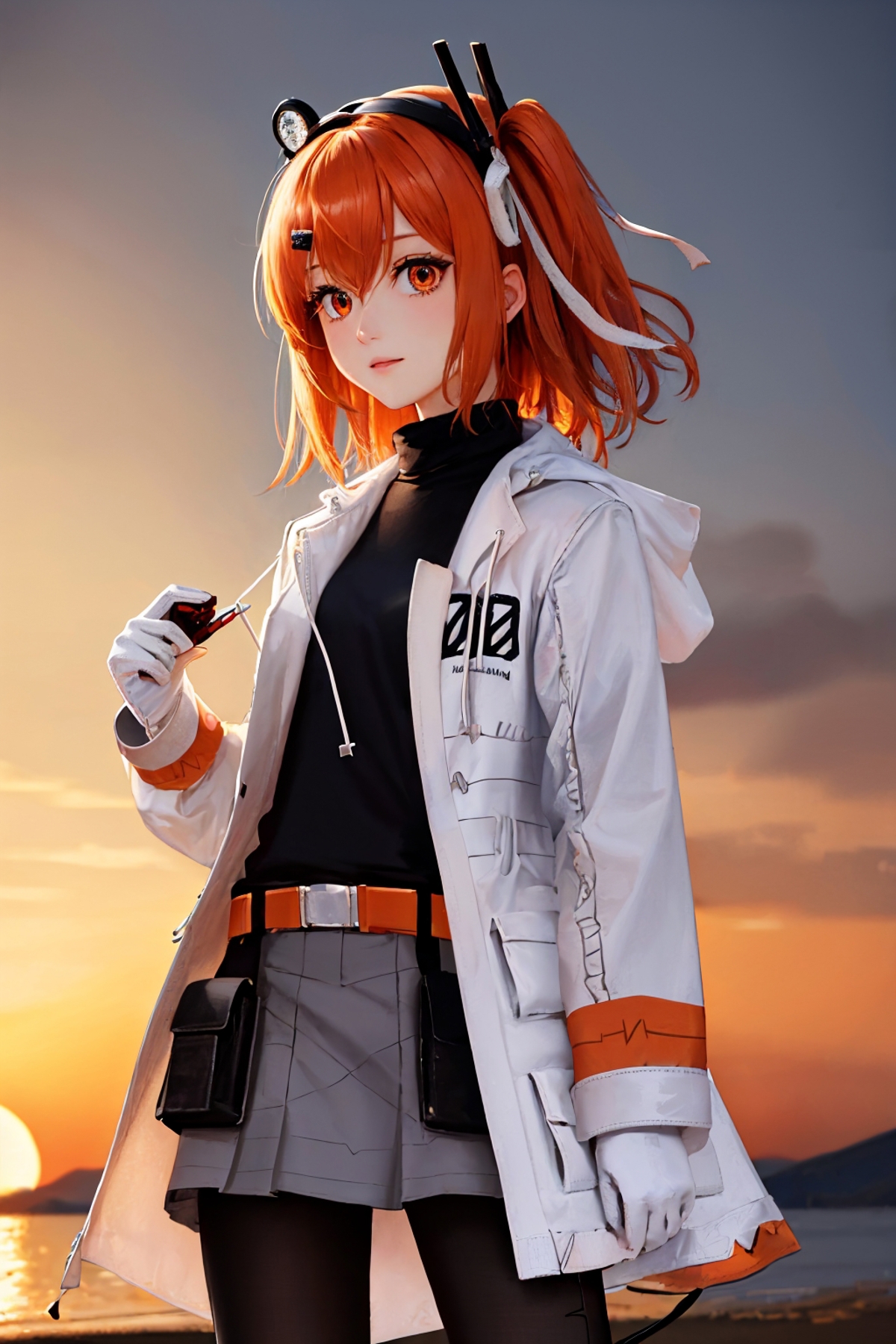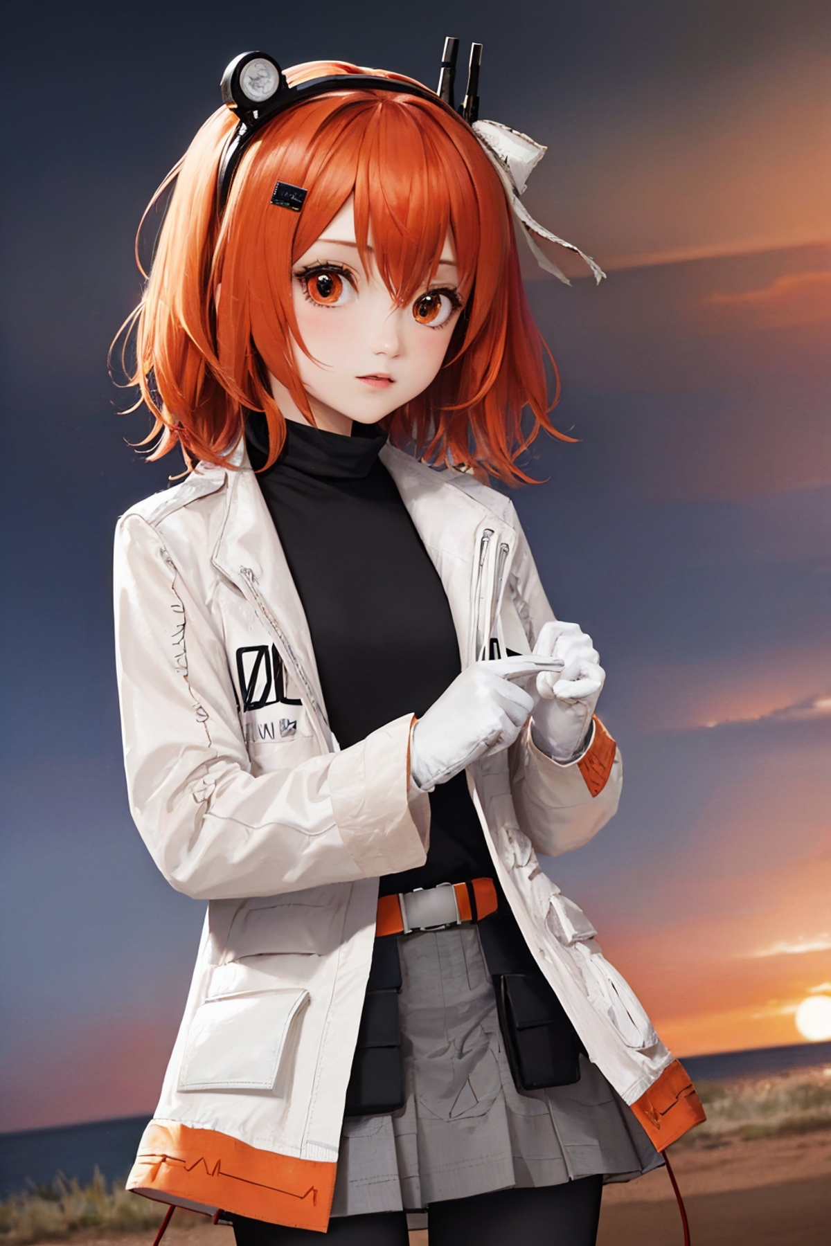 Default Outfit: white jacket, open jacket, black shirt, turtleneck, long sleeves, white gloves, grey skirt, black leggings, utility belt