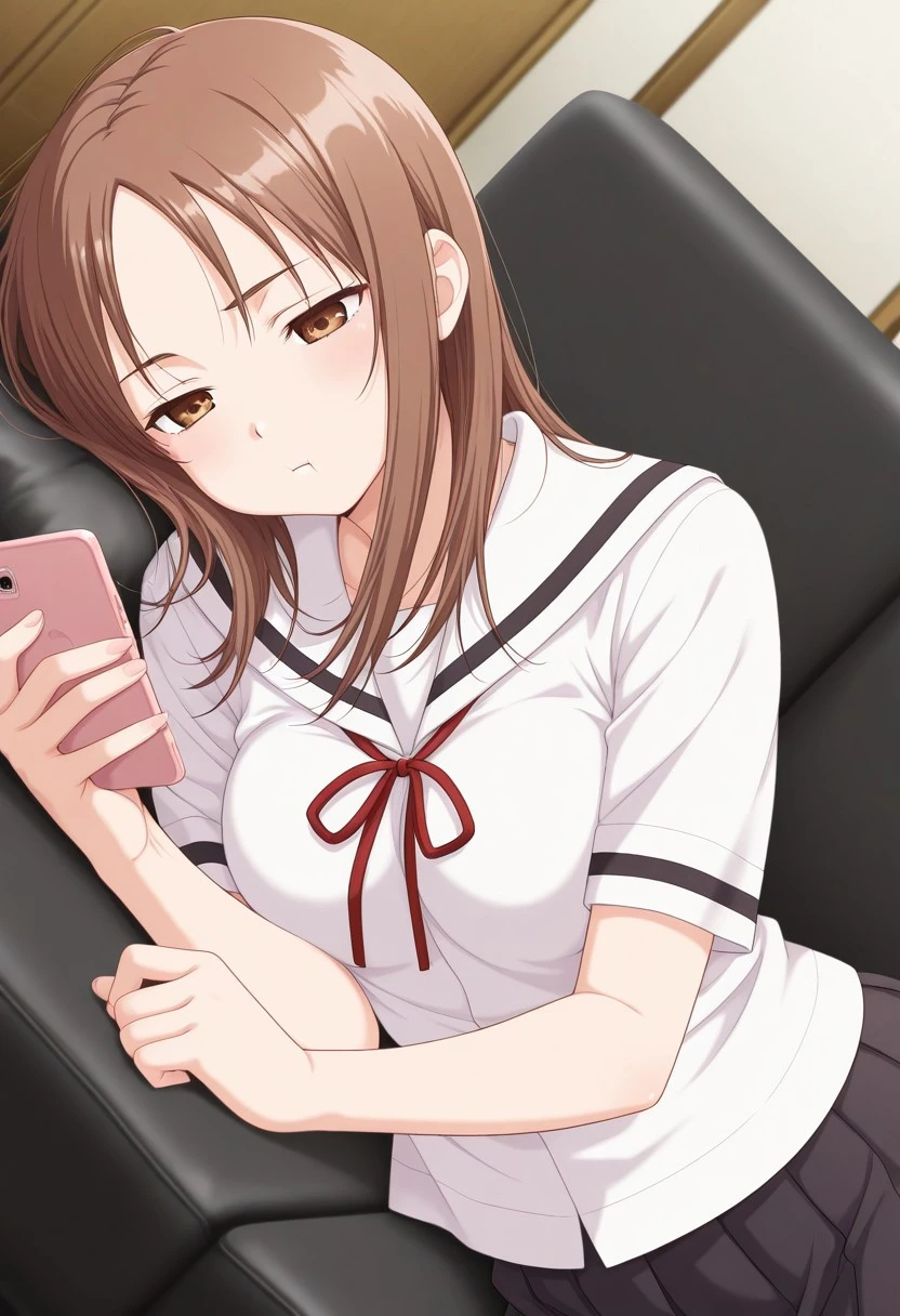 Ayakawa Haruki,brown hair,hair parted in middle, long hair, spiky bangs, brown eyes,medium breasts