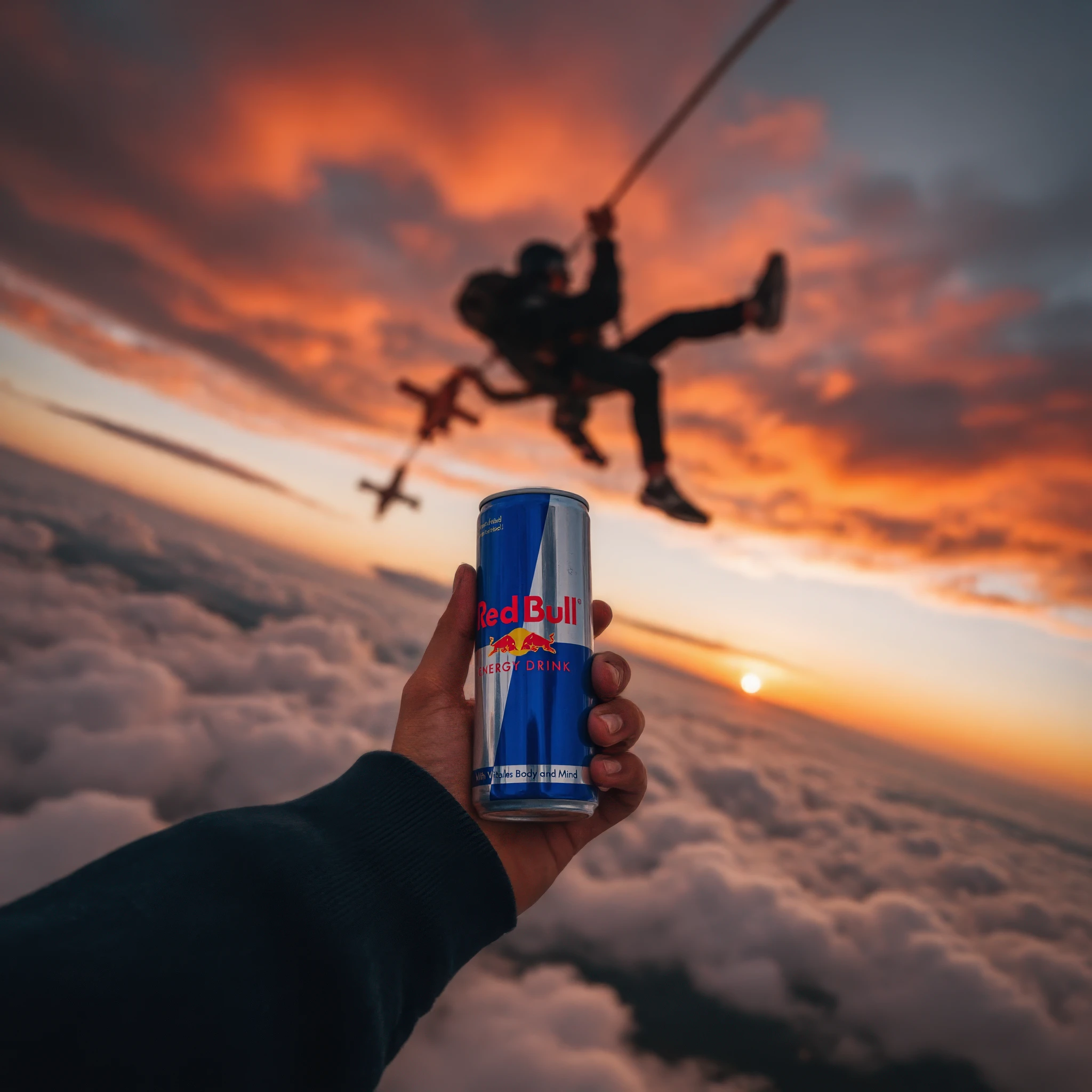 POV of A fearless skydiver free falling, soaring through a breathtaking sunset, a redbulldrink can clutched tightly in their hand. The sky is ablaze with vibrant colors, as the sun dips below the horizon. another diver's silhouette is sharply defined against the fiery sky, creating a dramatic contrast. adrenaline, and the thrill of extreme sports.