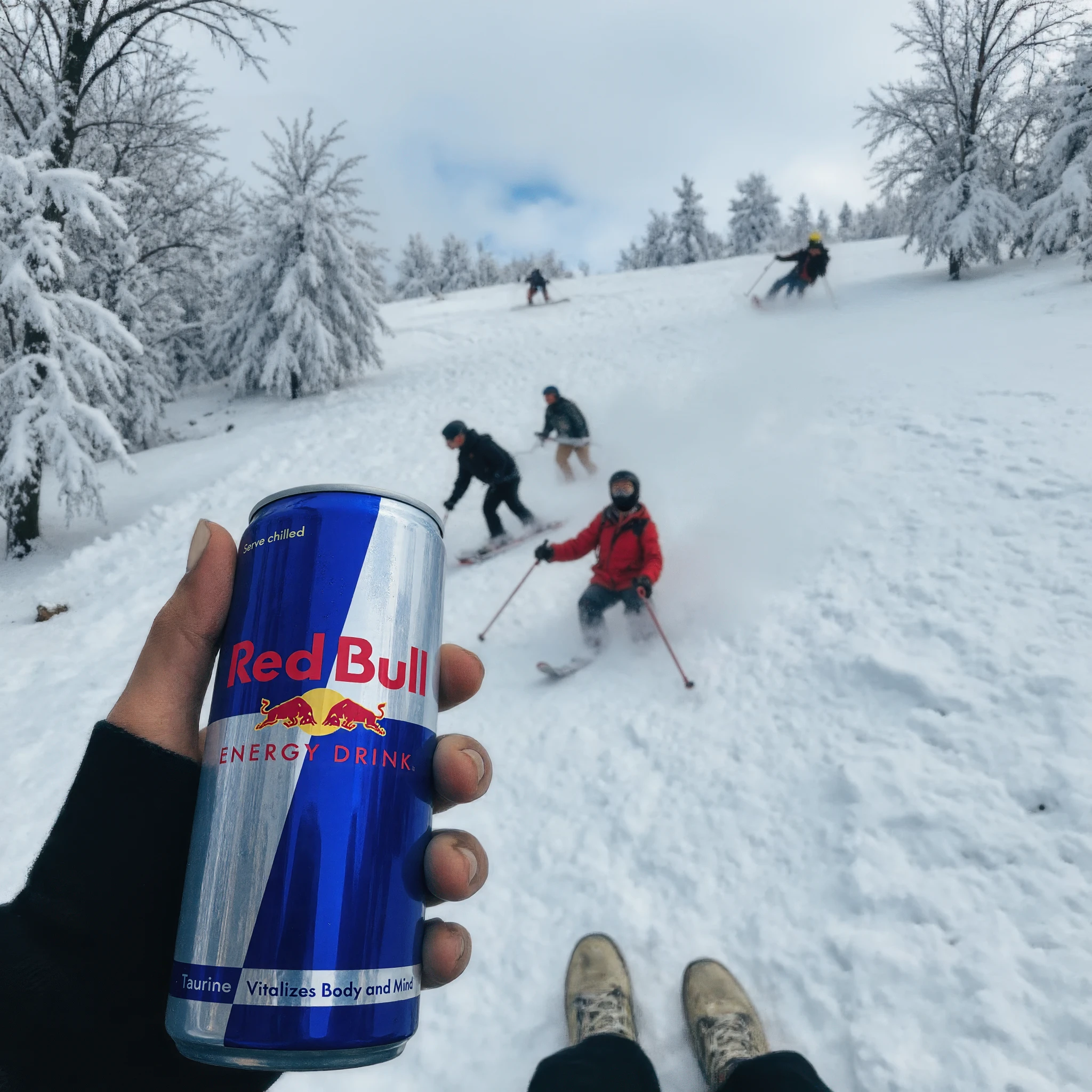 wide angle photo of A fearless person zooming down through the snowy mountains, he is holding an open redbulldrink can. people are skiing whose silhouette is sharply defined, creating a dramatic contrast. adrenaline, fear and the thrill of extreme sports. motion blur, avalanche chasing them, cinematic action scene