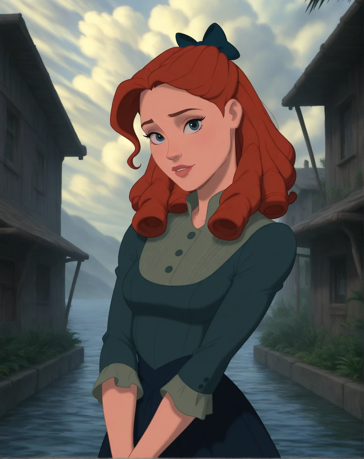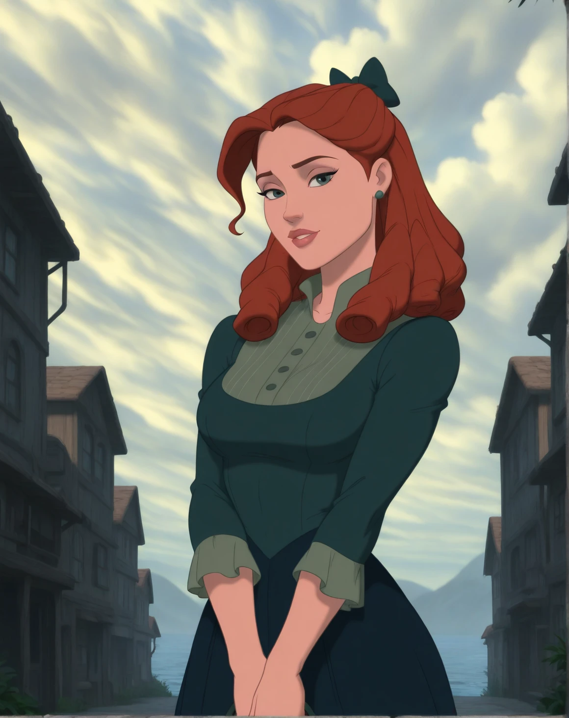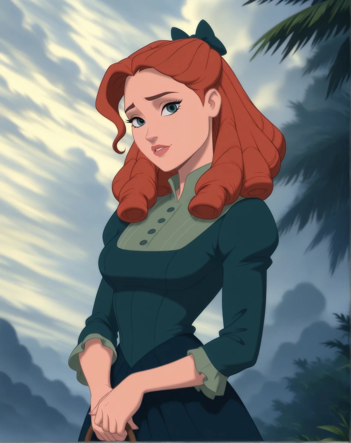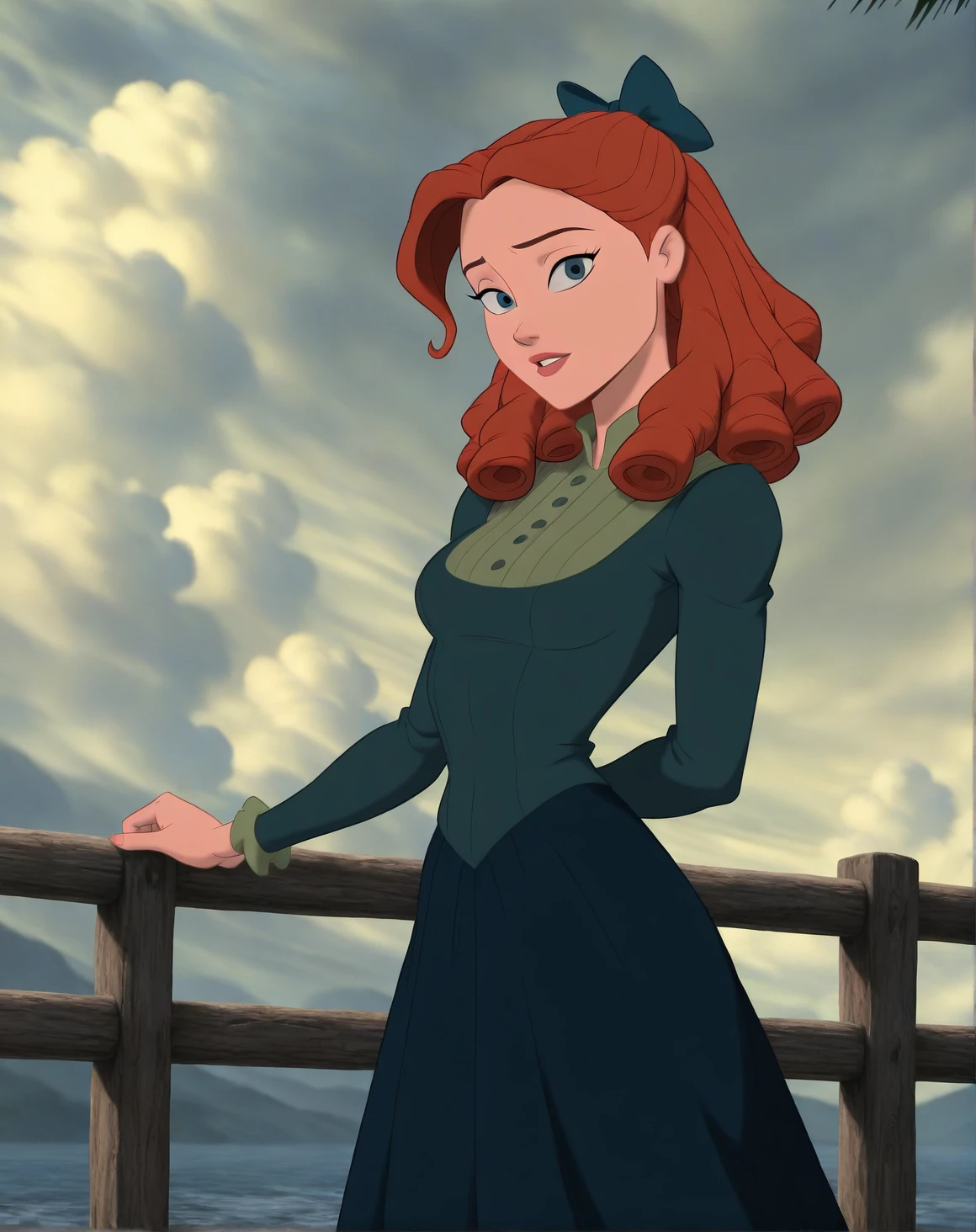 masterpiece, absurdres, best quality, 1girl, solo, shirt, dress, outdoors, bow, long sleeves, hair bow, cloud, Tarzan_mom, red hair, looking at viewer, 2d animation, digital drawing \(artwork\), flat colors, toon \(style\),