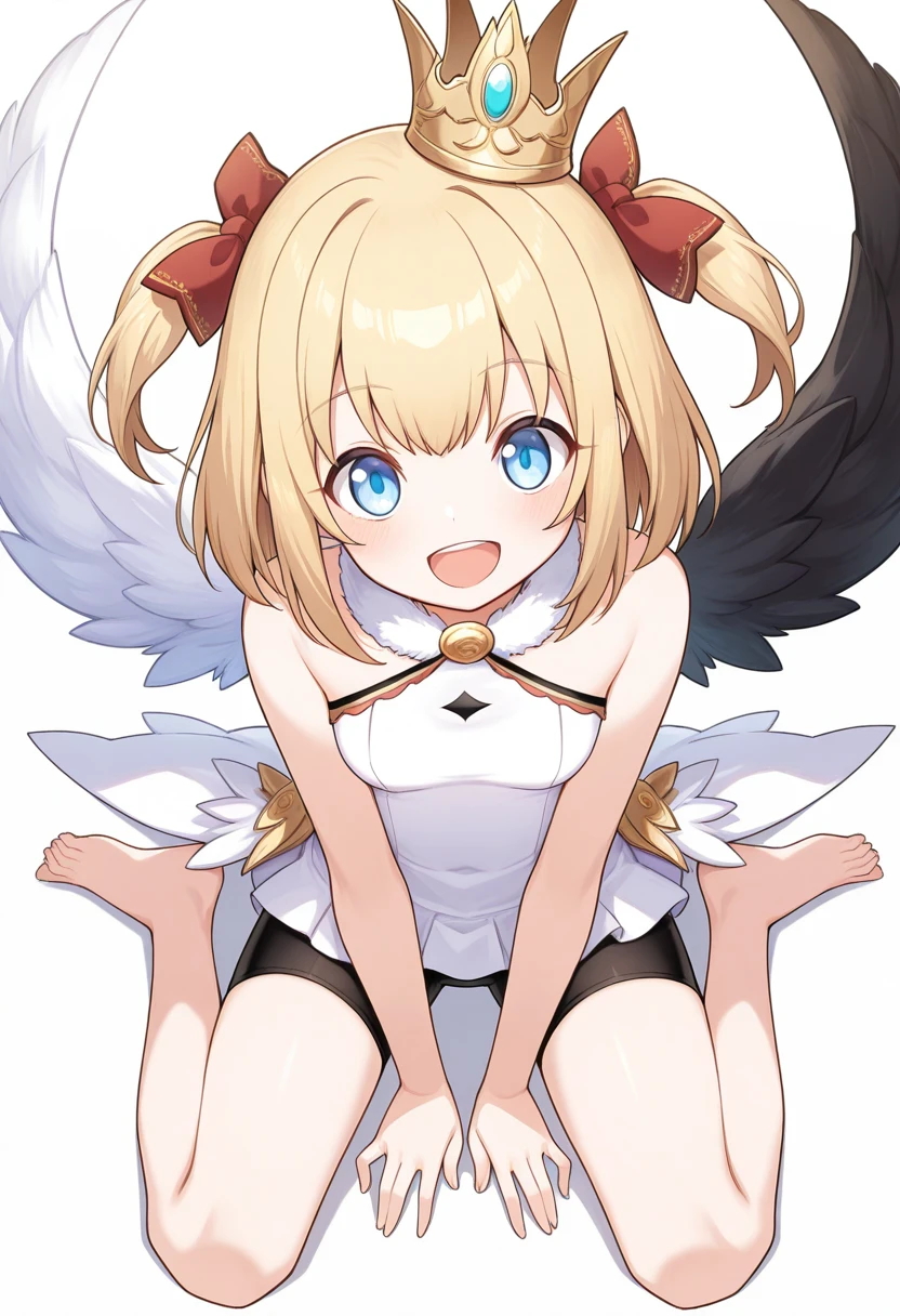 mini crown, elbow gloves, gauntlets, bow, bare shoulders, white dress, black shorts