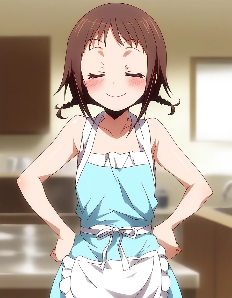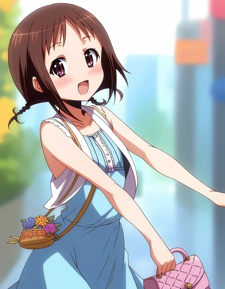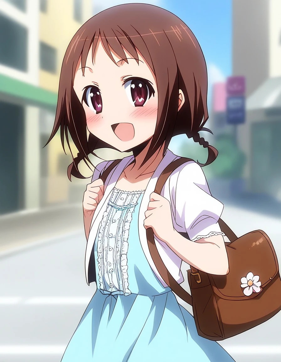 Wakana_Misato, brown hair, short hair, twin braids, purple eyes, short stack,