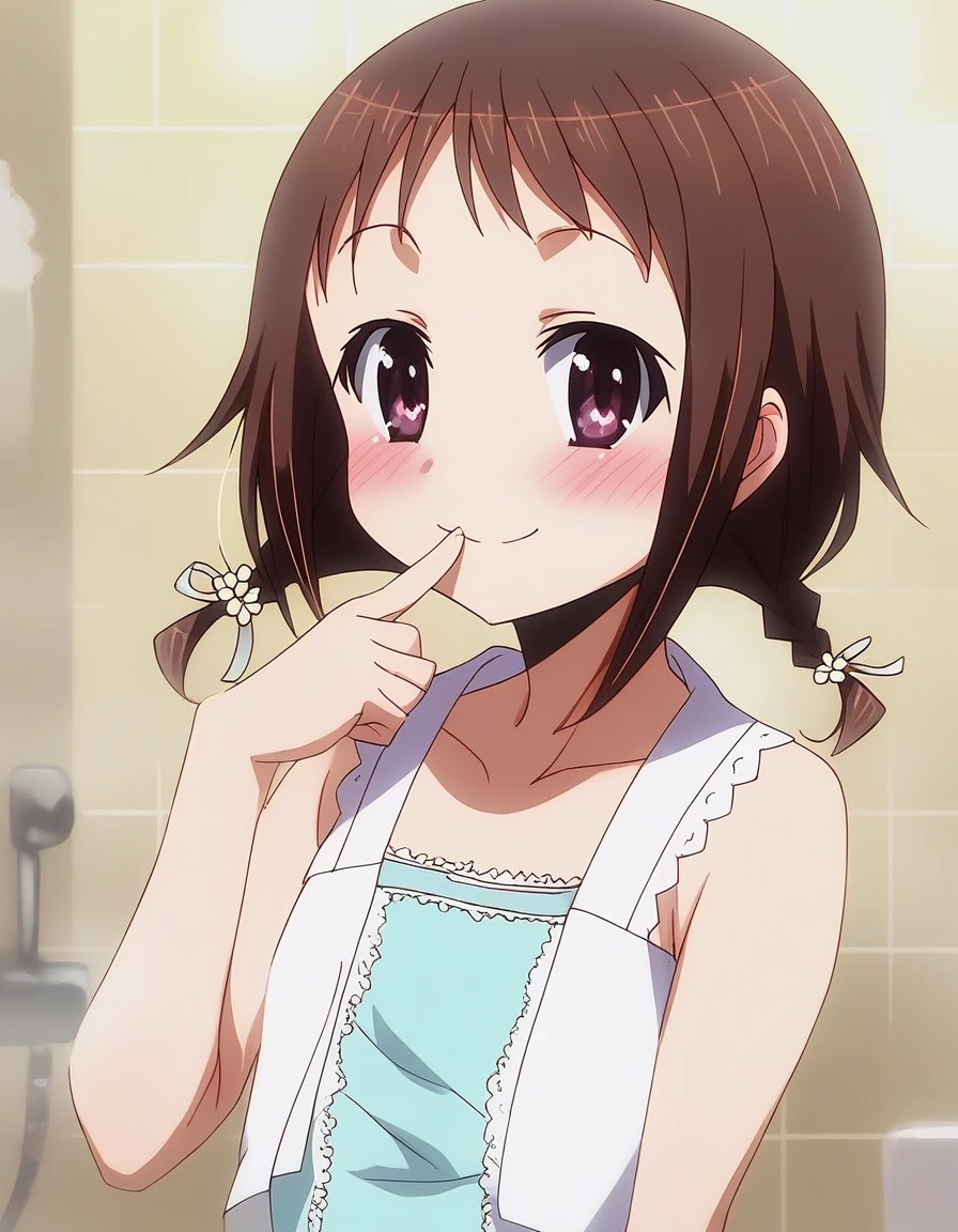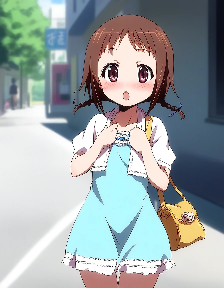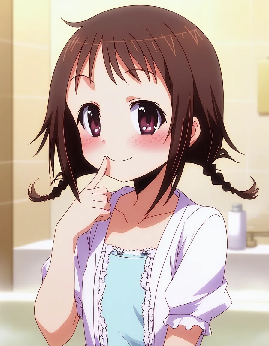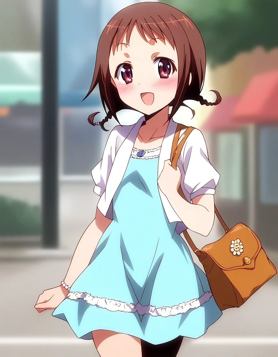 Wakana_Misato, brown hair, short hair, twin braids, purple eyes, short stack,