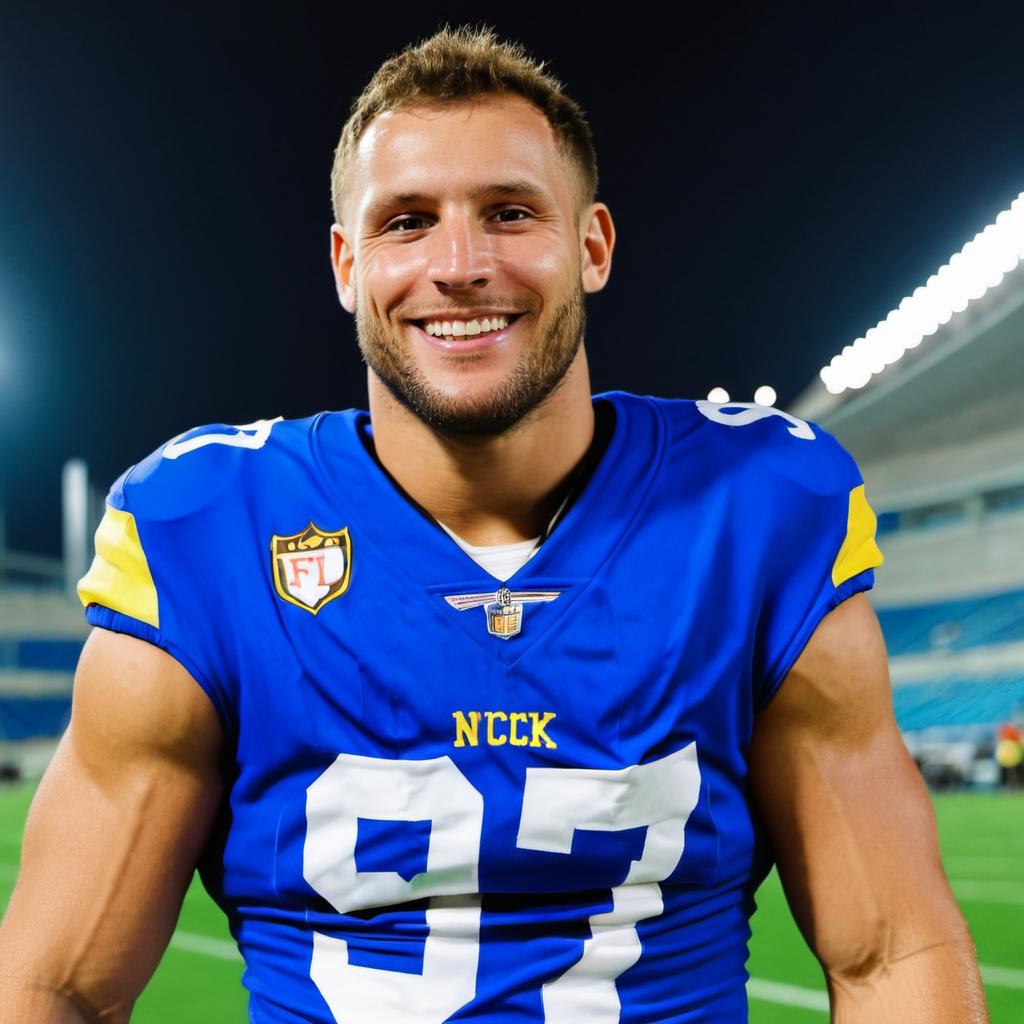 Disappointed with the results so I'm going to retrain in a few days, had to scrap some images plus didn't realize I had multiple duplicates. Trained on 78 images of Nick Bosa. I recommend a strength of 0.9, 0.8 for more flexibility, 1 for more likeness. The trigger word is n1ck but there are also some more that can be triggered, like "short hair", "athlete", and some other ones I've already forgotten lol. Keep clip skip at 1. You can use the negative prompts I used in the preview images if needed. Juggernaut V7 was used to make the preview images. This lora was trained on SDXL base.