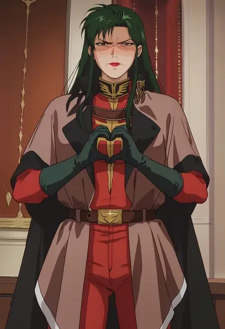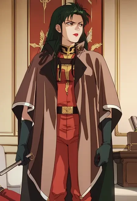 cape, military uniform, black gloves, belt, red pants, black boots,