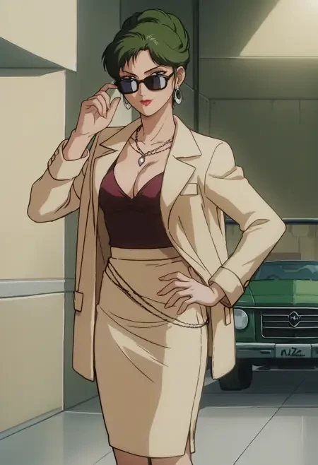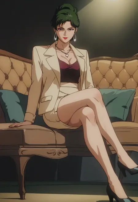 pearl necklace, hoop earrings, beige jacket, red camisole, cleavage, beige skirt, pencil skirt, black high heels,