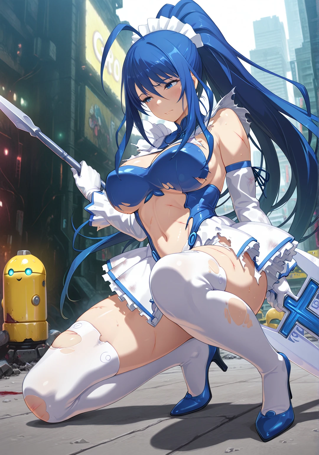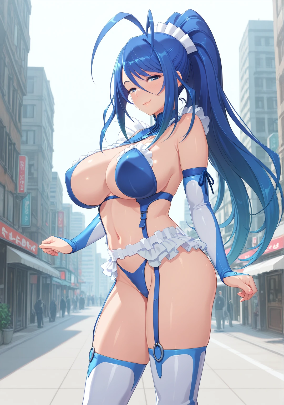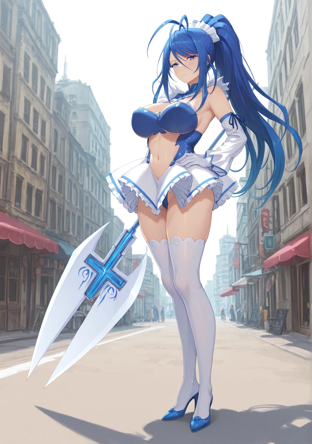 Suit1: henshin_outfit, large breasts, clothing cutout, leotard, navel, white skirt, detached sleeves, white gloves, white thighhighs, blue high heels,