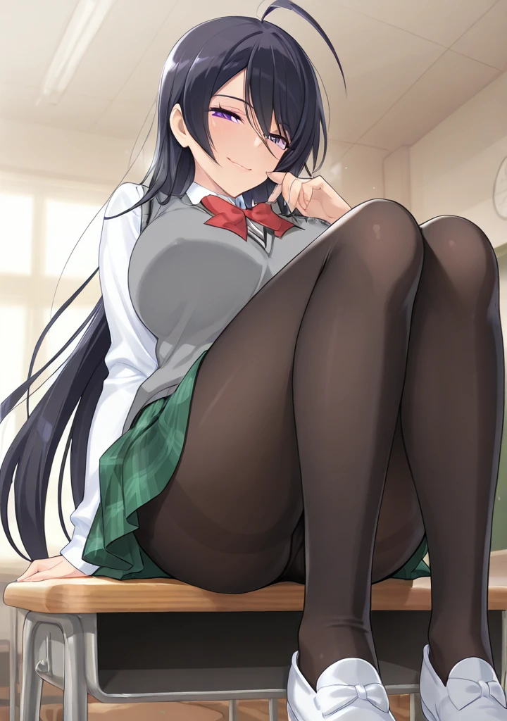 Uniform: green skirt, school uniform, plaid skirt, short sleeves, gray sweater vest, bow, shoes, black pantyhose,