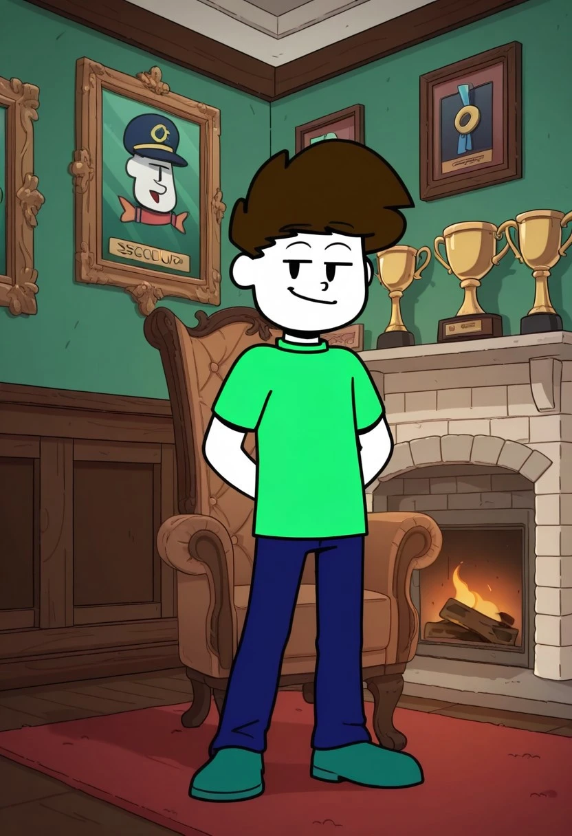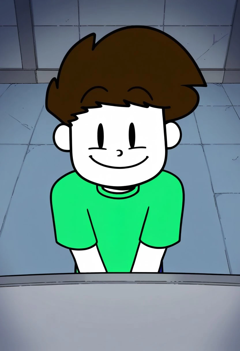 Infamous Swoosh, 1boy, solo, pale white skin, brown hair, black eyes, green shirt, blue pants, green shoes