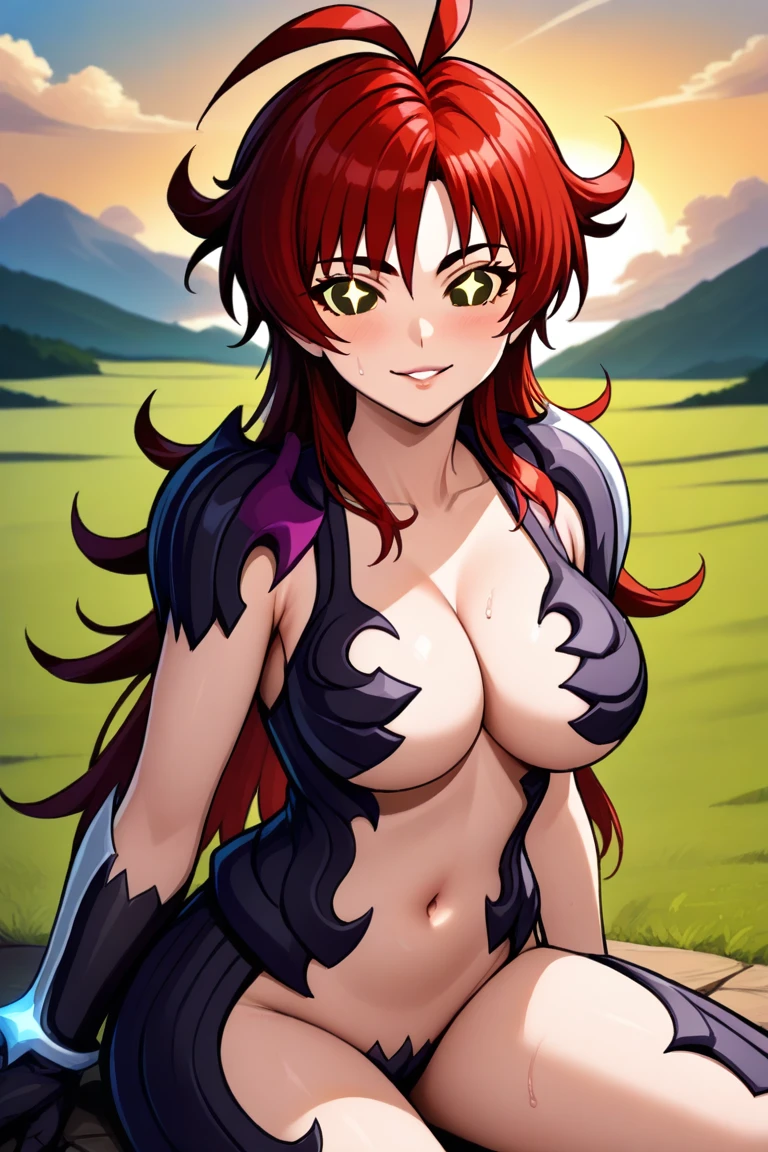 1girl, large breasts, yellow eyes, claws, colored sclera, black sclera, bikini armor, revealing clothes,