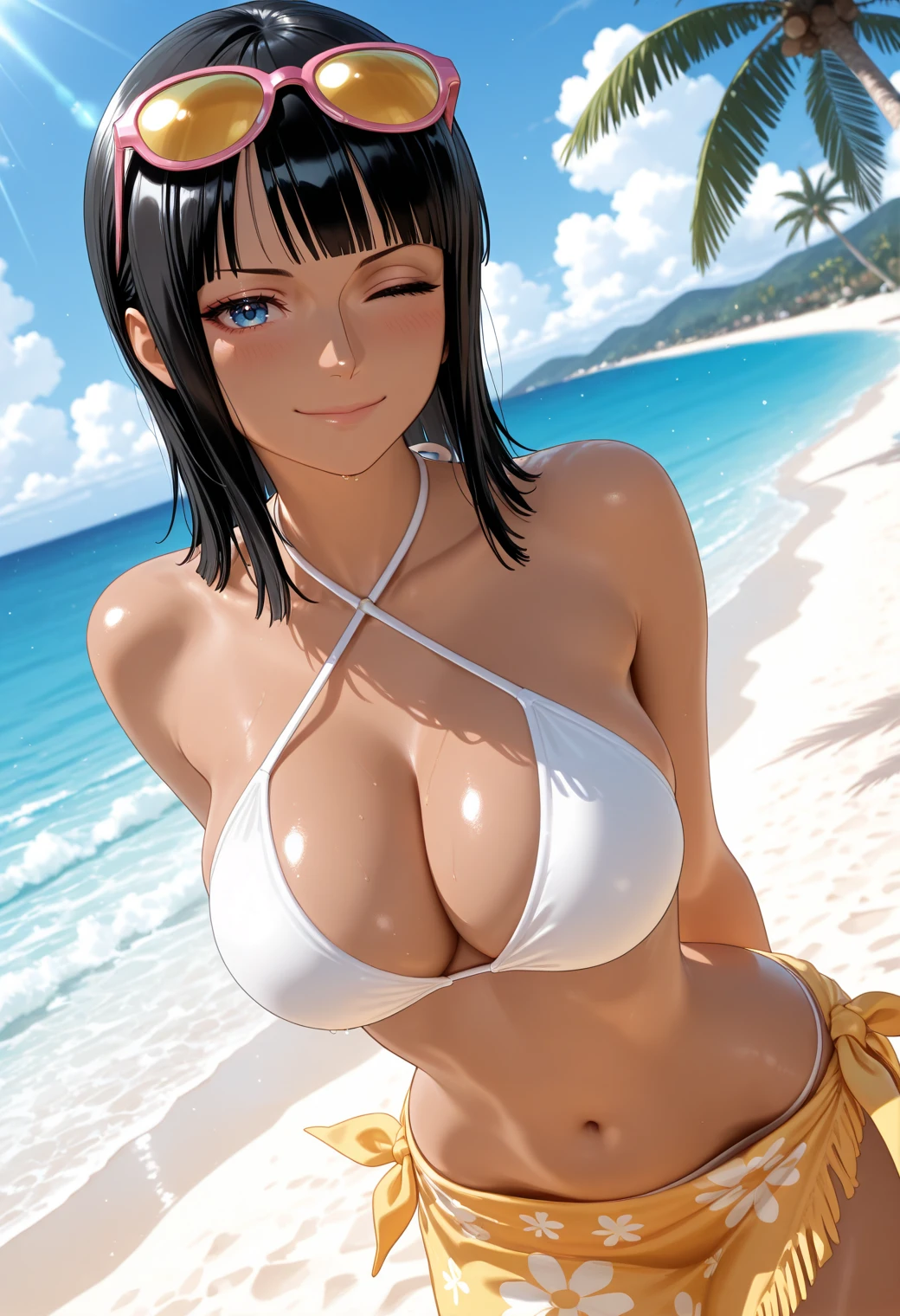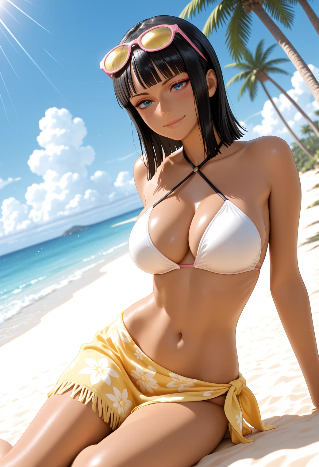 • Outfit: sunglasses, pink-framed eyewear, yellow tinted eyewear, eyewear on head, white bikini, criss-cross halterneck, collarbone, cleavage, navel, yellow sarong,