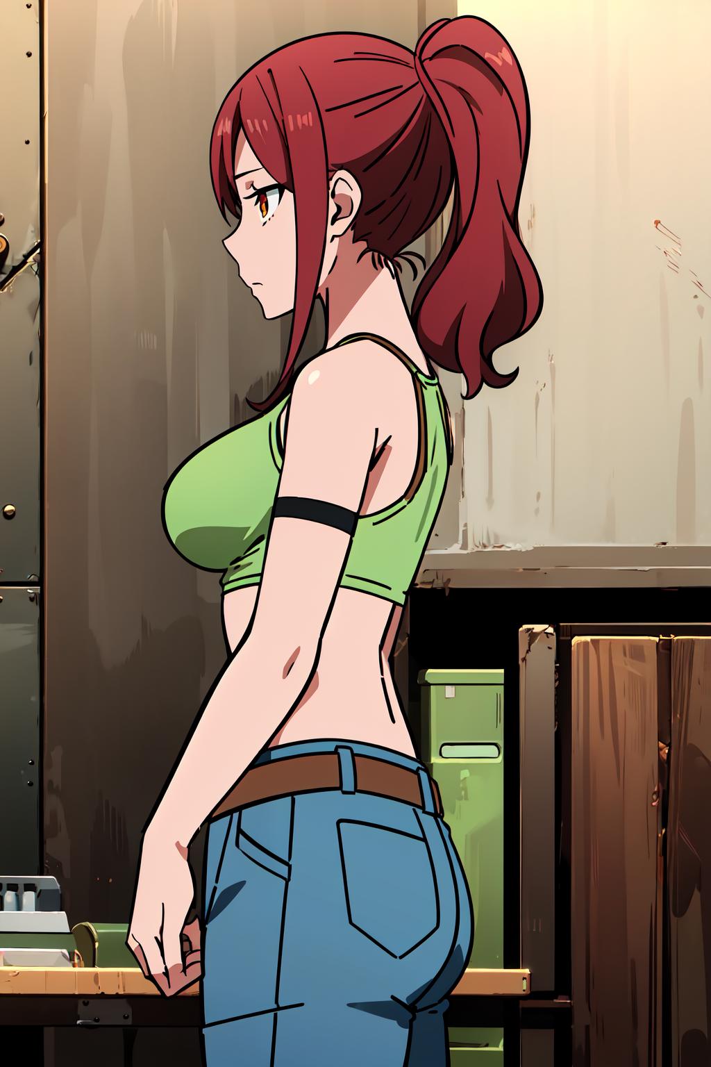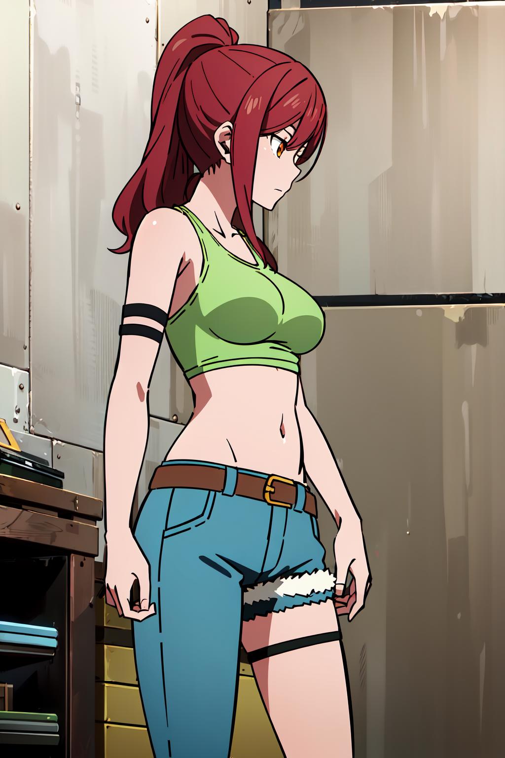 denim, asymmetrical clothes, single pantsleg, belt, pants, jeans, thigh strap,tank top, bare shoulders, armband, shirt, asymmetrical legwear