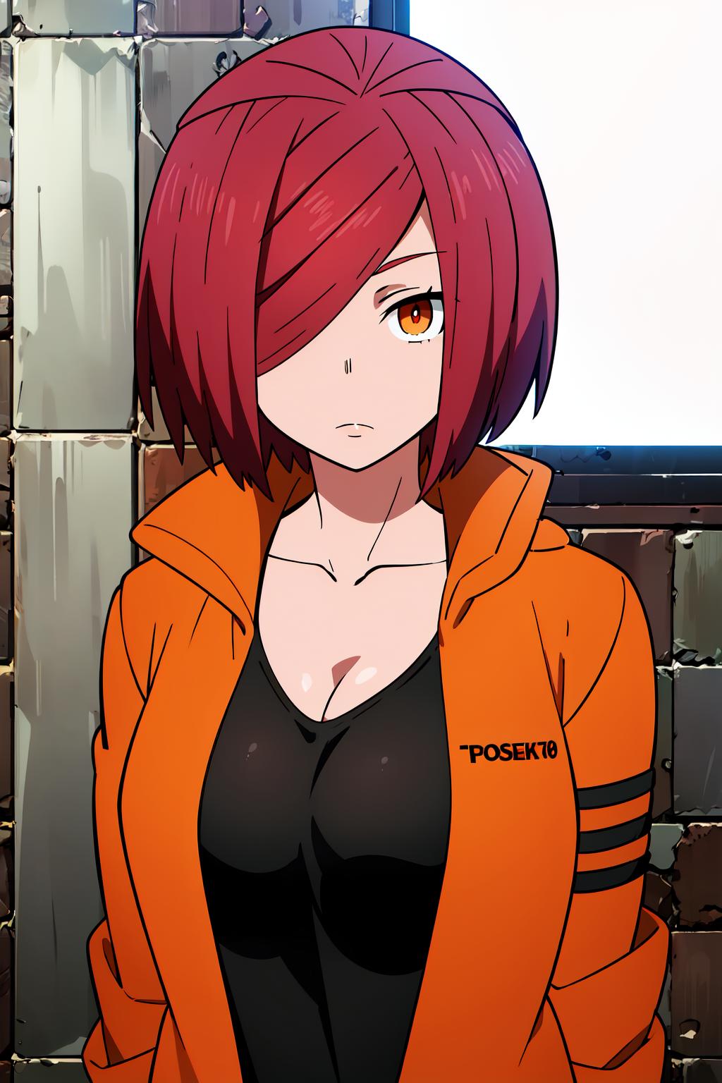 Lisa, red hair, swept bangs, long hair, brown eyes, bangs, orange eyes