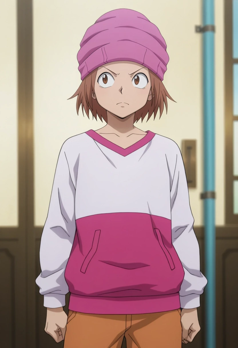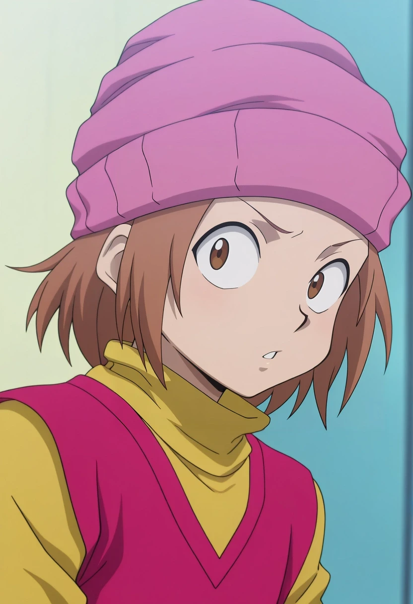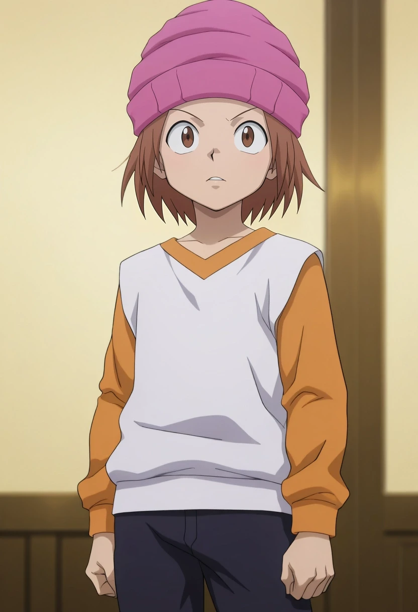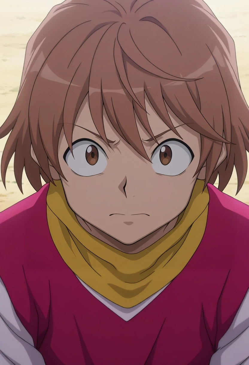 yellow scarf, white shirt, red vest, purple belt, white pants