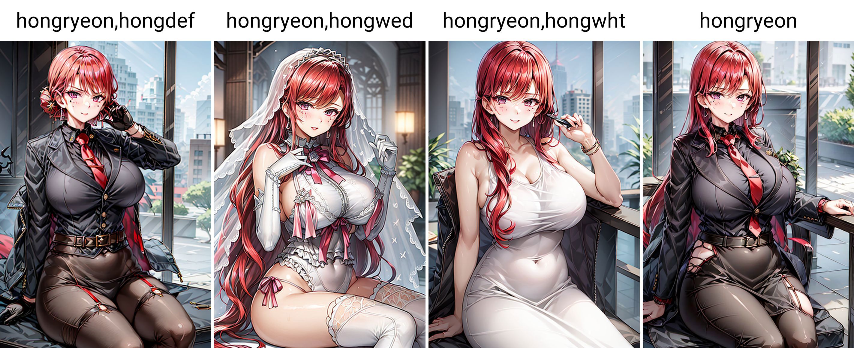 3 + 1 outfits (triggers in parantheses are optional, --n signifies negatives):