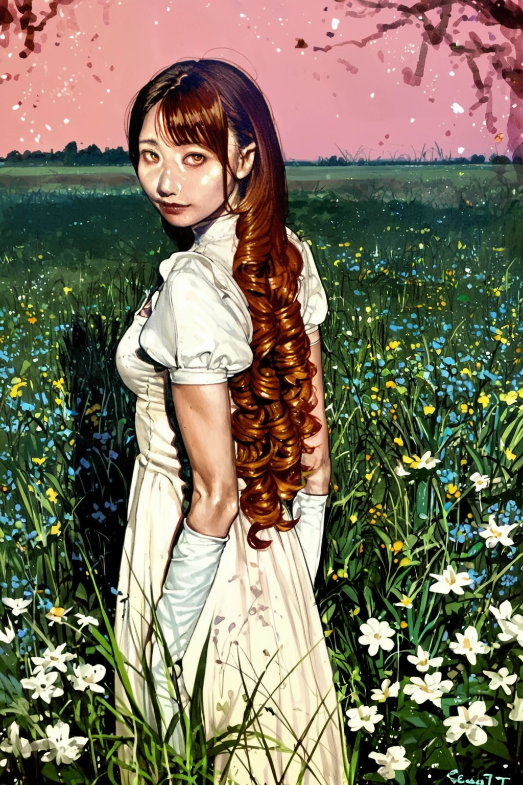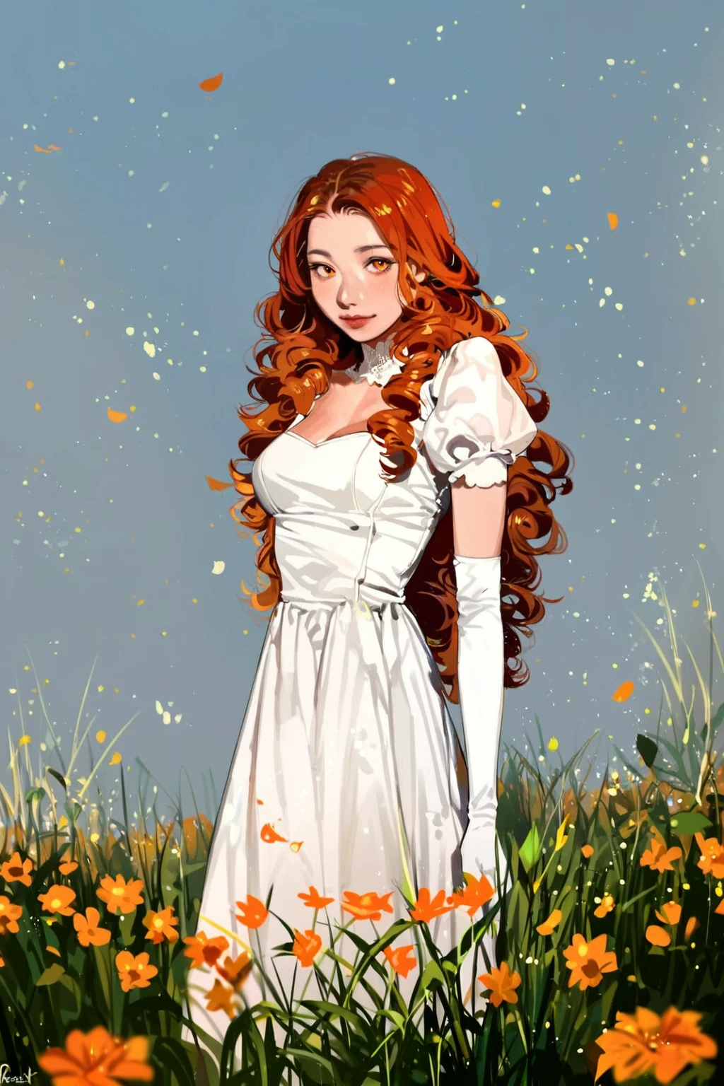 prompt for x/y: score_9, score_8_up, score_7_up, rating_safe, 1girl, solo, long hair, curly hair, wavy hair, orange hair, orange eyes, looking at viewer, breasts, dress, white dress, puffy sleeves, puffy short sleeves, short sleeves, gloves, elbow gloves, white gloves, cowboy shot, closed mouth, standing, outdoors, field, flower, grass, plant, sky, <lora:choo:LORA>