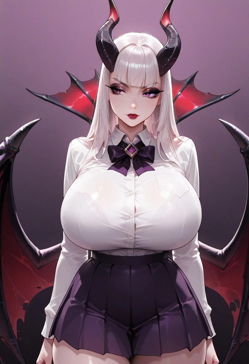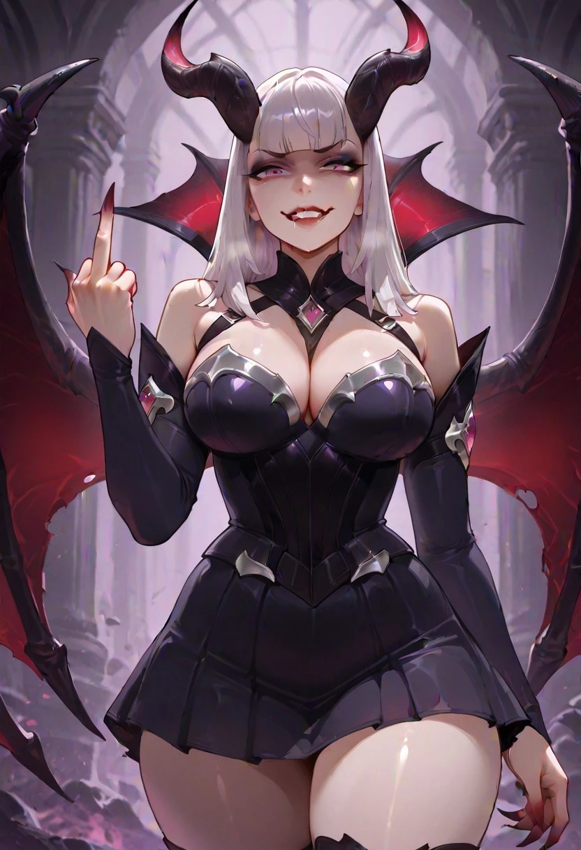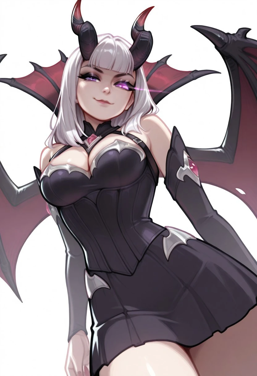 1girl, alice_mlbb, demon girl, succubus, light pink hair, long hair, straight hair, blunt bangs, pale skin, purple eyes, eyeshadow, lipstick, horns, demon horns, red tipped horns,