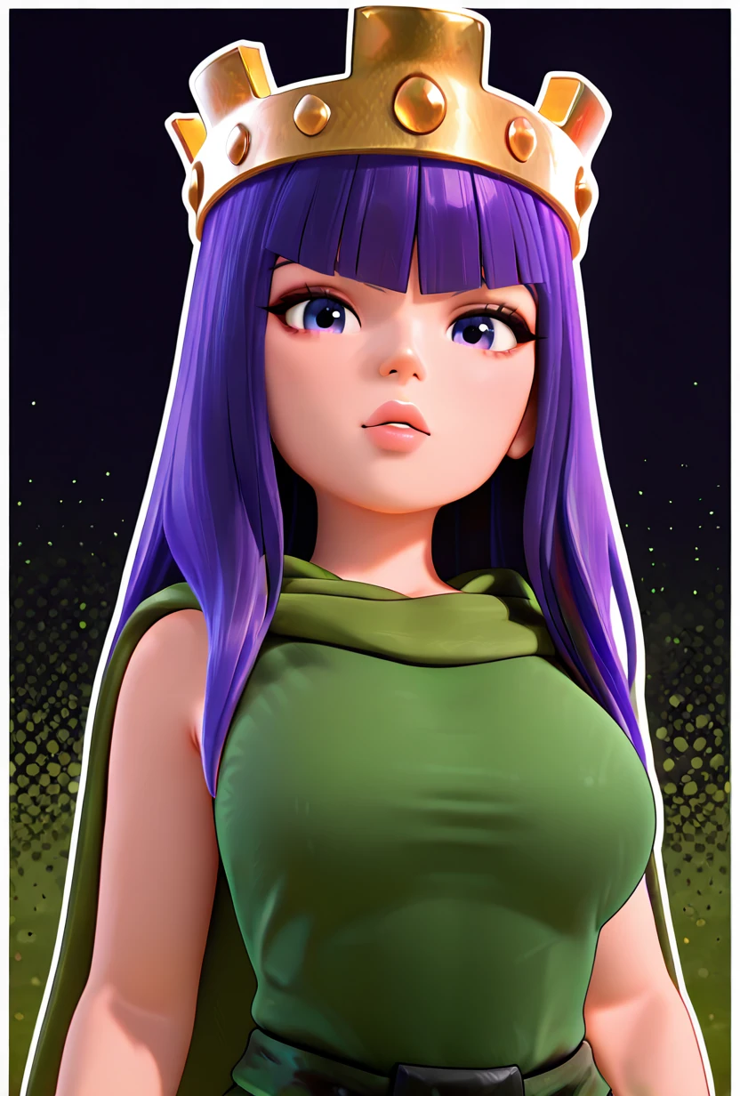 acherqueen3d, 1girl, long hair, breasts, purple hair, blunt bangs, crown, green cape, solo, green dress, sleeveless, smile, 3d
