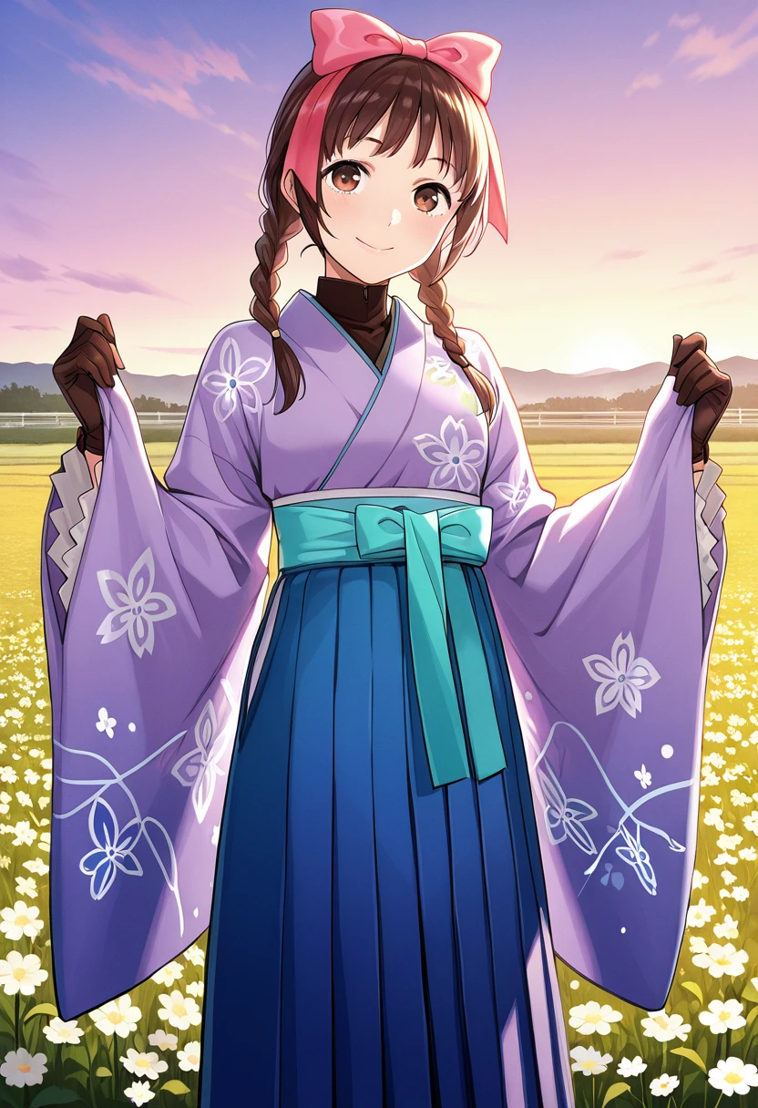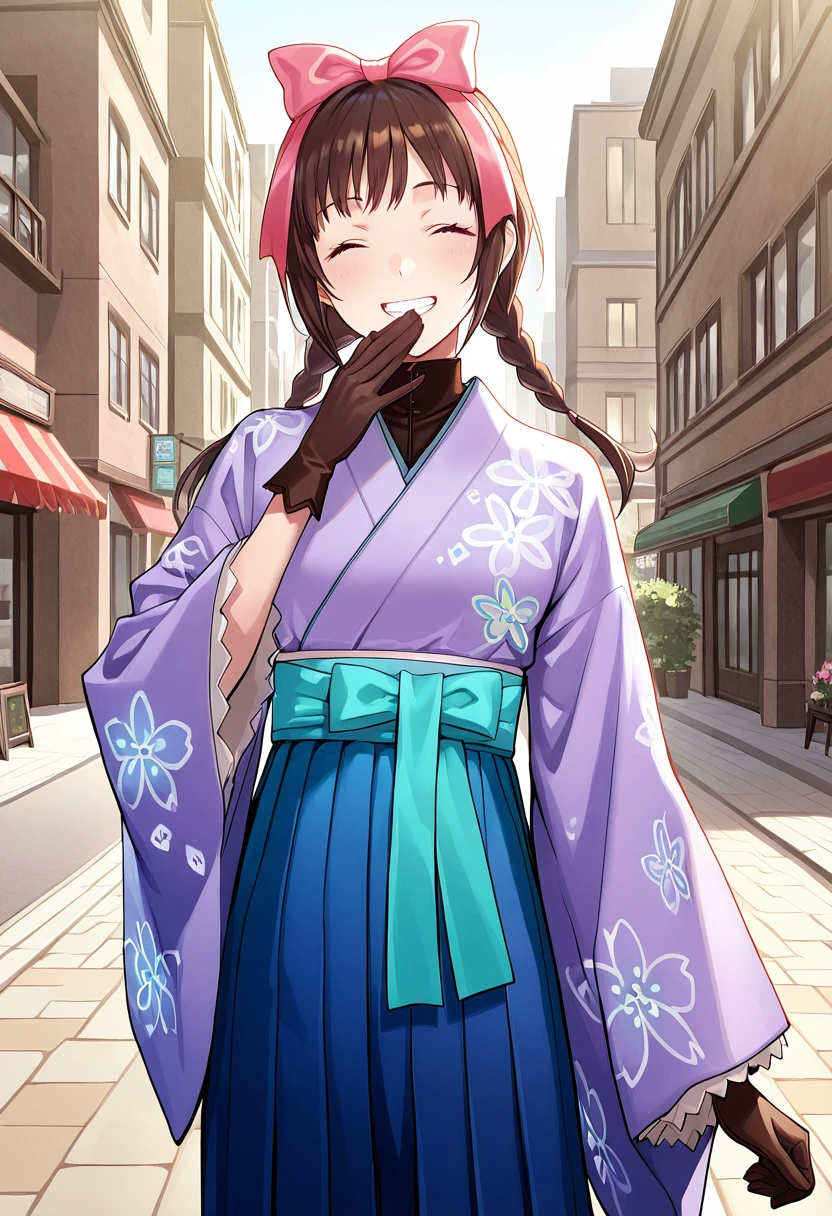 Trigger Words (Casual Outfit): ModernGirl, brown hair, brown eyes, pink bow, twin braids, low twintails, purple kimono, flower print kimono, brown gloves, brown turtleneck, aqua sash, blue hakama, flower print hakama, brown boots,