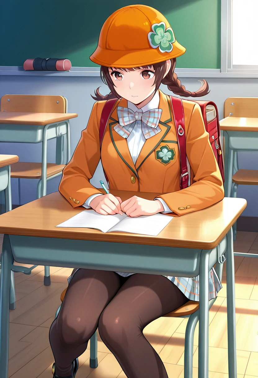 Trigger Words (School Uniform): SchoolLife, brown hair, brown eyes, orange hat, clover hat ornament, twin braids, low twintails, plaid bowtie, orange blazer, long sleeves, backpack, plaid skirt, brown pantyhose, black shoes, platform shoes,