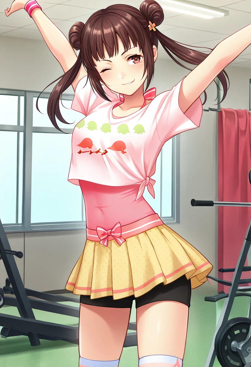 Trigger Words (Workout): LessonMode, brown hair, brown eyes, double bun, pigtails, hairclip, pink straps, pink neck bow, light pink shirt, cropped shirt, bird print shirt, pink undershirt, pink bracelets, yellow skirt, black shorts, white socks, pink shoes,