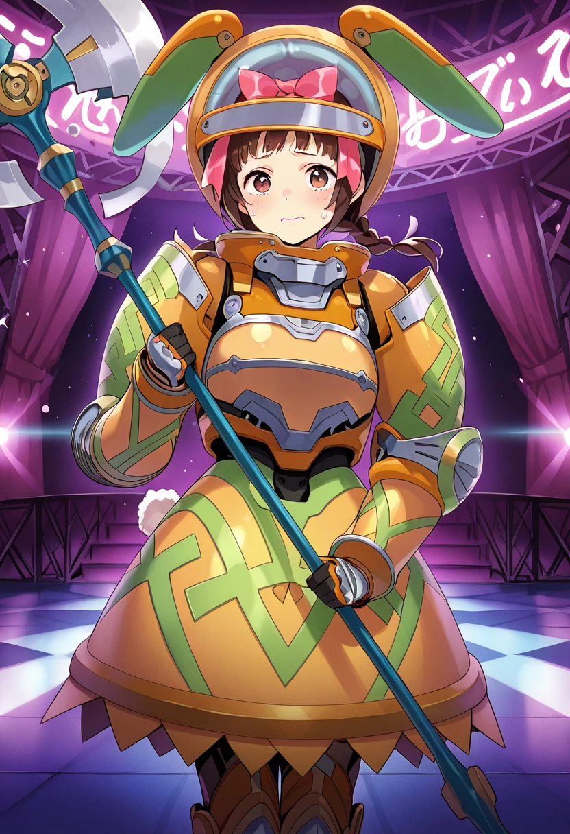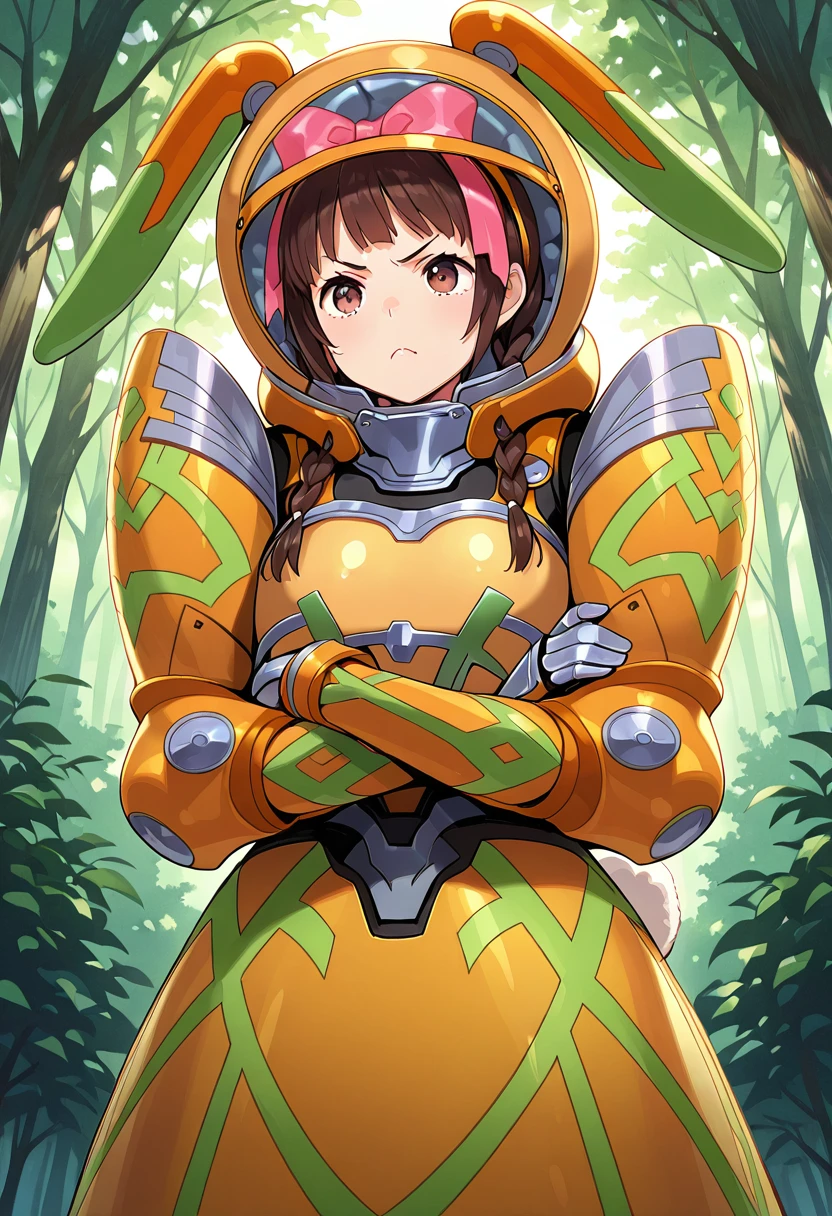 Trigger Words (Carnage Form): (CarnageForm:1.2), brown hair, brown eyes, pink bow, twin braids, low twintails, orange armor, green armor, full armor, helmet, fake ears, shoulder armor, gauntlets, gloves, orange breastplate, armored dress, large dress, bunny tail, armored boots, high heels, [Add 'frilled dress' to negatives]